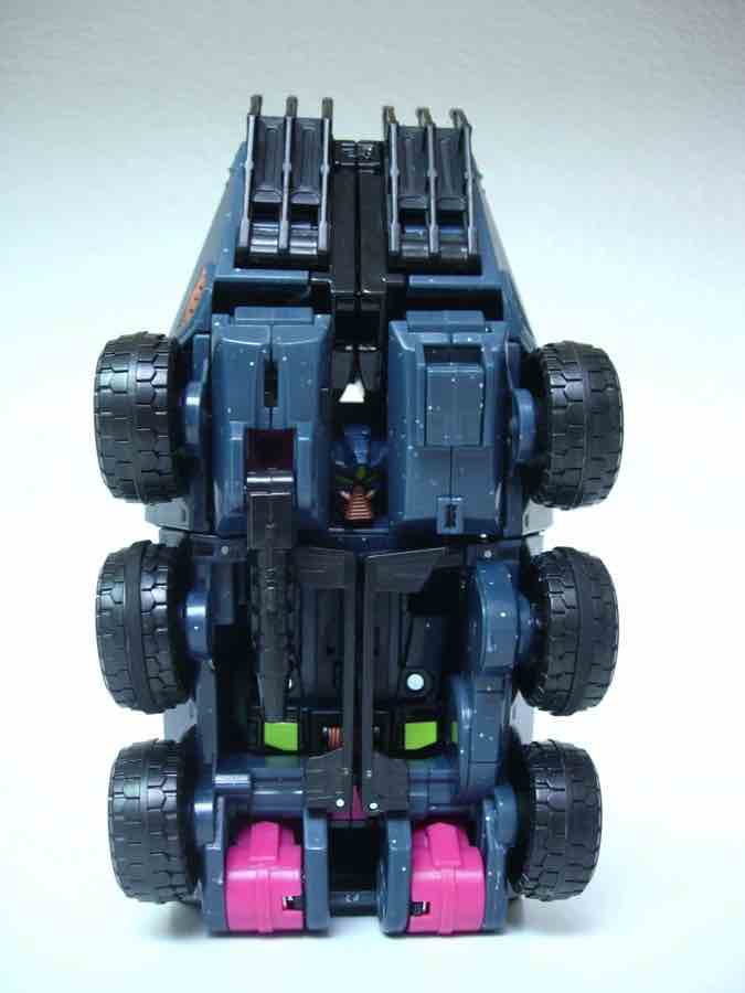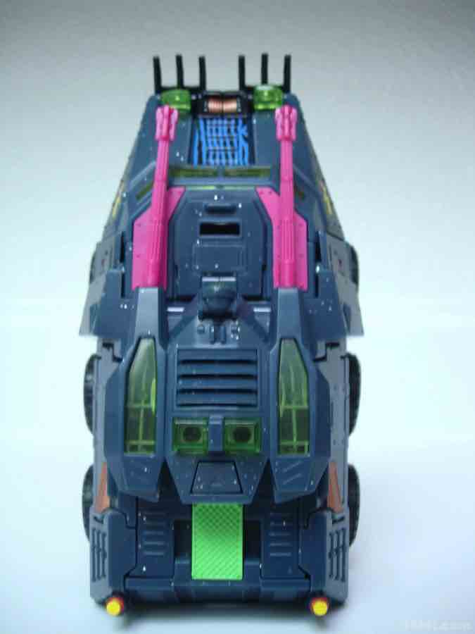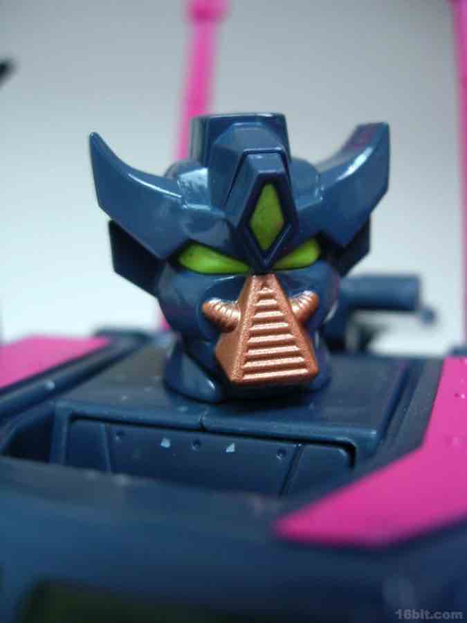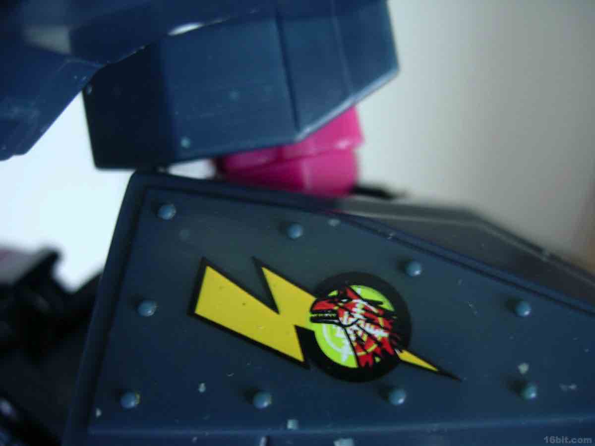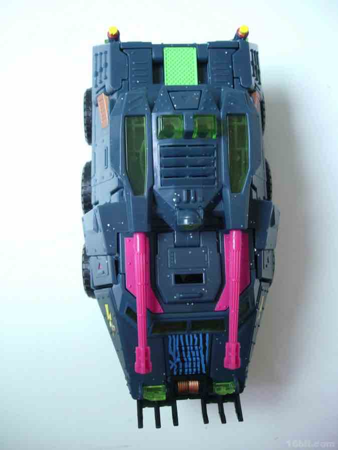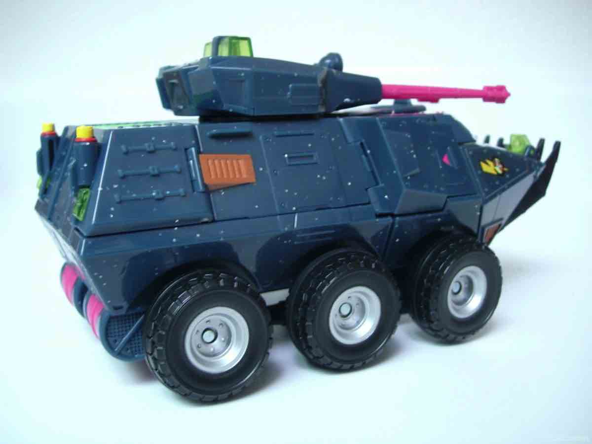 The vehicle mold has 6 rolling wheels, a rotating turret, and articulated lights on top of what is a sort of an opening grill/shovel thing in the front. As we are not experts in war vehicles at 16bit.com, I can only say that the colors and design combine to be one of the ugliest quasi-futuristic Decepticon vehicles I've had the fortune of seeing up-close.