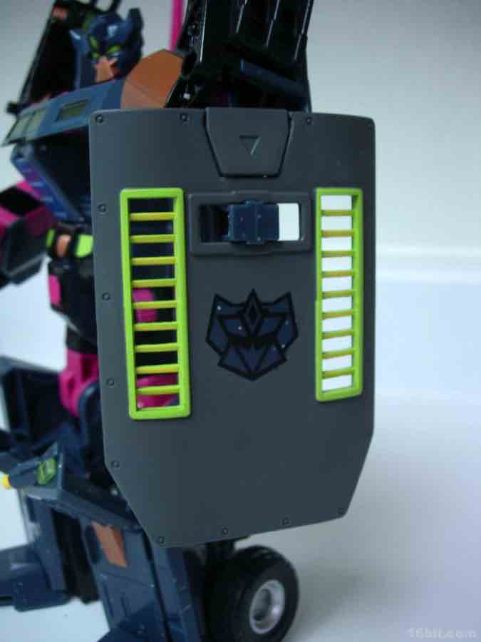 Unless you bought a ton of toys in the early 1990s, it's safe to say you don't have anything quite like this. The hulking Onslaught mold was given a G2 makeover and a new head, but it seems that the Botcon people really went the extra mile on this one. While the toy's electronic features were removed, a bunch of funky tampos were added like a lightning bolt dragon thing, some arrows, and a painted garden of bright blue and black which remind me of the Blizzard logo. I can't not see it. Clench's shield is covered in grey paint with a G2 sigil largely unpainted on the front, while the back is the bare extremely dark green (with sparkles) plastic that you see on the rest of the toy.