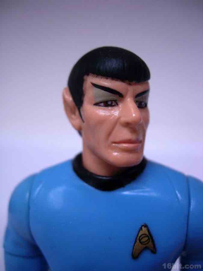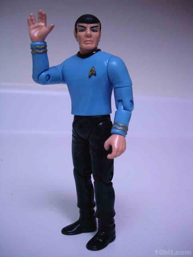As Spock figures go, this one is pretty good-- the added makeup and the face proportions aren't perfect but they're certainly good enough to fit in with the line as a whole. Mego's got the hair and the ears right, and Diamond Select's are basically OK-- but this one feels more like a toy than all of those. He can stand and sit, and his one flaw is also a feature-- his right hand is locked in the "Live Long and Prosper" pose, and can't hold his accessories. Thankfully his other hand can, but you'll have to pick between his phaser or his communicator, which is a bummer. The sculpt captures the character's look and personality nicely, although his skin coloring could have been a little better. He could also stand to look more like Nimoy, but the haircut and ears do most of the work of bringing the character to life as a toy anyway.