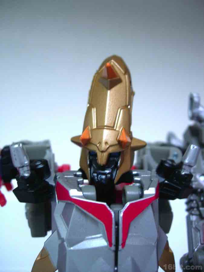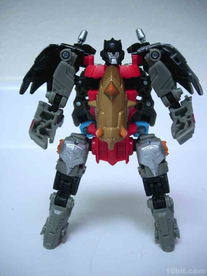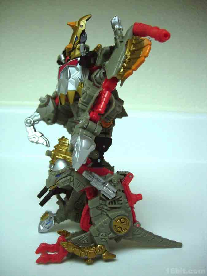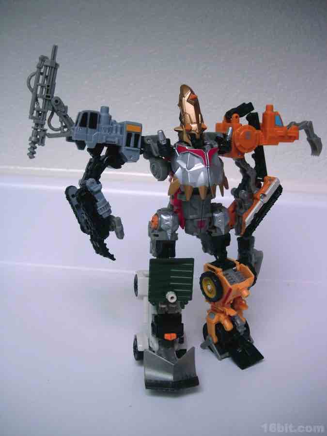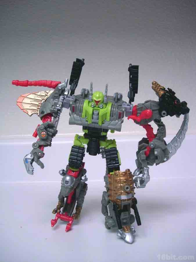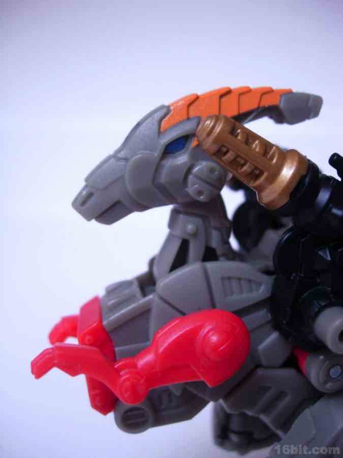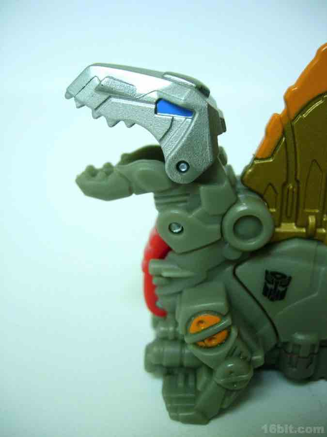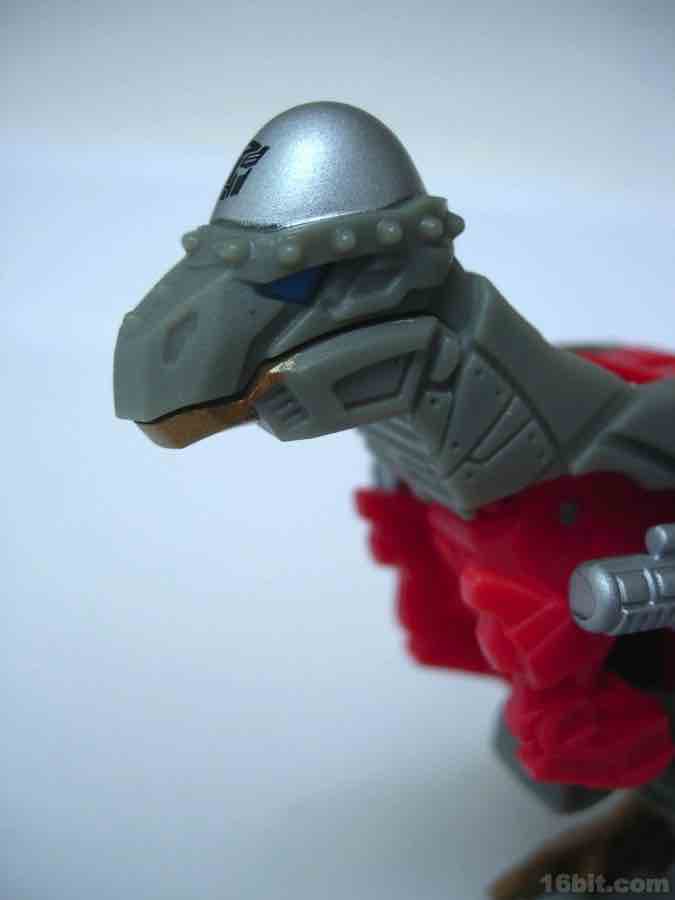 The central core robot has an amusing head, which looks sort of like Marge Simpson and Fran Sinclair combined DNA with a robot to cook up a bizarre looking creation. His blue eyes match the original animated series' Dinobot character models, but it still looks like a huge mess of parts. As a toy it holds together fairly well, although our joints were extremely loose-- the figures knees were particularly floppy and this may hamper your enjoyment of the combined mode. It's better individually, if you ask us.