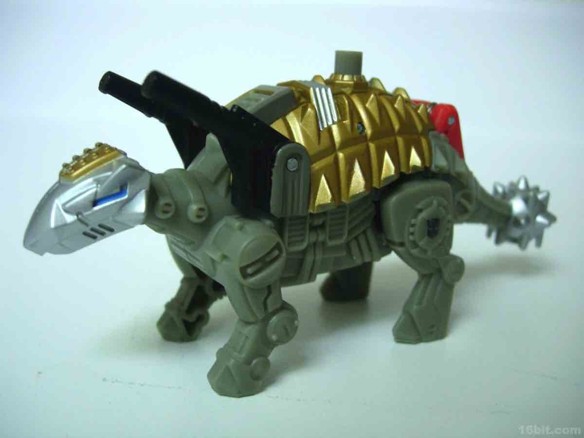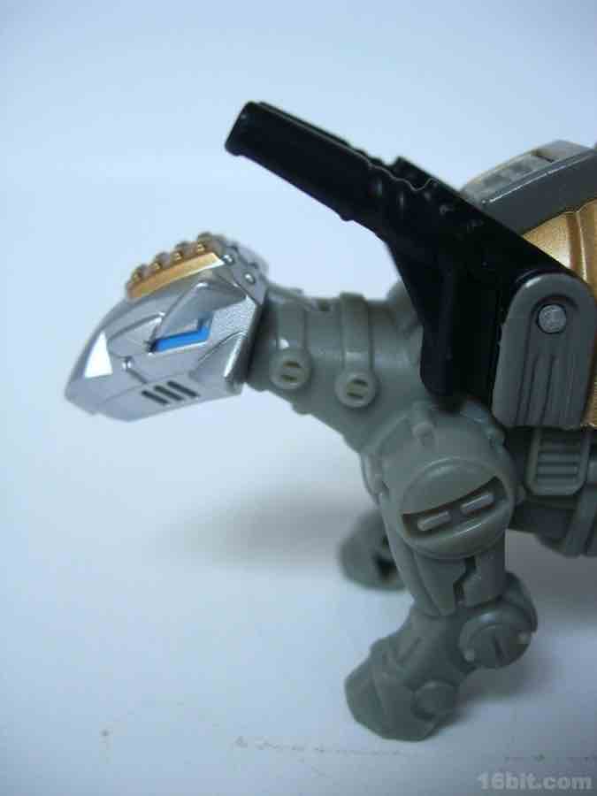 The central Dinobot commander, Grimstone, is said to be a triceratops on the package. Not only is this apocryphal (thanks, science!) but it's also a bit of a stretch. The dinosaur mode looks more like a styracosaurus or some other beast they just made up than everybody's favorite juvenile torosaurus. In robot mode, he's a little tubby-- it almost looks like Hasbro was going for a quasi-sumo look on this guy. Heck, I'd almost stake money on it. Just look at 'im. So tubby. Awww.
