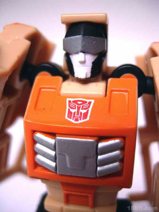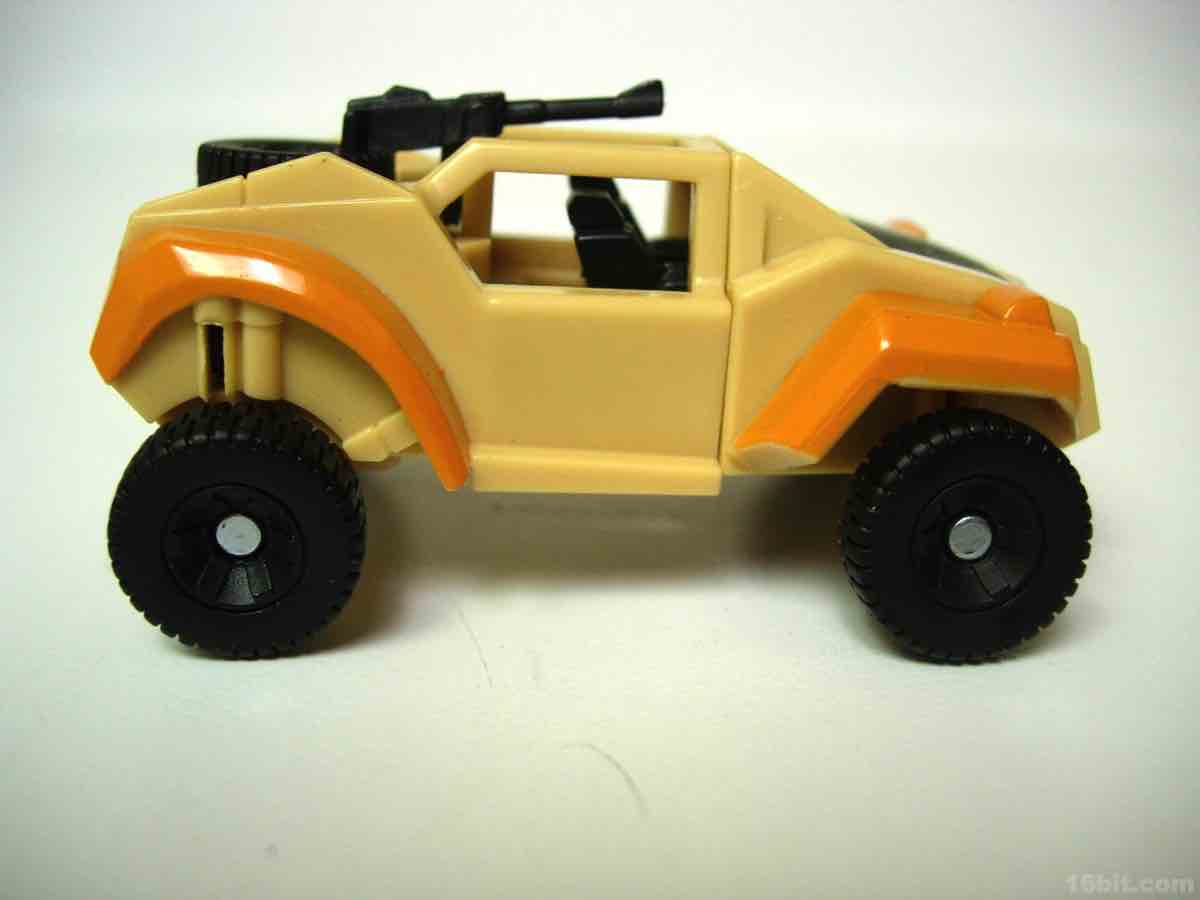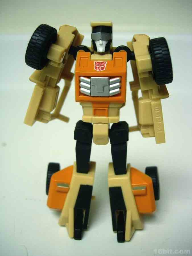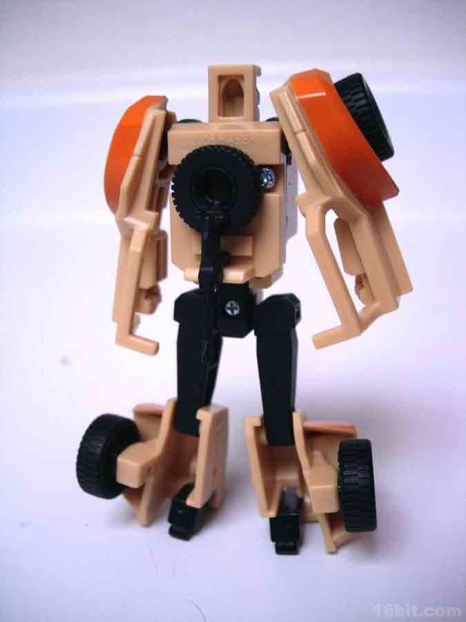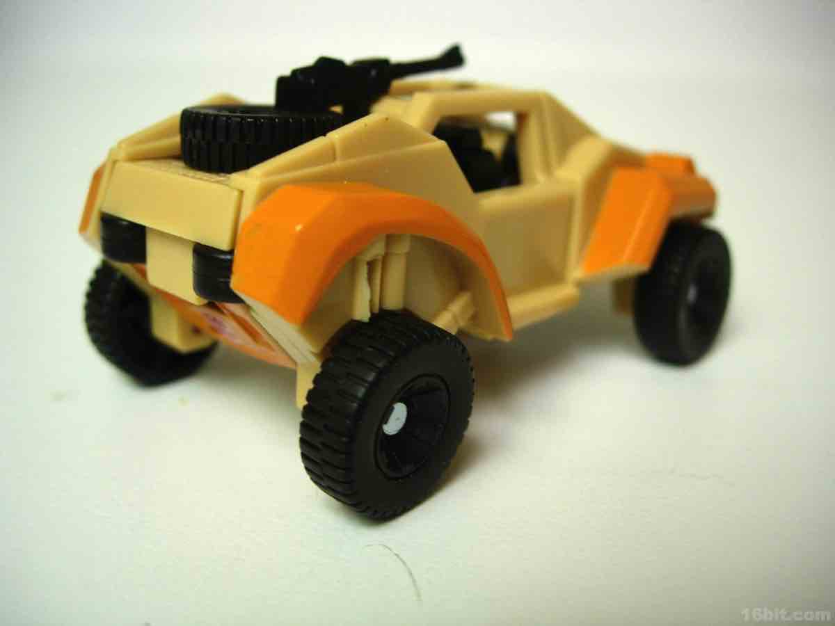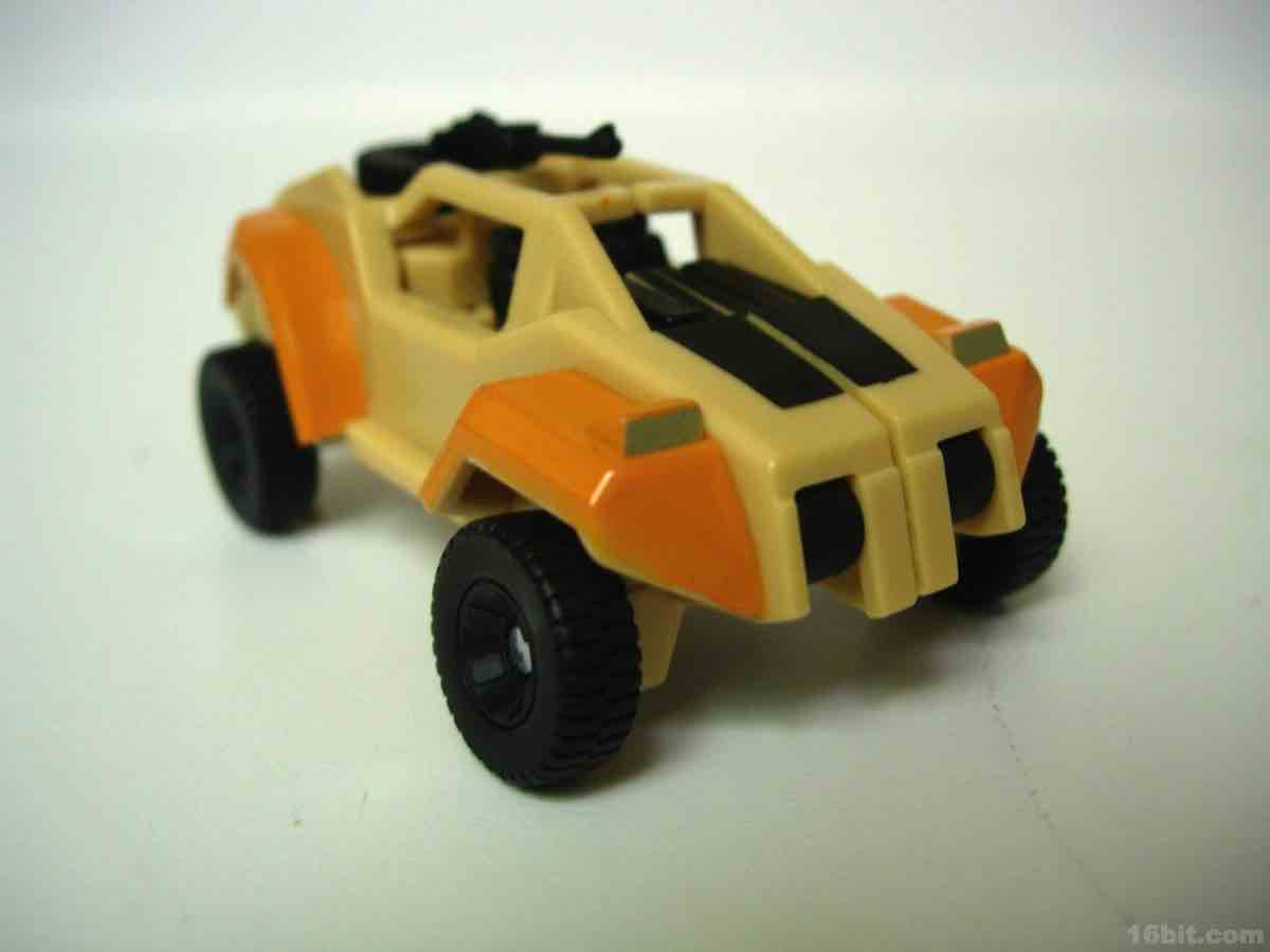 In car mode, his wheels roll nicely and he looks a little more like a Warthog from Halo than a dune buggy. The original toy could turn into a dune buggy or a helicopter, so hey, you lose a mode-- it's also a lot cheaper and a much simpler toy. In robot mode, the figure has articulated shoulders, hips, and knees, making it a nice toy to fiddle with while someone calls you on the phone and won't shut up about whatever it is they want to try and sell you or whatever. In short, it's an ideal desk accessory and sturdy enough that your kids might enjoy it.