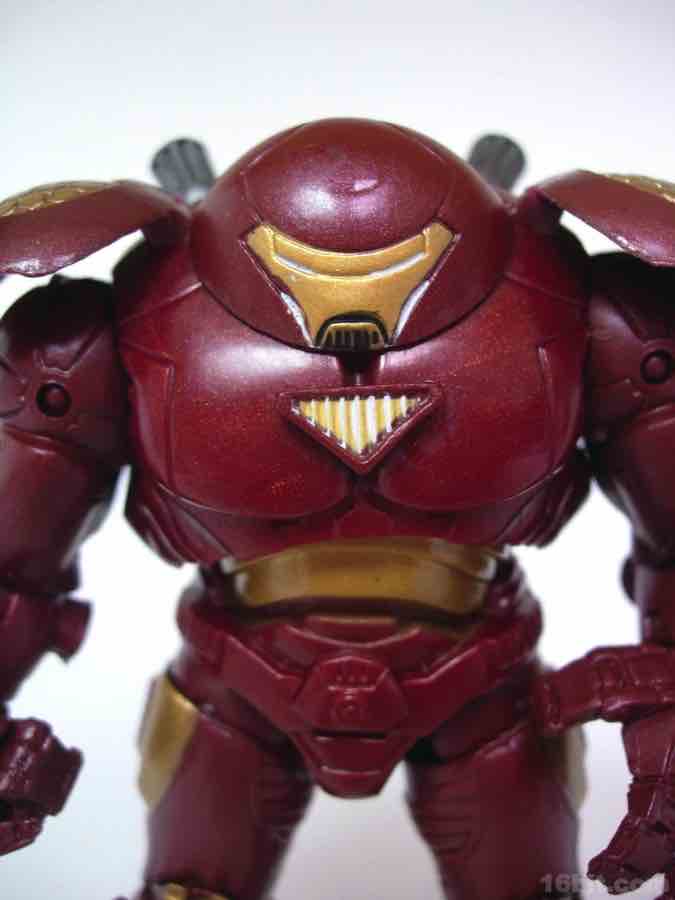 While bulky as all get-out, the rotund Hulkbuster armor was specifically designed so that Tony Stark could fight the green menace without being torn to bits-- that's why the helmet is so wide, it (in theory) prevents Banner from g.shtmling it and ripping it off. The suit has three fingers, tons of detail, and shares most of its construction with the previously examined Iron Monger. The head, hands, and feet show the most differences, but the core body plus the arms and legs are pretty much the same.