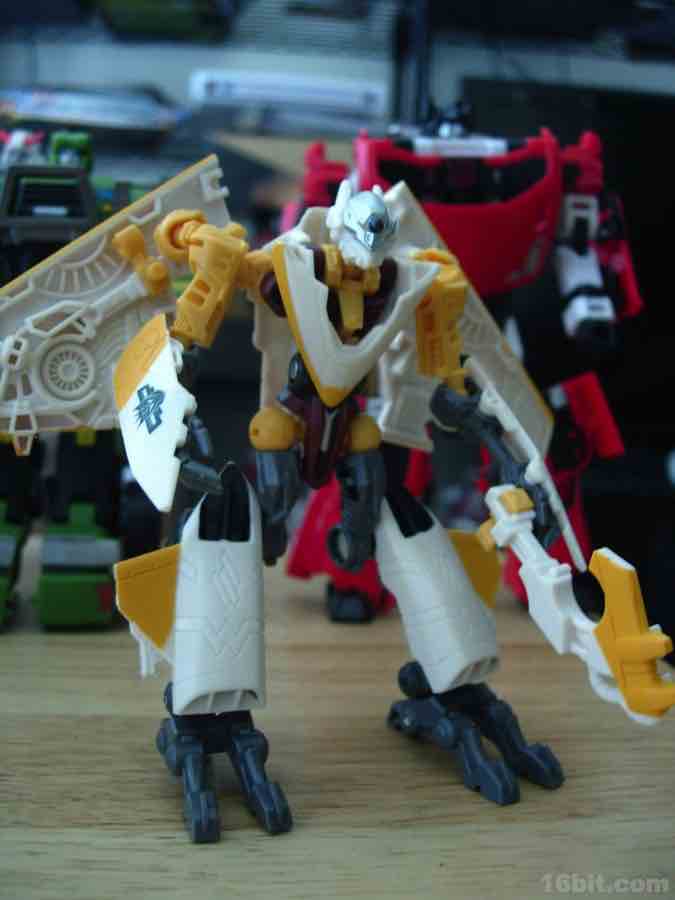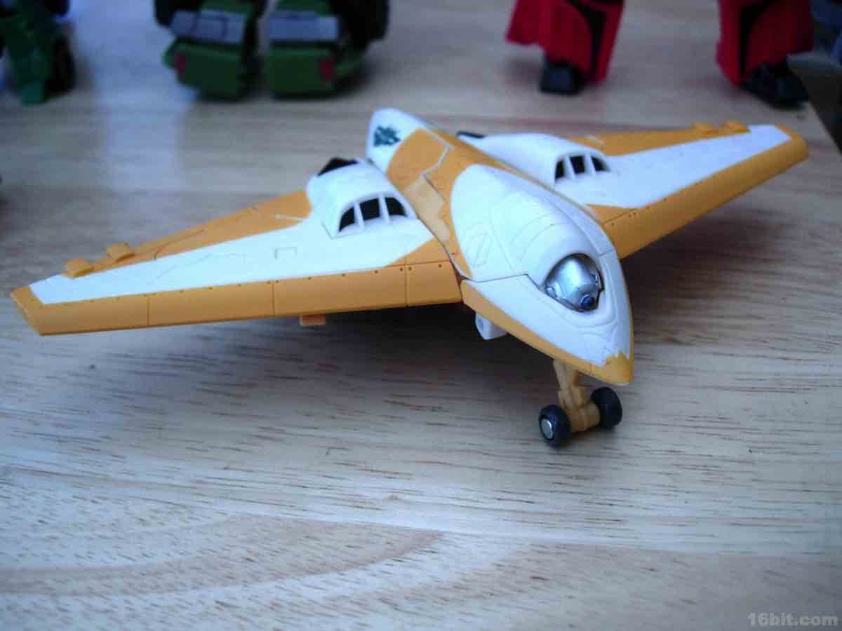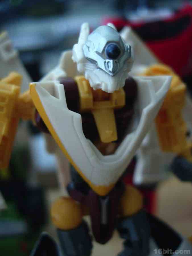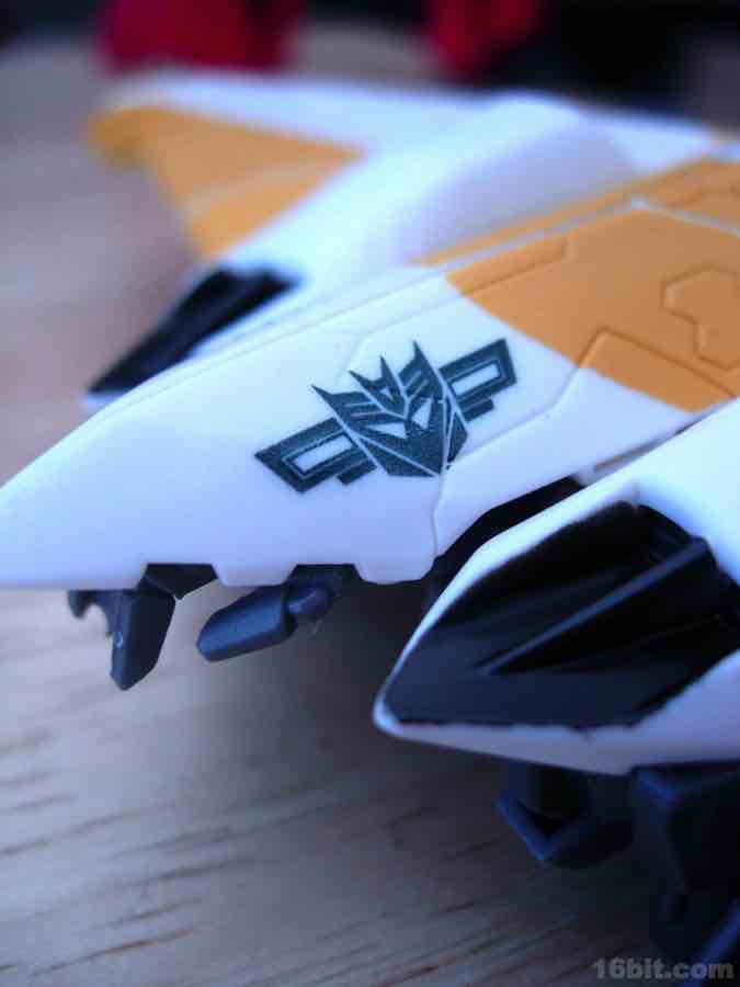 This redeco of Revenge of the Fallen Skystalker takes a cue from Sunstorm, a Japanese-exclusive orange Starscream repaint which has been made into a number of toys. The unique coloring renders this figure mostly white, with some silver and very dark grey here and there. The vehicle is a nice-looking aircraft, with retractable front landing gear and, on the whole, no play value to speak of. You can pick it up and make it fly around with your hand, or you can pull down the feet for a quasi-gerwalk mode if you're into such things. These little vehicles rarely have more going on for them than rolling wheels. It's also worth noting that the vehicle is designed to combine with Revenge of the Fallen Mindwipe and also Reveal the Shield Strafe, neither of which match the color scheme for this blindingly bright figure.
