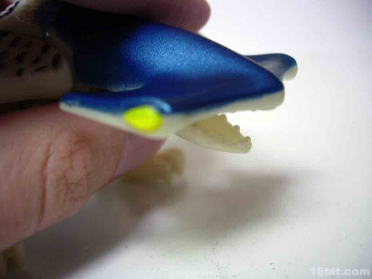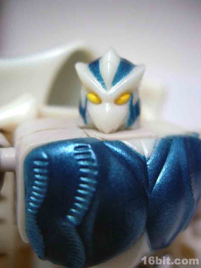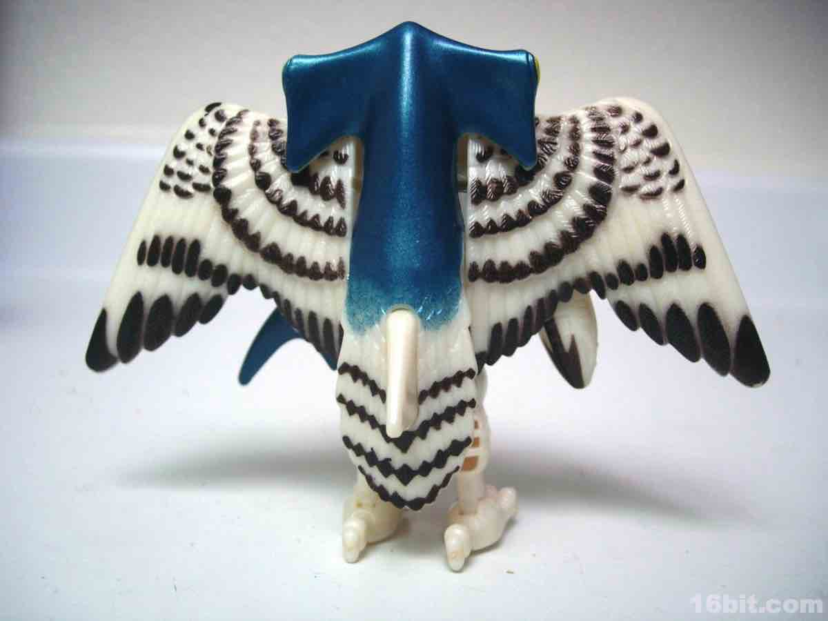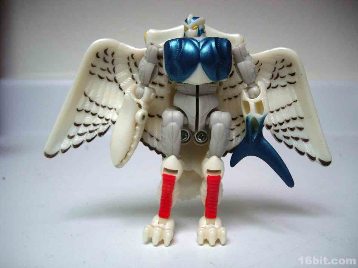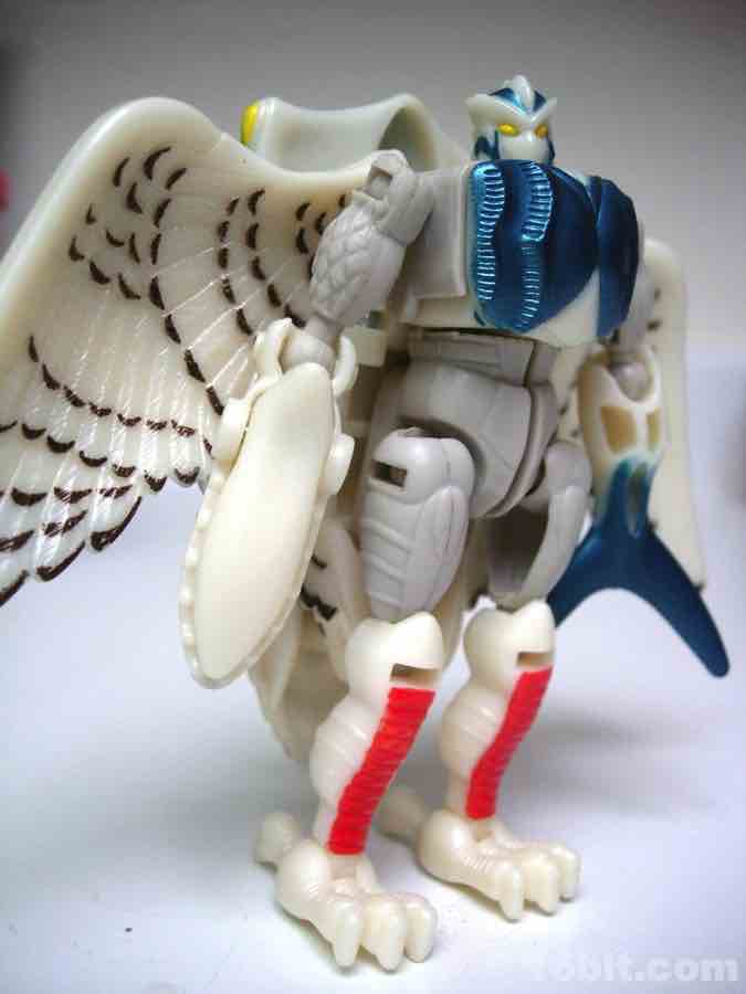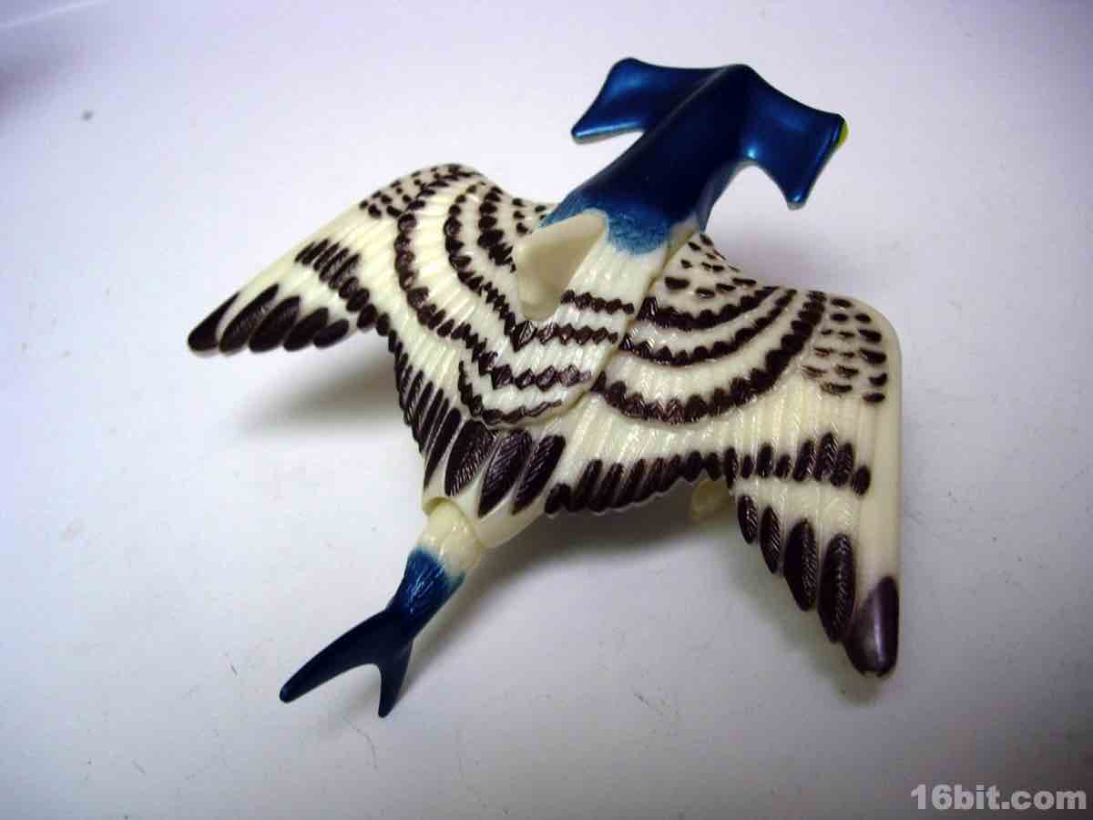 One of the neater things about this particular creation is that it serves as a reminder when Kenner, not Hasbro, was the name on the boxes and those designers would try all sorts of wacky ideas. Since the Beast era ended, very few of the toys under the Transformers brand could be called genuinely weird because there just isn't much you can do to really freak out a kid who's going to buy a vehicle that turns into a robot. Heck, you wouldn't think there would be any weirdness with animals either, but here it is! The metallic blue head and tail on this feathered fellow really shine, quite literally. The off-white plastic looks almost like glow-in-the-dark without actually doing much glowing in the dark, and Kenner added various paint details on the feathers to help bring them to life. While in the beast mode, the figure has articulated feet and a nifty spring-loaded jaw which becomes the robot's right hand.