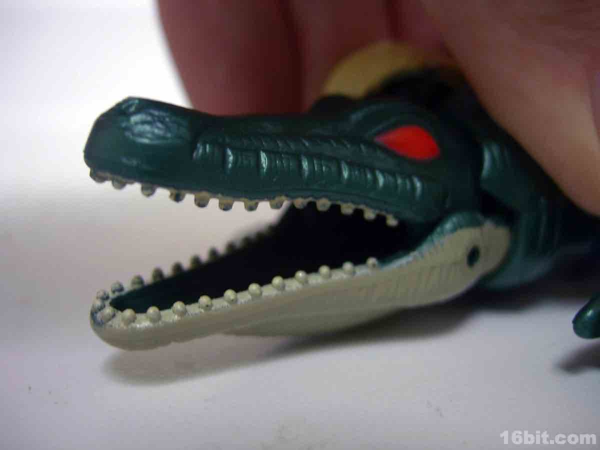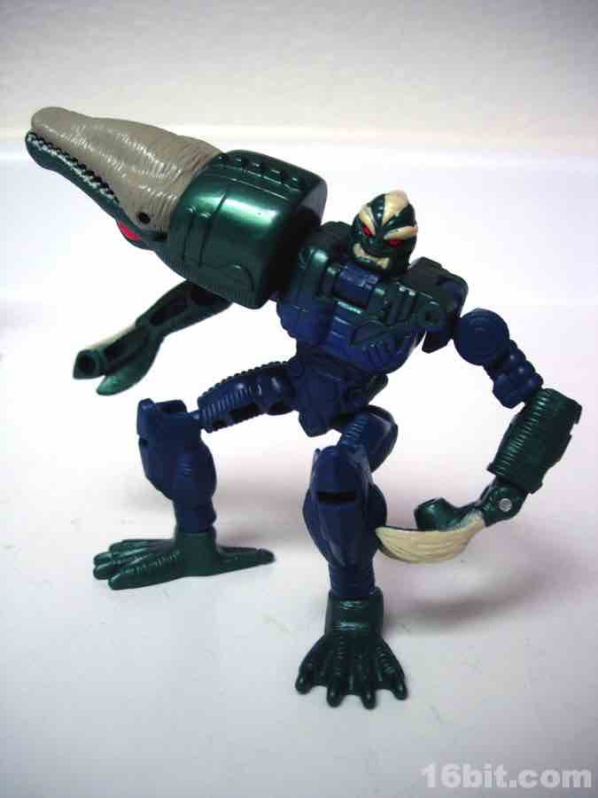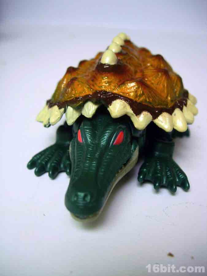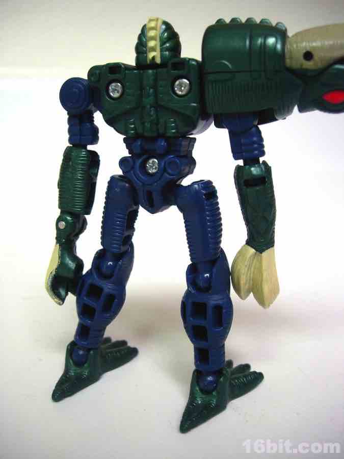 The beast mode is not exactly a solid creation, but it looks cool. The thin limbs and the shell are a little hard to keep together, as the shell pegs don't quite fit into the hand holes. The tail stays in place, and the articulated legs (while unnecessary) are a real nice touch. There's a cool little mechanism in the head where if you move the arm under the shell, the head will bite. It's not a perfect fit but it's pretty nice that they worked something like this in such a small figure. The critter is essentially a barely-poseable creation, but you'll probably going to want to keep it as a robot anyway.