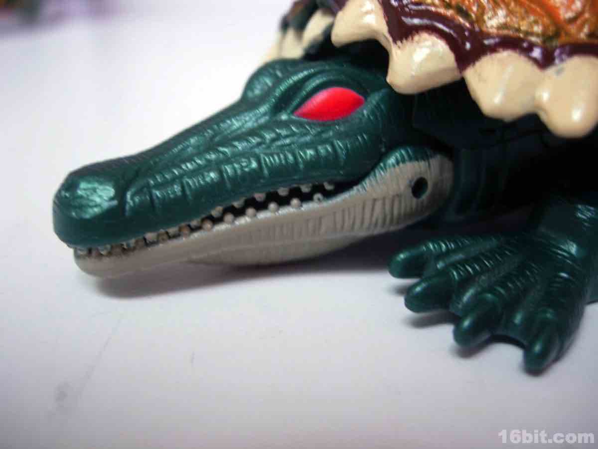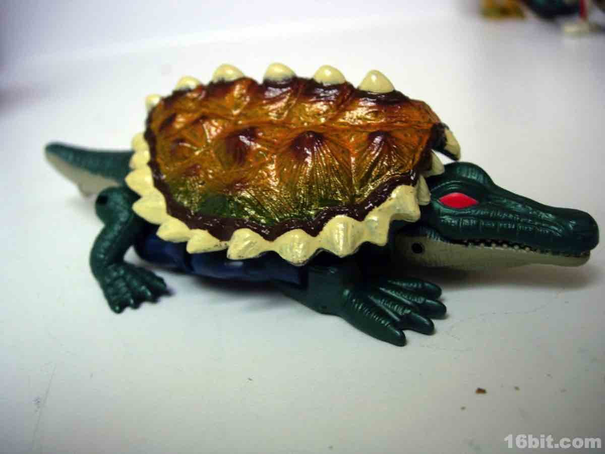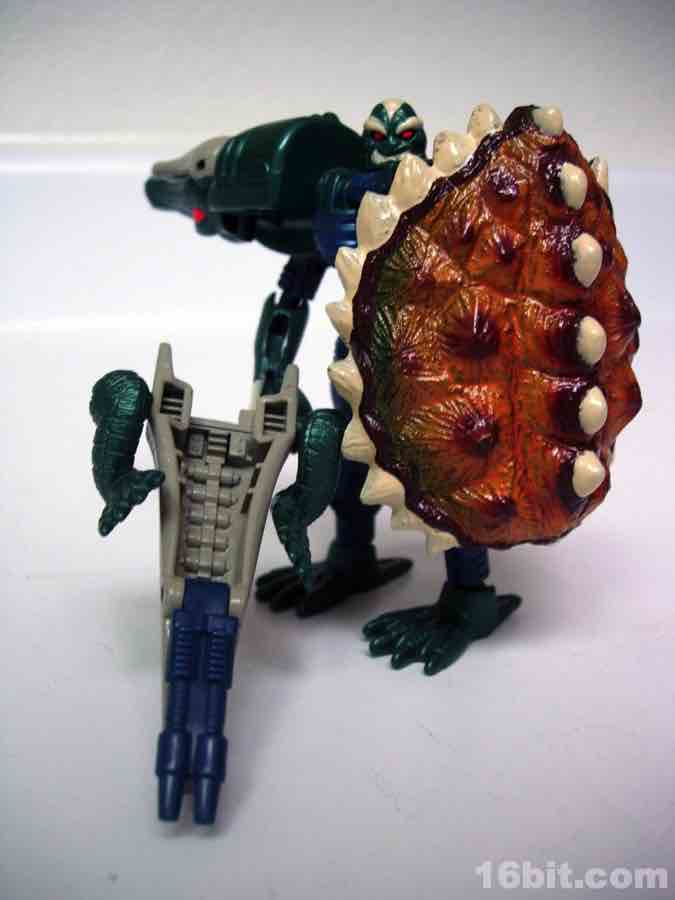 The most amazing thing about the toy-- especially for a 1998 Transformers toy-- is the paint job. The shell is one of the prettiest things I think Hasbro has ever done, and the most amazing thing is that this came out of an era where most toys had, at best, three or four colors of paint on their heads. This shiny finish with the fading browns is really nice, and I can't help but wonder if it was entirely intentional for it to be this rich or if it was just a happy accident in the production process. The previous Beast Wars, turtle, Snapper, had a shell molded in green with some yellow splotches. Terragator has other great details like painted teeth in both modes, big bright eyes, and a creamy color for the bottom of his reptilian head. Sure, that tail gun thing is sort of dorky, but you can't deny that with all the accessories removed that this is a really nice Predacon figure. (There's no escaping beast kibble, folks.)