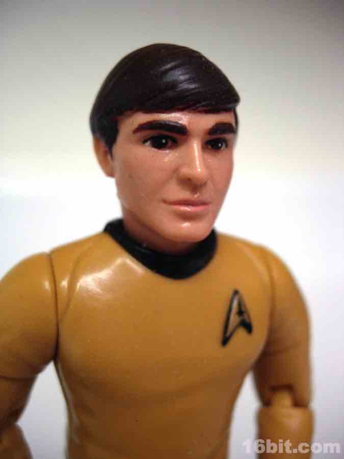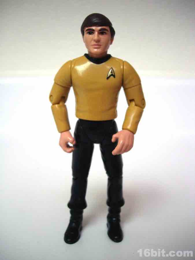 Pretty great! I've got one of the Diamond Select Chekov action figures, specifically because my employer got the "Mirror, Mirror" version as an exclusive a few years ago. The coloring on the Playmates figure's face feels more toylike and a little more lively, even if the exaggerated proportions and smoothed-over detail may be a turn-off to some fans of hyper-realistic mega-articulated figures. Like the others in this set, Chekov doesn't top 5-inches tall and has but 12 points of articulation. That may not sound like much, but things like knees, swivel biceps, and expressive faces were pretty rare outside G.I. Joe as Kenner was still on their 5-joints-and-that's-it-kick. Chekov's hair, inspired by the Monkees, remains intact although it was toned down and, thankfully, not based on the wig he wore on the show briefly. The coloring is great, he looks really young, and at some angles seems to look a little like his late son Andrew. The painted lips, sculpted eyebrows, and gold uniform clearly show this to be Chekov even if the details are a little exaggerated in places.