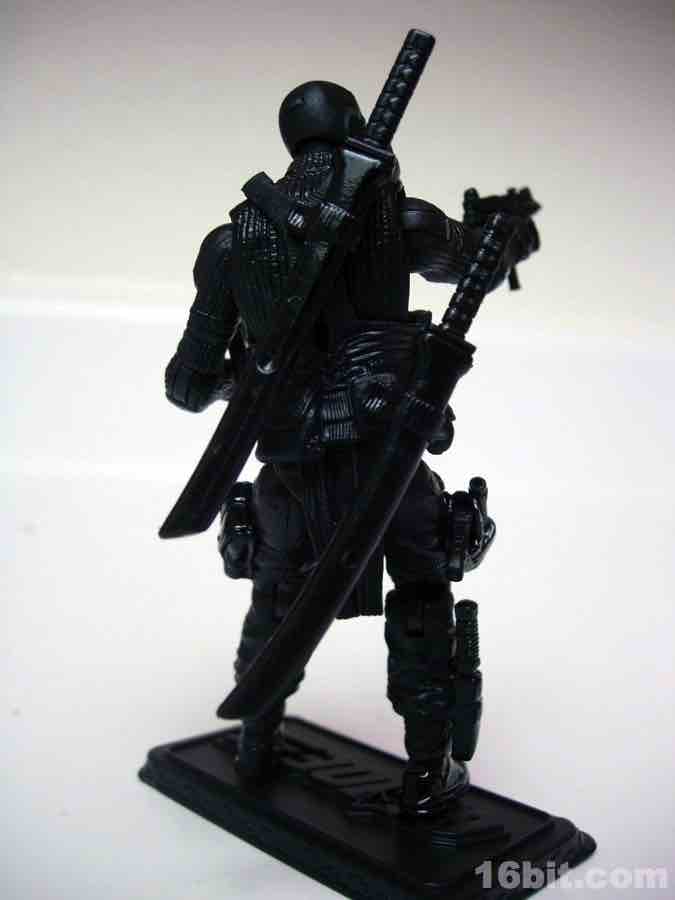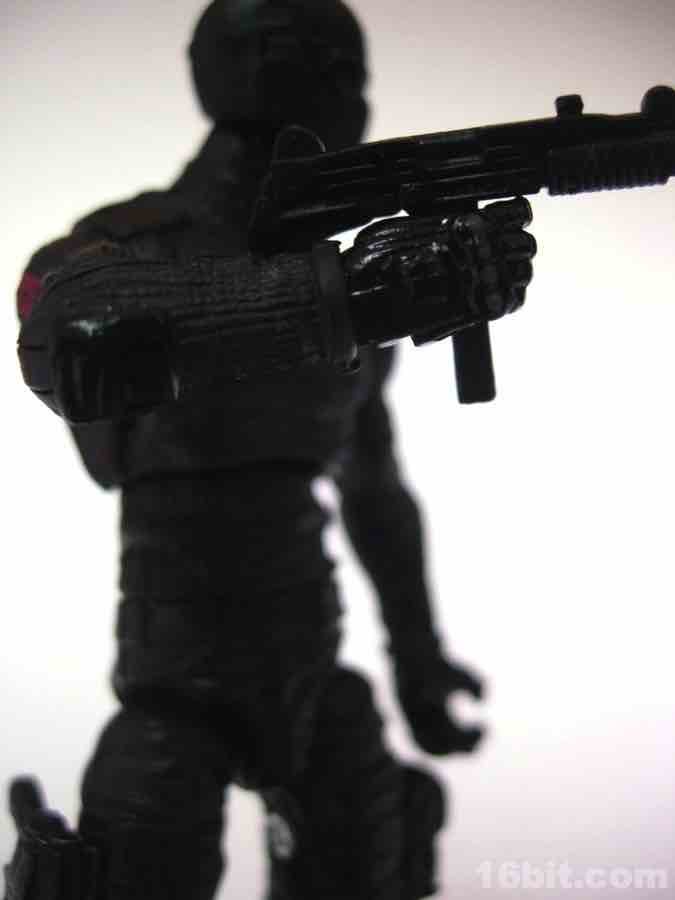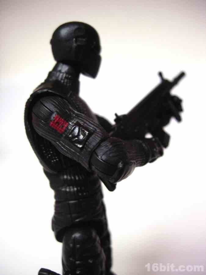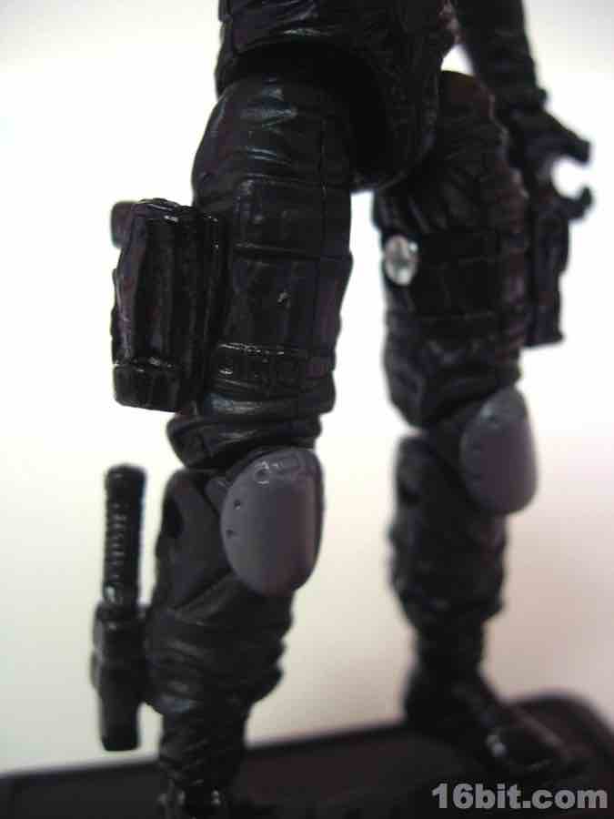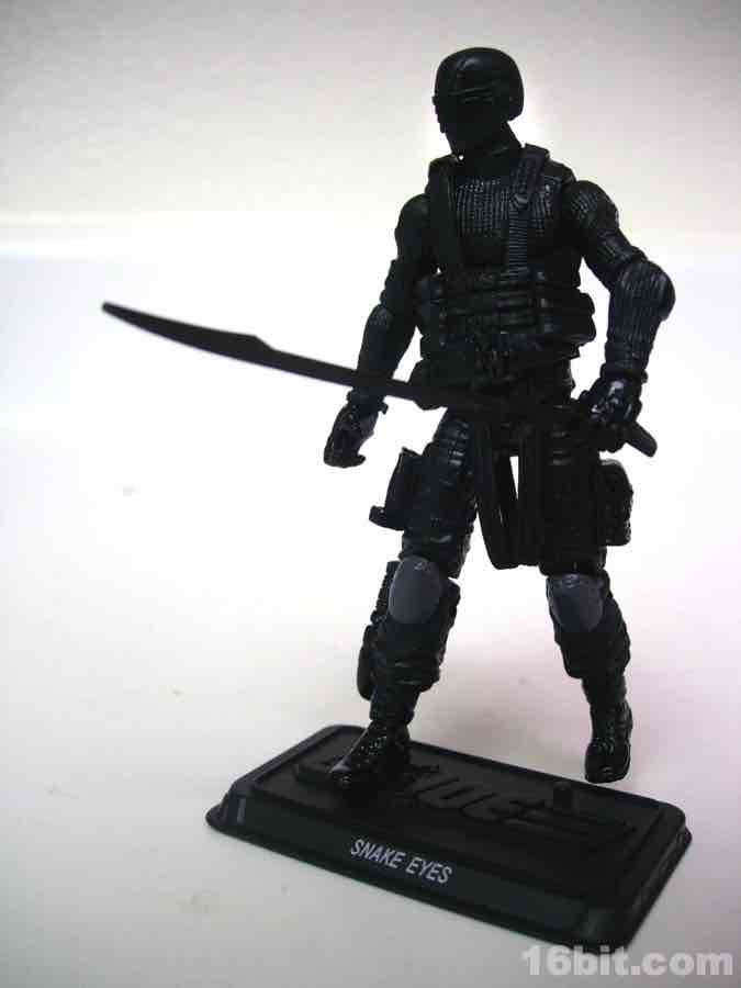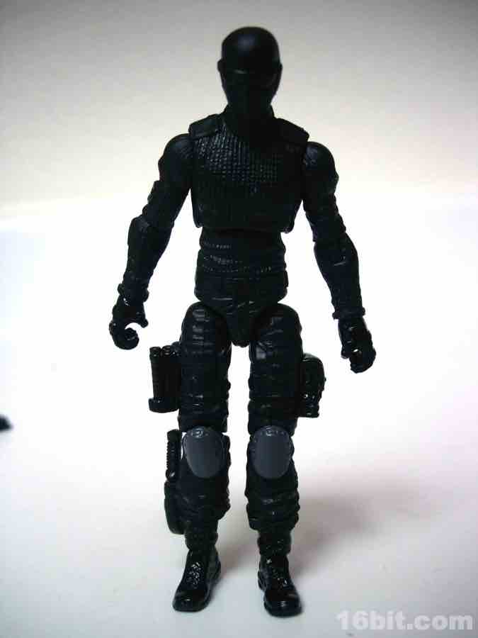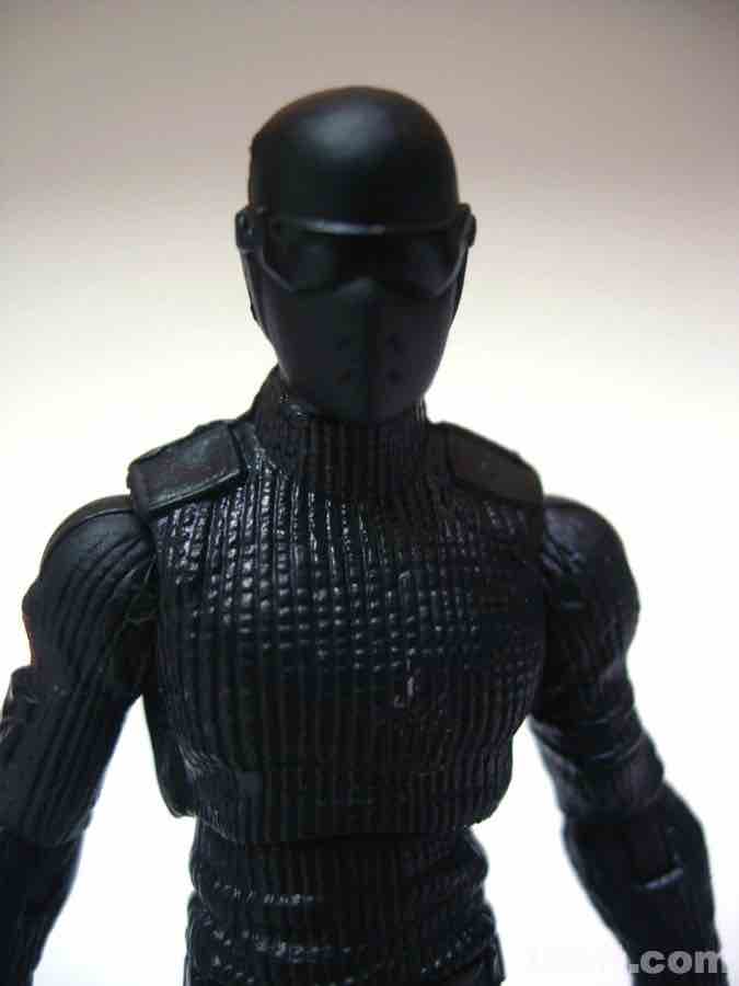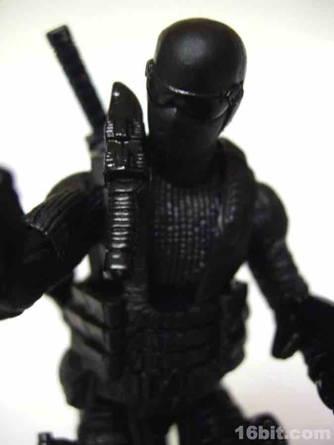 Hasbro G.I. Joe Pursuit of Cobra Snake Eyes Action FigureStanding just over 4-inches tall, Snake Eyes is just the right size to fit in with your other modern Joes (that is to say, from 2007 and beyond.) He has 6 points of articulation, with some nice bonuses. His knee pads-- that's right, the pads-- are articulated and removable. Both his wrists can swivel and pivot, giving him better gripping power over his many weapons. The detail is way above par, with all sorts of creases, folds, and textures plus varying levels of black and grey to really make the parts look different. The original Snake Eyes in 1982 was just black, but this one? This one has glossy black gloves and boots, grey knee pads, shiny goggles, plus some painted symbols on his shoulders.