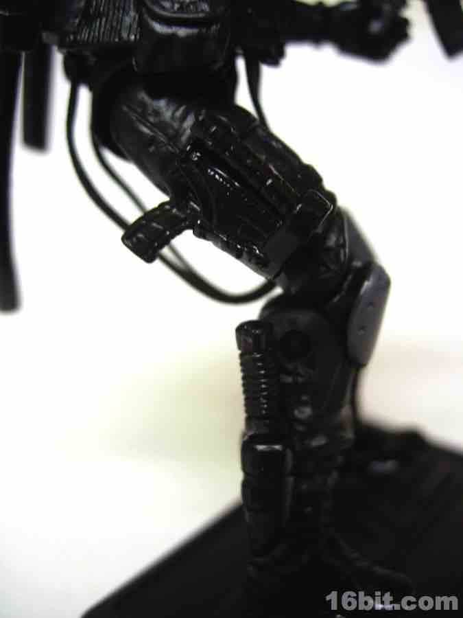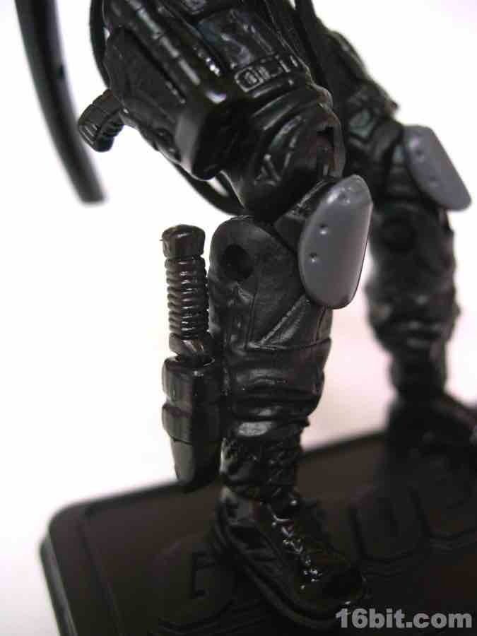 Between the figure itself and the sculpted harness, there are a few places to store some of the spare weapons. The suspenders have a place to put a knife sheath on it, and the blade does indeed come out. There's a second place to store a knife on his boot, plus there's a holster for a pistol and a silencer on his hip. There are also two places to plug in swords on his back, so at any given time, this guy can carry way too much crap. The most innovative bit of gear is the elastic on the lower torso, rather than using hard plastic Hasbro wisely used a material that can bend easily and will allow the figure to do things like sit. They should ape this construction for all their brands, specifically Star Wars' pilot figures.