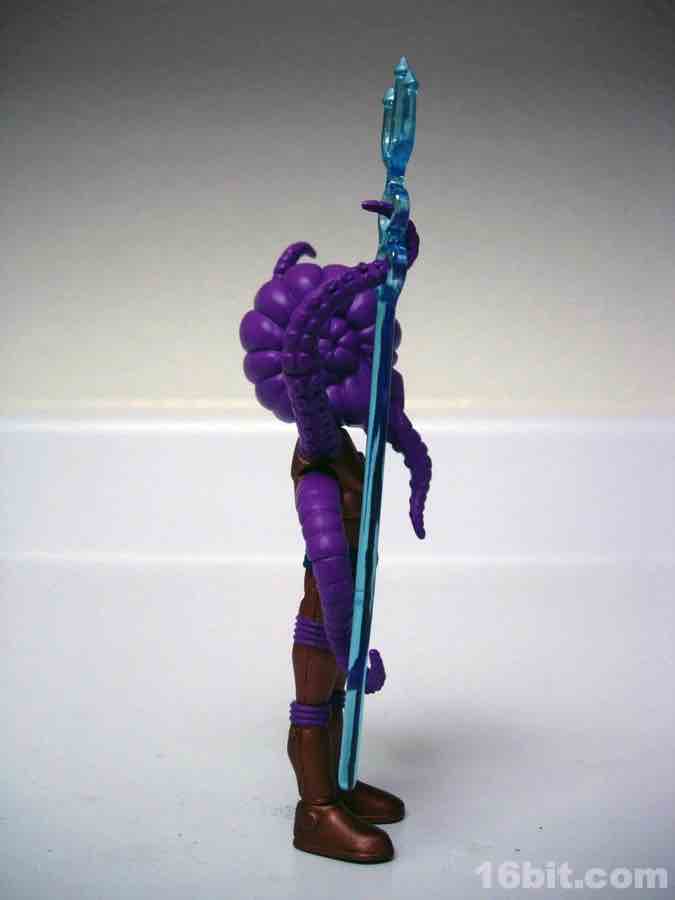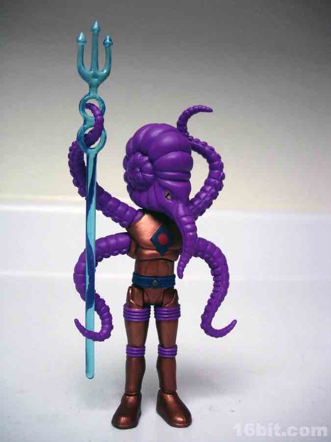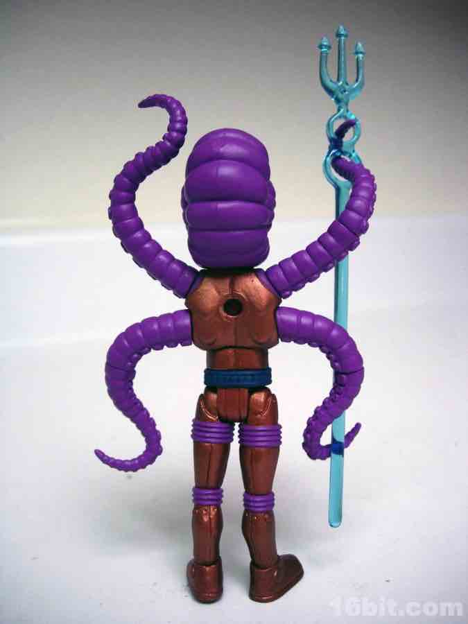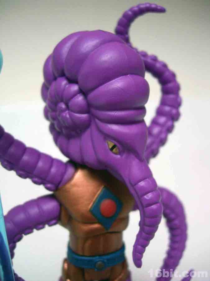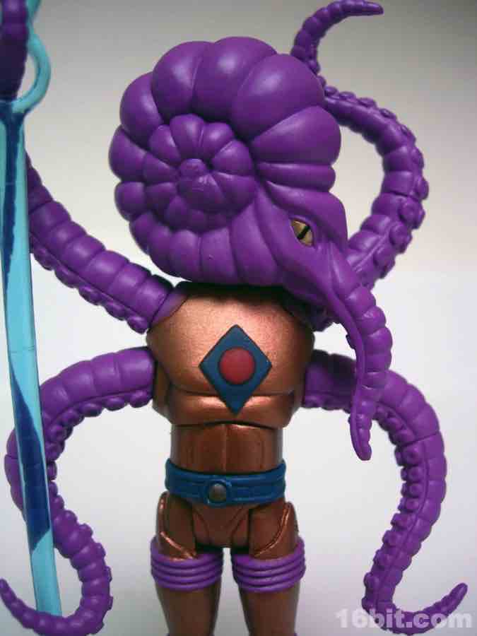 The accordion joint aesthetic was kept to retail the original look of the character, and while it is a little goofy it certainly works well here-- otherwise the guy would be in an all-bronze jump suit and that'd just be dull. He has a diamond-shaped blue insignia on his chest with a red dot which, as far as I know, isn't particularly significant of anything. (Maybe you know more about astronomy and it has something to do with how the sun looks from Neptune.) It's a nice detail, rather than just sticking us with a bland plain suit. Another fun detail which is tough to see from the photos is the "nose." The nose is really just another tentacle, you can see little suction cups underneath it which, I assume, gives this undersea-themed space alien the powers of an octopus elephant, or the "octophant." (Don't confuse this with the Octophantom, that's something else.)
