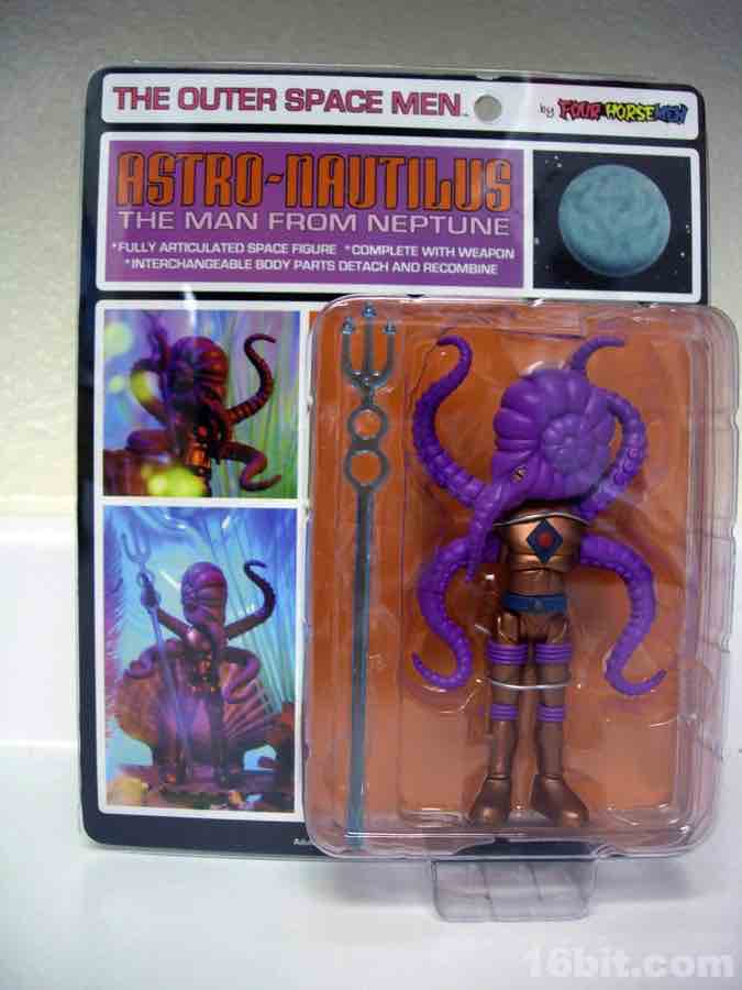 It's rare that a figure you see in a magazine makes an impression on you that lasts for years, but Astro-Nautilus, the Man from Neptune was just that kind of toy. The original figure from the 1960s was featured in Tomart's Action Figure Digest in the 1990s, a magazine which used to be one of the twin bibles of the hobby but is now really tough to find. But I digress. It showed Astro-Nautilus as this big, roughly 7-inch tall Gumby-style bendable figure with four tentacled arms and a staff... and a secondary market price in the very high hundreds-of-dollars range. In short, "See this figure? You can never have it." Skip ahead a few years, and in 2010 the very talented Mattel and Ex-McFarlane Toys sculptors The Four Horsemen announced they got the license, and they were going to make action figures out of them. Well, that's close enough for me!
