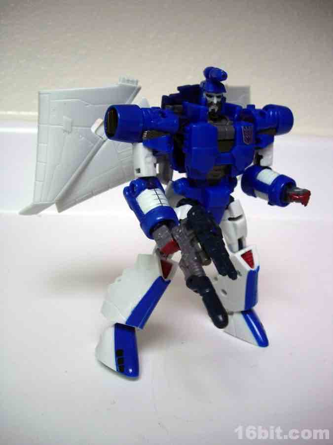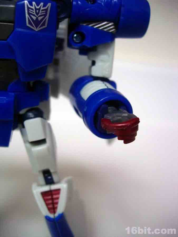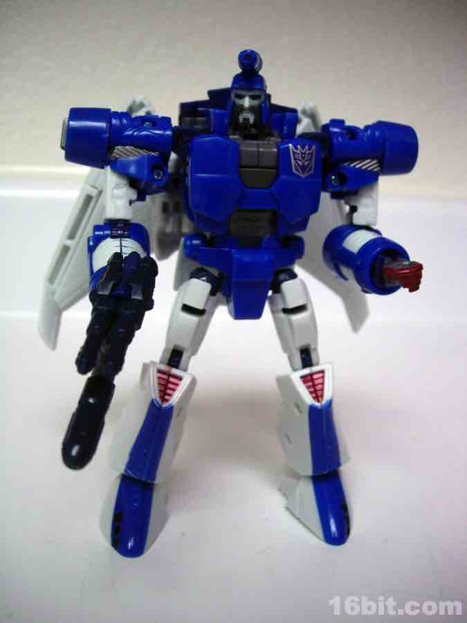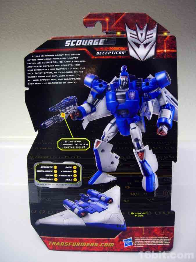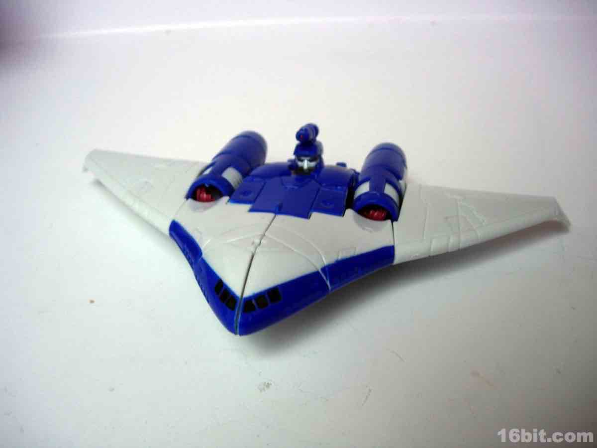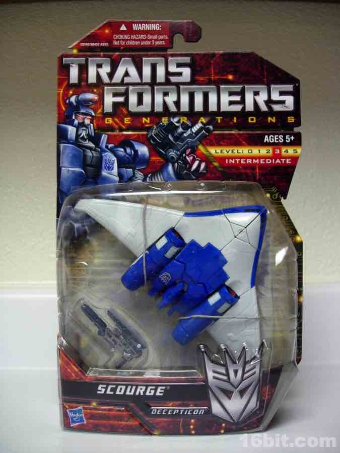 The original toy was basically a blocky space boat, but the animation model was a weird mix of parts that didn't fit the aesthetic of the toy line up until that point. Giant wings? Big red painted fingernails/claws? A beard? A handle on his head? It was a really strange design, and almost all of the funky.shtmlects of the original character return in the new toy save for the space boat mode-- now, it's based on a Flying Wing. The robot mode doesn't suffer in the slightest, as there's a big purple Decepticon shield on his chest, a whole lot of blue, and freaky clawed hands complete with Scourge's favorite shade of Revlon or whatever it is they use on Cybertron. He has little problem standing upright, and can easily grip his weapon.