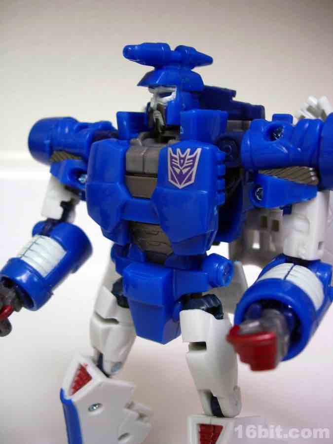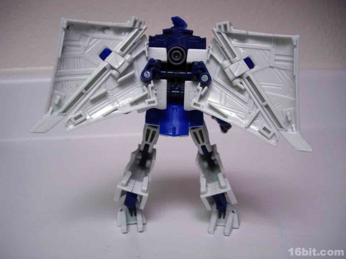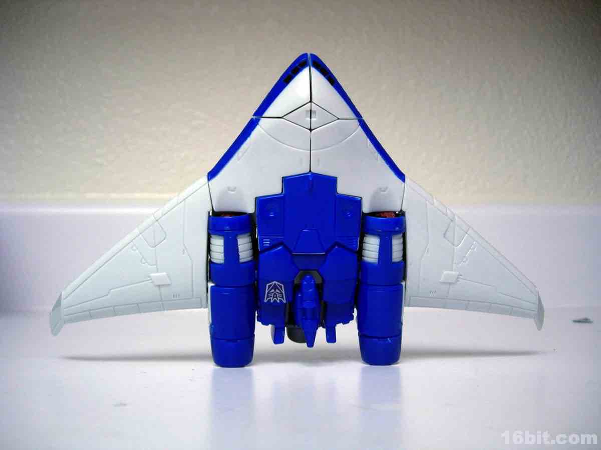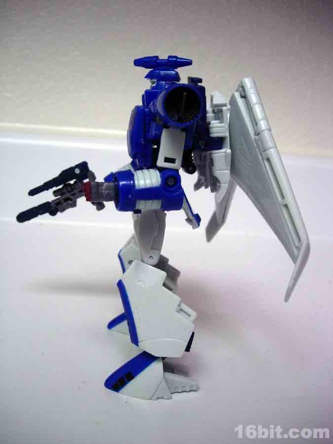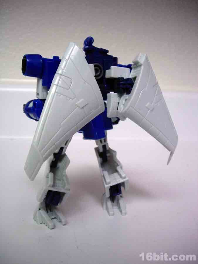 The original toy was basically a blocky space boat, but the animation model was a weird mix of parts that didn't fit the aesthetic of the toy line up until that point. Giant wings? Big red painted fingernails/claws? A beard? A handle on his head? It was a really strange design, and almost all of the funky.shtmlects of the original character return in the new toy save for the space boat mode-- now, it's based on a Flying Wing. The robot mode doesn't suffer in the slightest, as there's a big purple Decepticon shield on his chest, a whole lot of blue, and freaky clawed hands complete with Scourge's favorite shade of Revlon or whatever it is they use on Cybertron. He has little problem standing upright, and can easily grip his weapon.