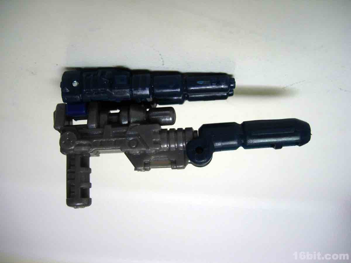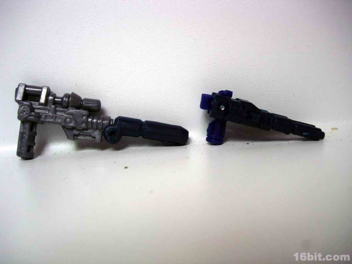 Inspired by an accessory from the 1980s, his gun is actually two guns that can combine. Hasbro deliberately sculpted it to look like the gun mode of Fracas, a 1980s Targetmaster weapon. Individually the weapons work quite well, and store into the open wings on the figure's back. (See below.) It's a nice touch because in the modern era, free-floating accessories really don't cut it. These things need to go somewhere so you're less likely to lose them.