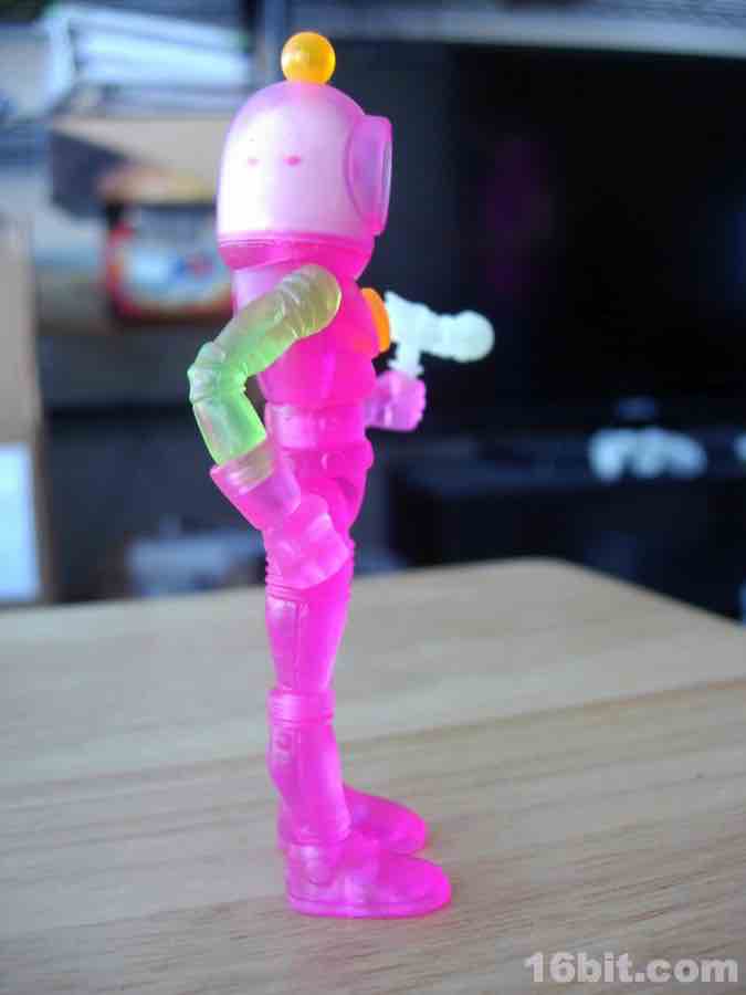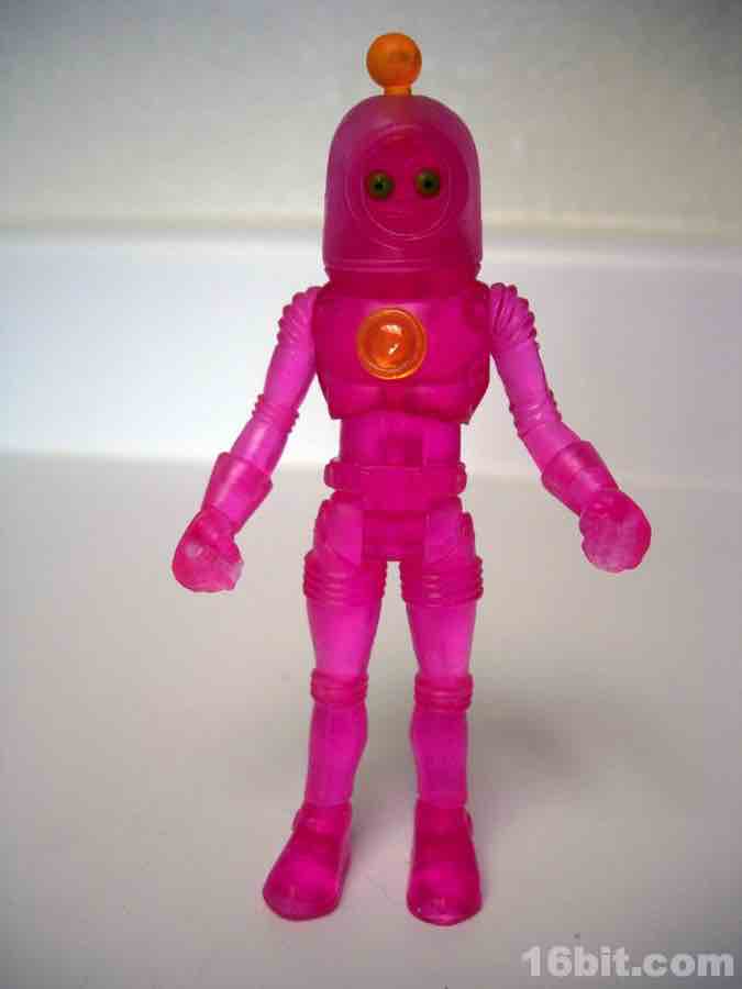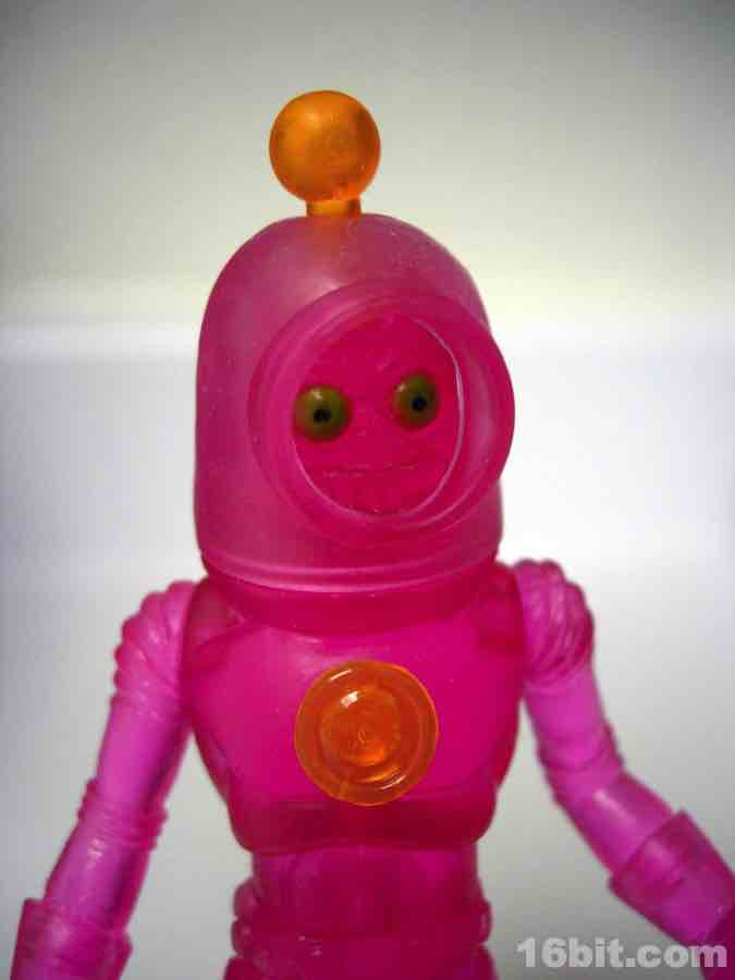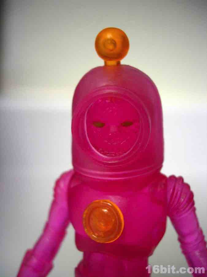 This time around, the just-under-4-inch action figure is cast in clear pink with clear orange making up the chest button and the handle on top of his helmet. The many faces remain, this time with green eyes that tend to peek out from behind the helmet-- one of the dangers of clear plastic is that they don't always hide the detail inside. I do enjoy that the figure's look and feel in this color seems to be in line with art toys or the vinyl Super 7 releases, but it doesn't feel all that much like one of the Outer Space Men that I've come to know and love from magazine articles.