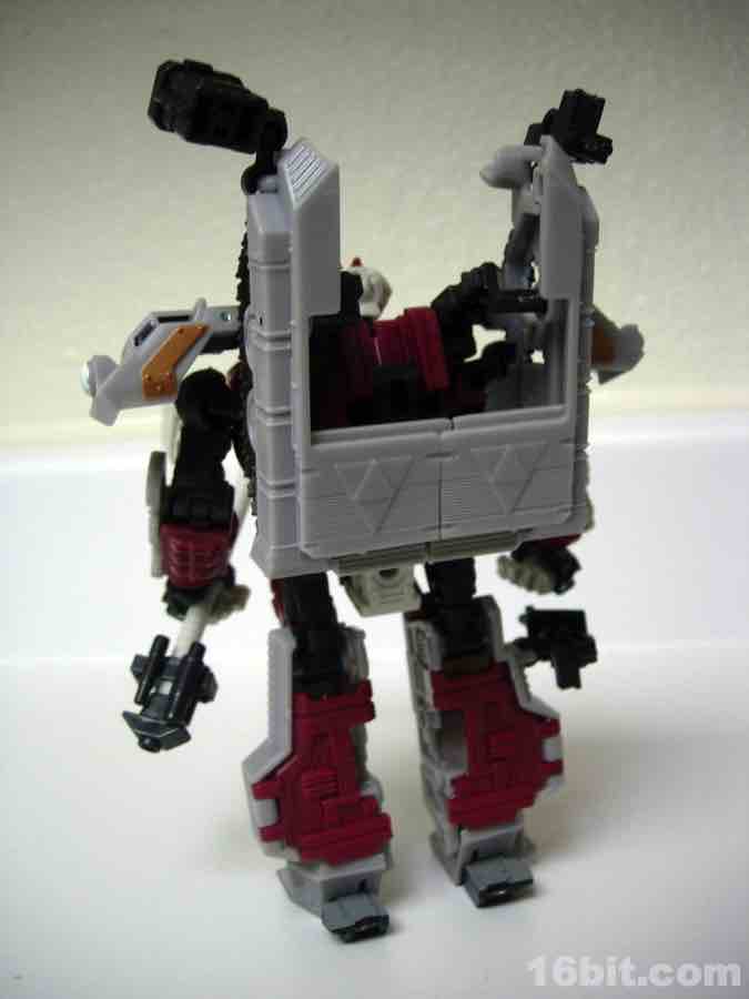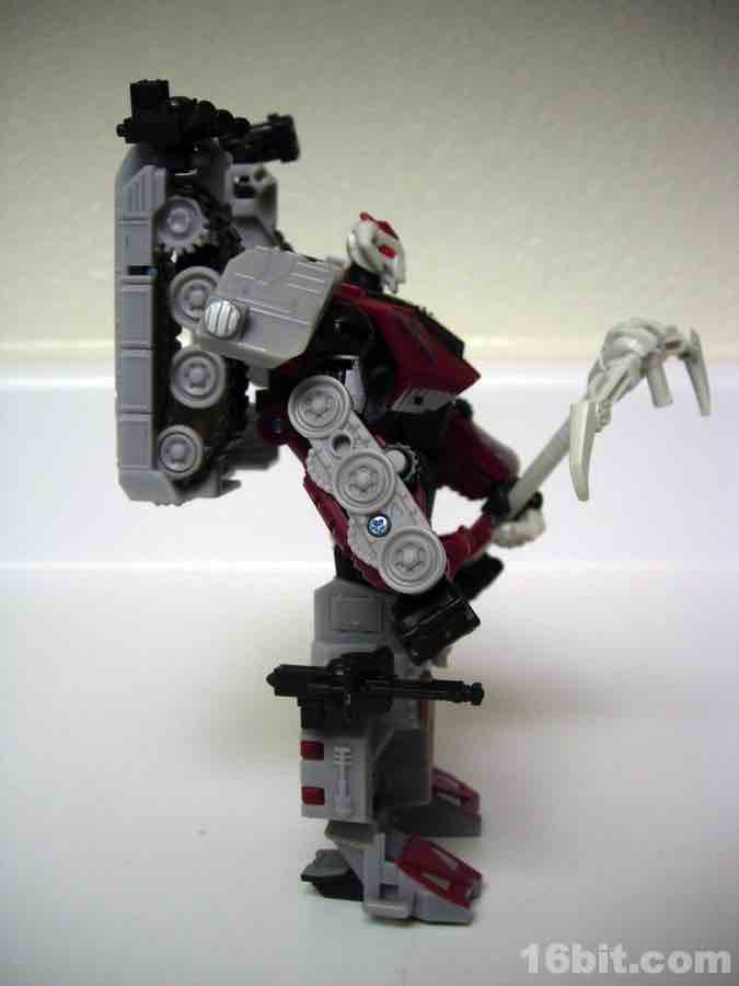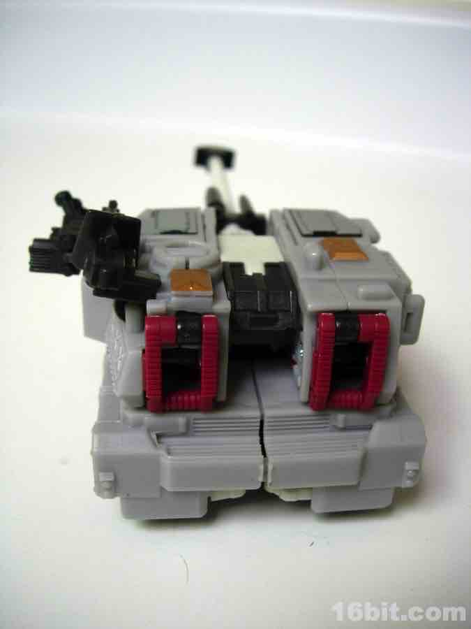 He has no problems holding on to his large weapon, and the three smaller clamp-on weapons fit on the bars just fine. I think they're a little excessive for the toy, but it's a nice added play feature and you can always put them on other figures instead if you're so inclined. Articulation is pretty great, and as long as you don't have loose ankles he'll have no problems standing up. Aside from a chunk of the tank serving as a backpack, the transformation is fairly involved and generally more complicated than I've come to expect from other tank toys.