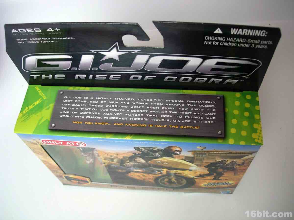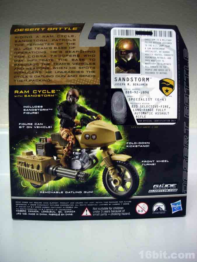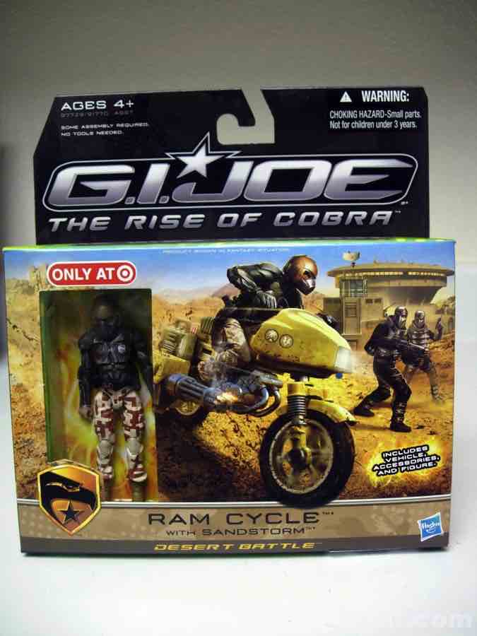 Item No.: Asst. 91770 No. 97729 Manufacturer:Hasbro Includes:Helmet, rifle, RAM Motorcycle Action Feature:n/a Retail:$6.99 Availability: November 2010 Other: Originally was going to be a Target exclusive, actually sold at Ross stores