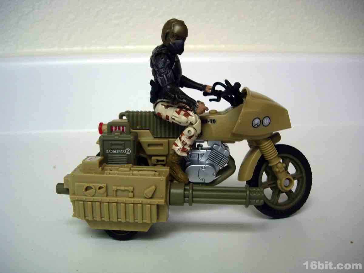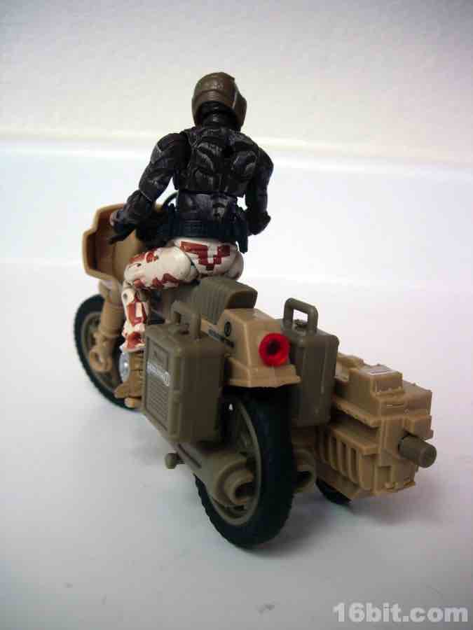 The RAM motorcycle is a redeco of the existing toy-- except now, it's brown, and has some more movie-themed labels. Like with most recent Hasbro products, the stickers do not necessarily fit where the instructions say. You may need to either cut them down to size in order to fit (the saddlepack, for example) or just deal with not putting them where they belong. It's quite irritating, and something that shouldn't be an issue in 2010-- stickers should go where the instructions say, period. Especially if you're working from a toy mold that's over 25 years old. The bike is a pretty nice little toy, the sidecar gun detaches, there's a kickstand, and the wheels roll freely. It's just that with this figure, it's not necessarily a perfect fit.