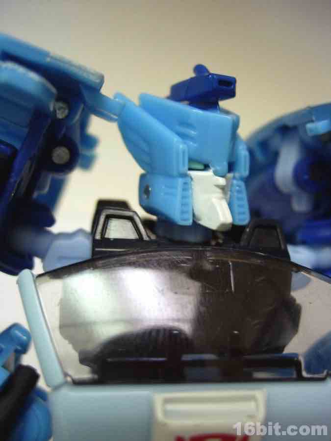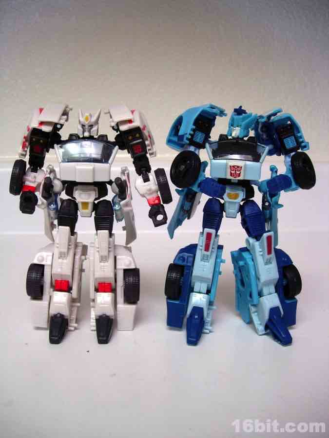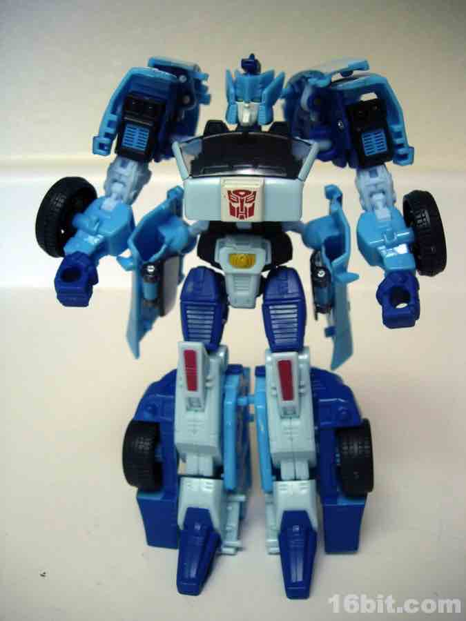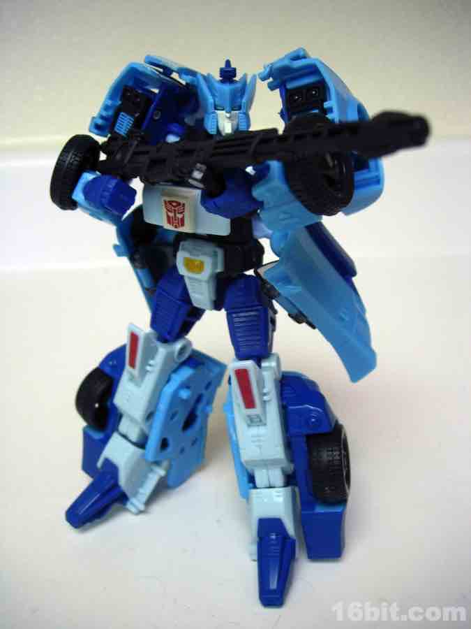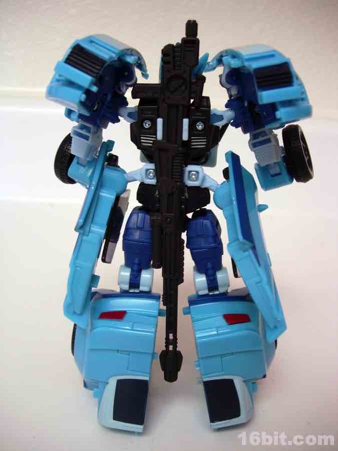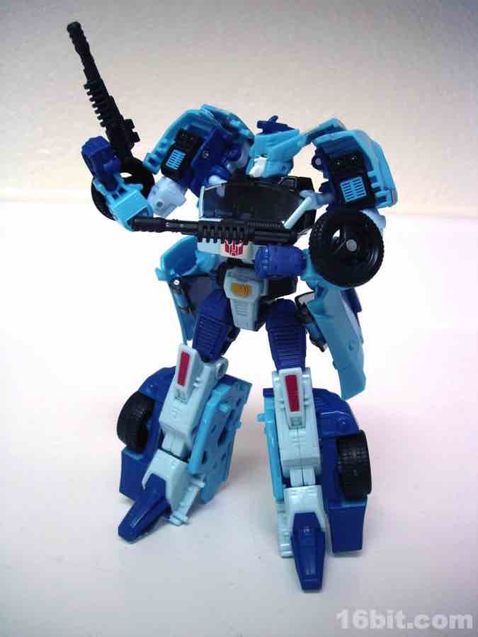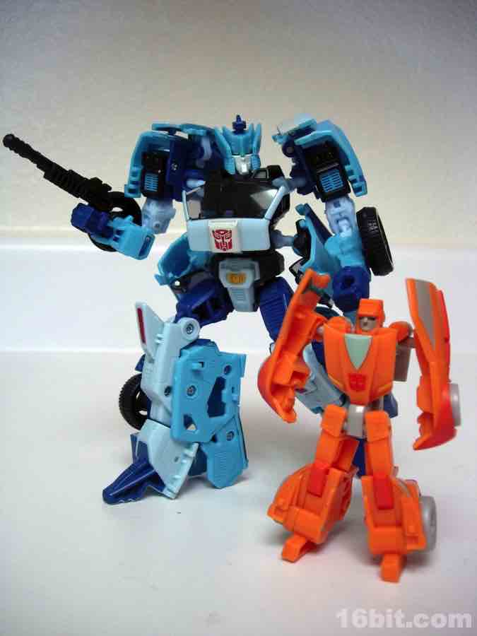 In car mode... well, it's a car. His pistols store in the car doors, his rifle under the drivetrain, and the wheels roll nicely and freely. It doesn't do much in car mode, but it did turn out nicely and looks fairly attractive. Be sure to keep an eye on it and keep it clean, as it seems the lighter blue paints may attract dirt and grime over time due to their unique texturing. I'd say go get this one-- you won't be sorry! (And get Drift too. They're both good.) Below, Transformers Universe Wheelie is shown for scale (and fun), and is not included with any release of Blurr to date.