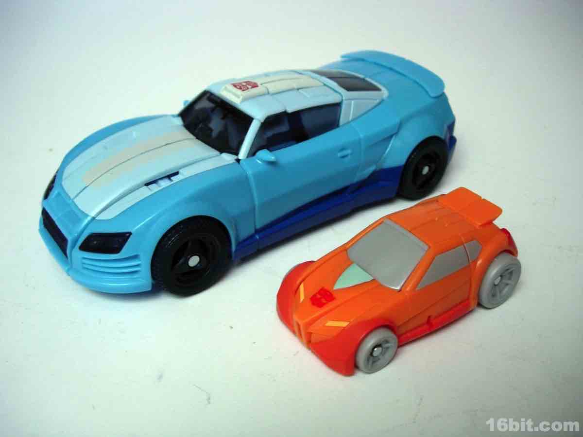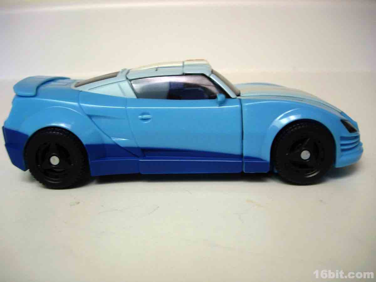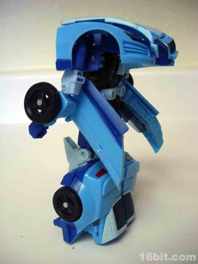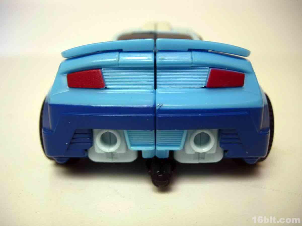In car mode... well, it's a car. His pistols store in the car doors, his rifle under the drivetrain, and the wheels roll nicely and freely. It doesn't do much in car mode, but it did turn out nicely and looks fairly attractive. Be sure to keep an eye on it and keep it clean, as it seems the lighter blue paints may attract dirt and grime over time due to their unique texturing. I'd say go get this one-- you won't be sorry! (And get Drift too. They're both good.) Below, Transformers Universe Wheelie is shown for scale (and fun), and is not included with any release of Blurr to date.