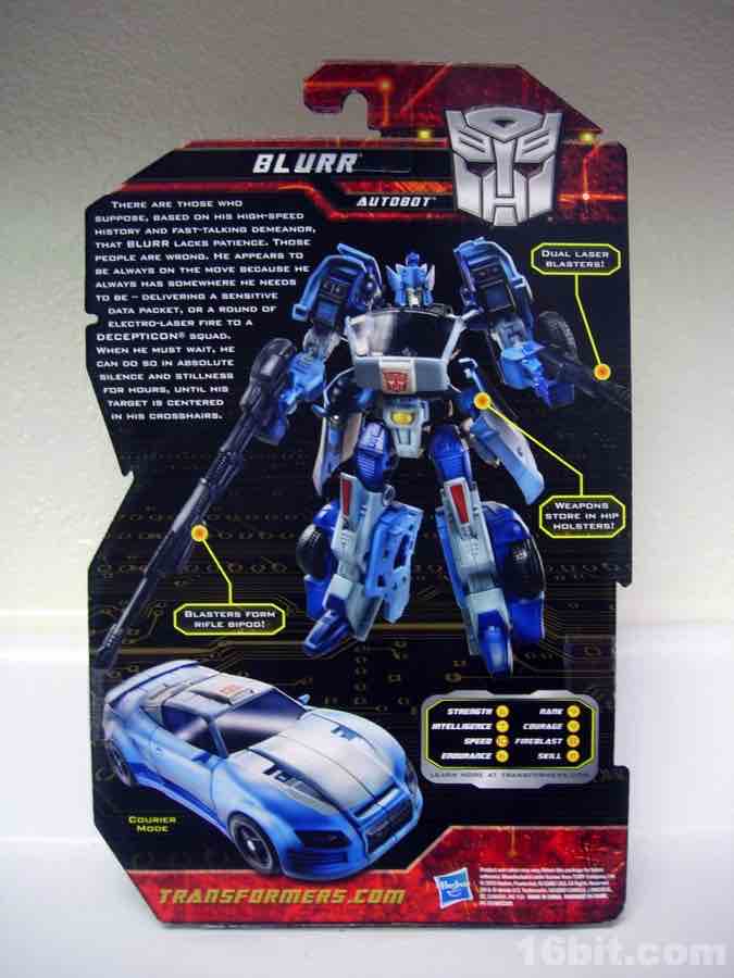 The figure's deco is also excellent, drawing inspiration from the past few decades of the line and (if you ask me) it looks even better than Japan's release in the Transformers United line. Generations Blurr has more variety in its blues, plus some more red and other colors to break up the design. In short, USA! USA! USA! (Also, the USA release is cheaper.)