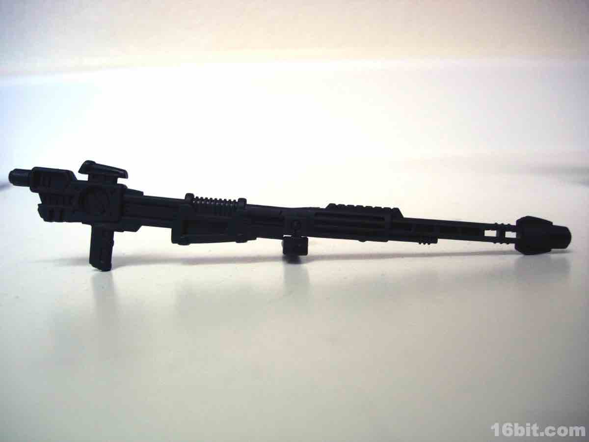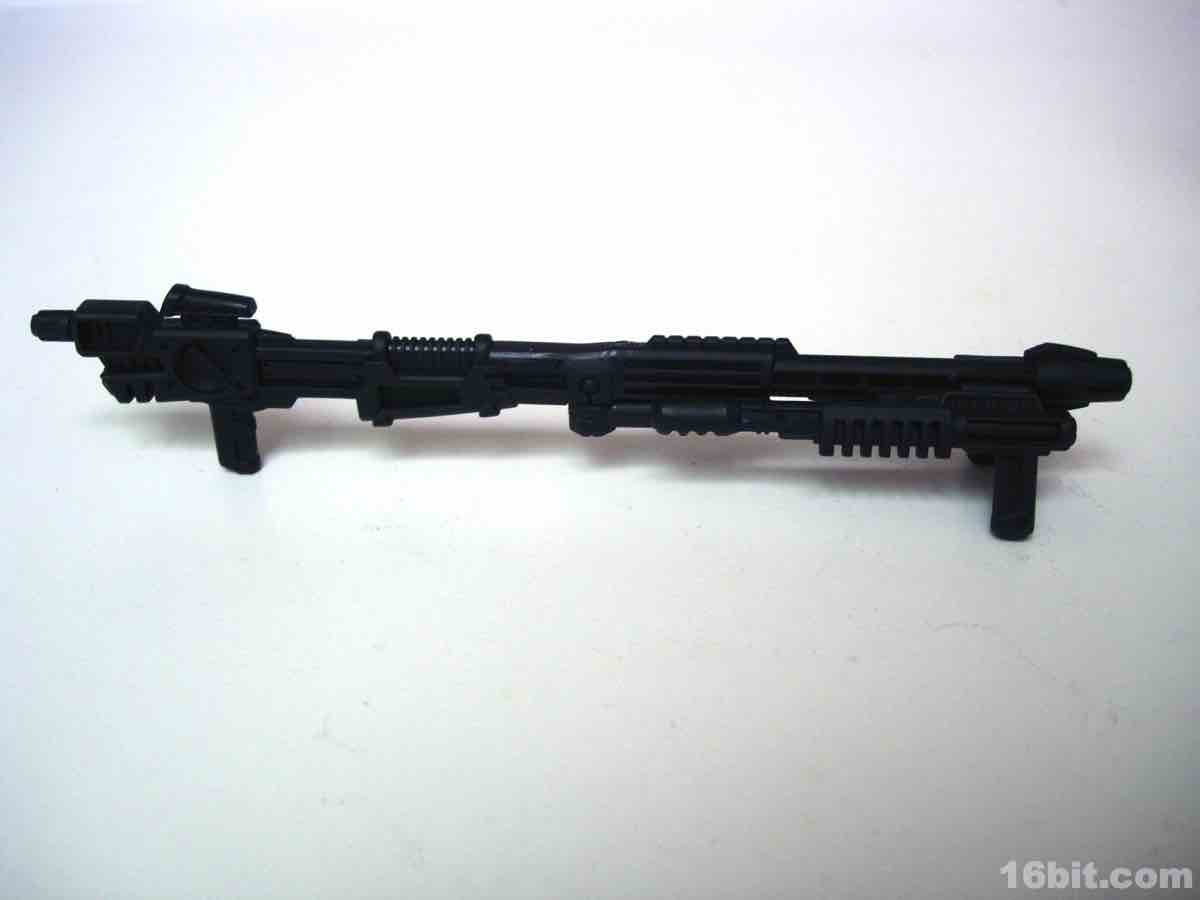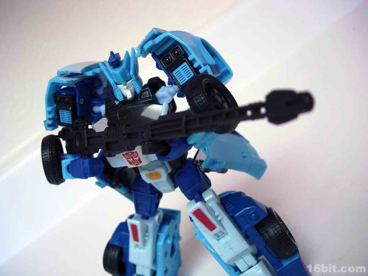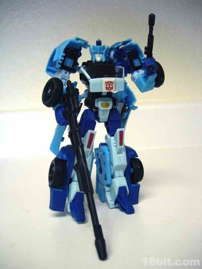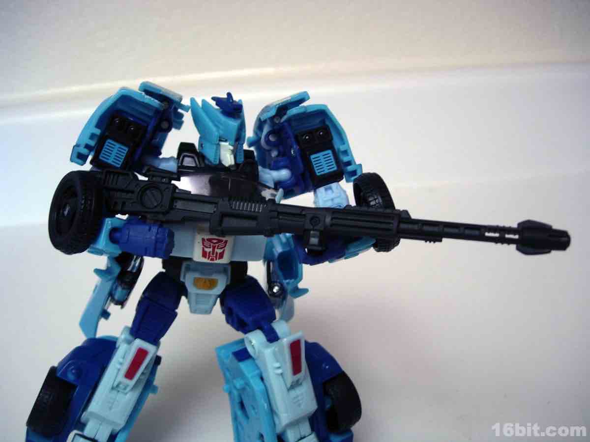 The original Blurr was a fast-moving, fast-driving good guy who bounced from planet to planet, getting himself out of (or in to) trouble. This time around he's been recreated as a sniper, complete with a giant sniper rifle which stores on his back (or under the car). If that wasn't enough, there are two small pistols included which double as a bipod-- they just plug into the sides. Now, this is a little ridiculous, as one barrel faces the enemy while two of the pistol barrels face right back at Blurr. Still, it looks good if you can ignore that, and is an astonishingly clever way to make the most out of a figure's weapons stash.