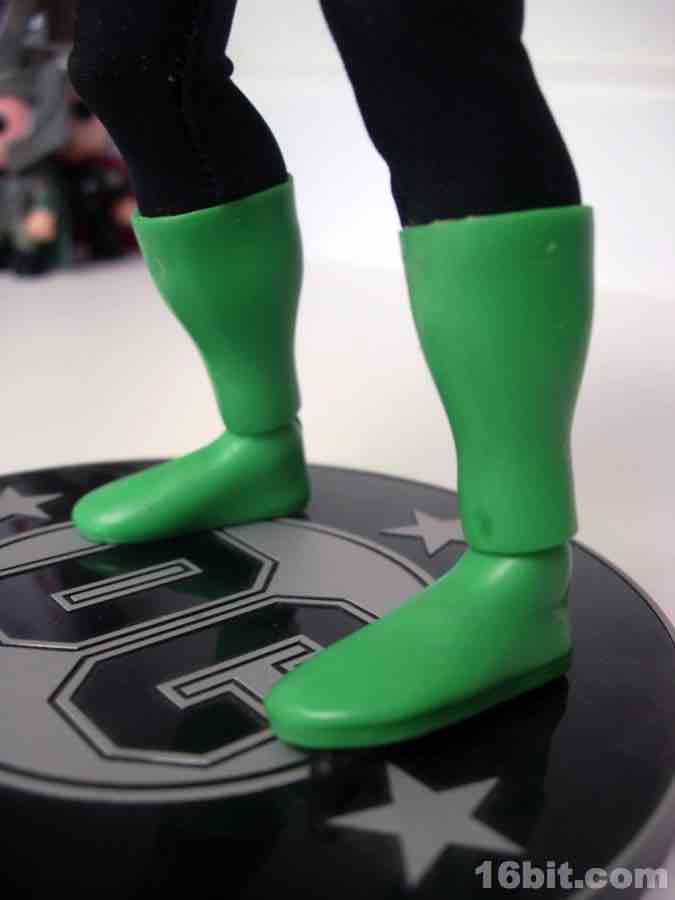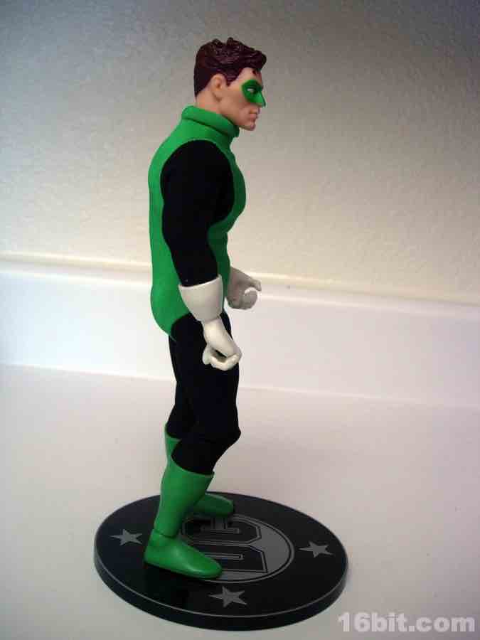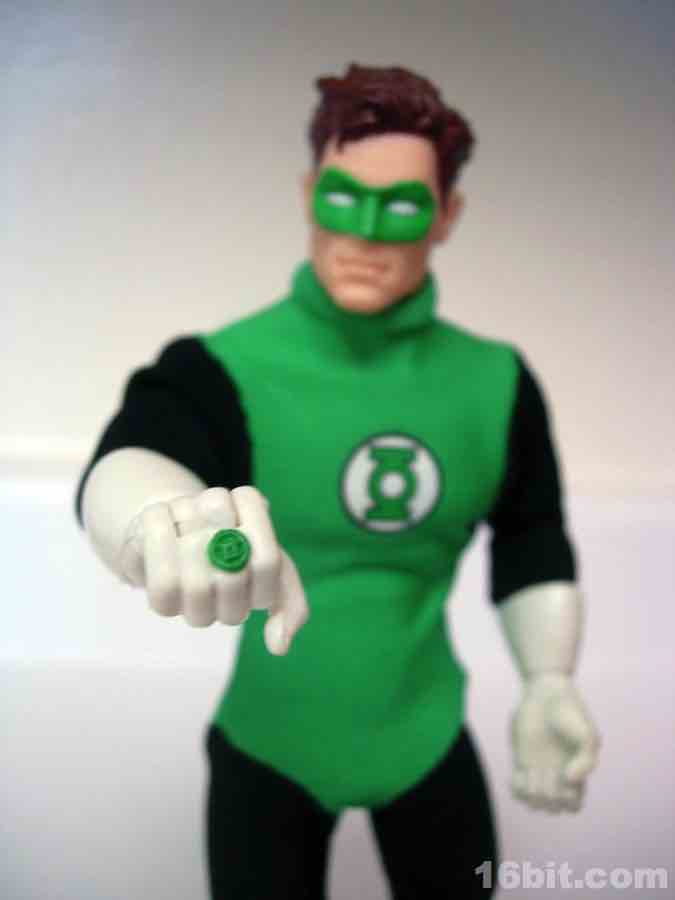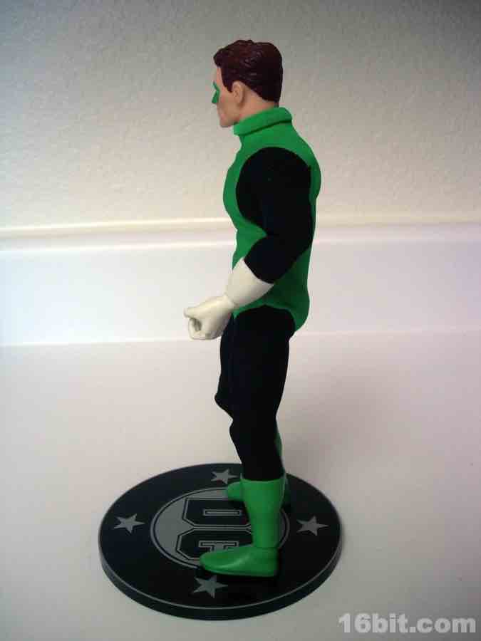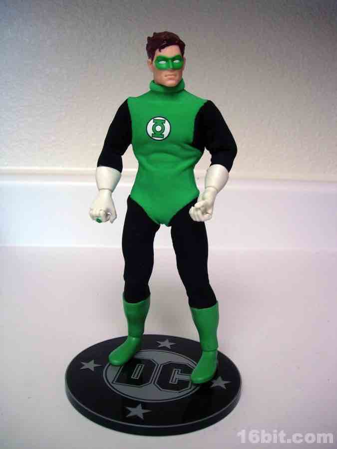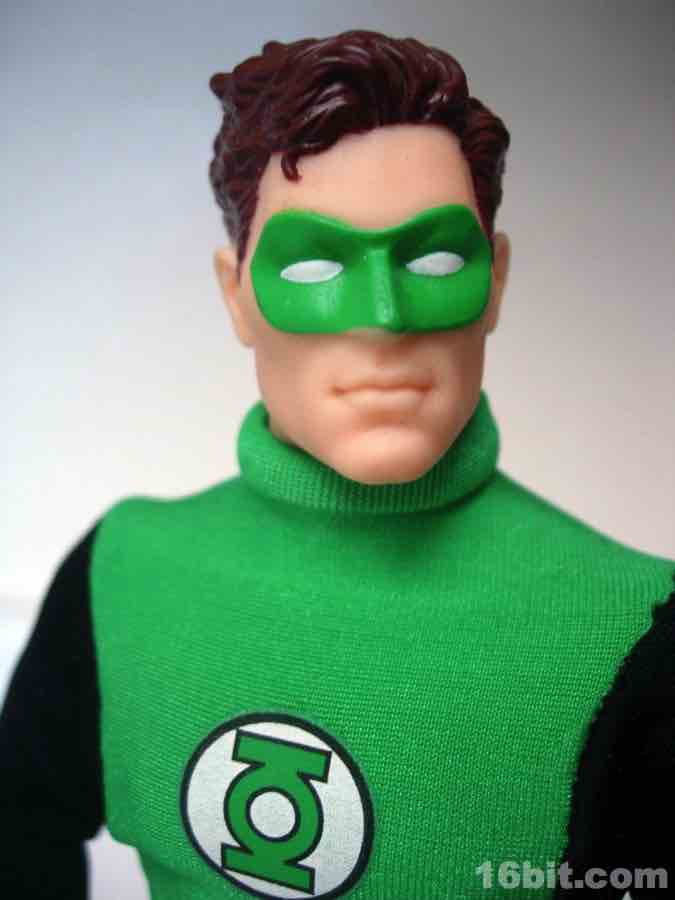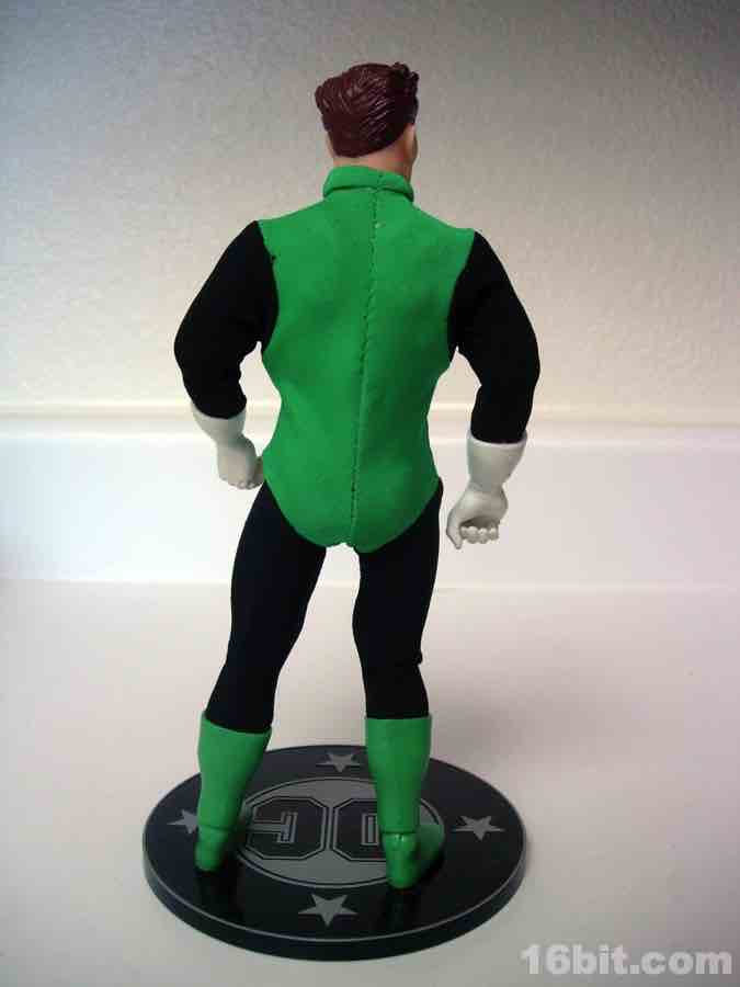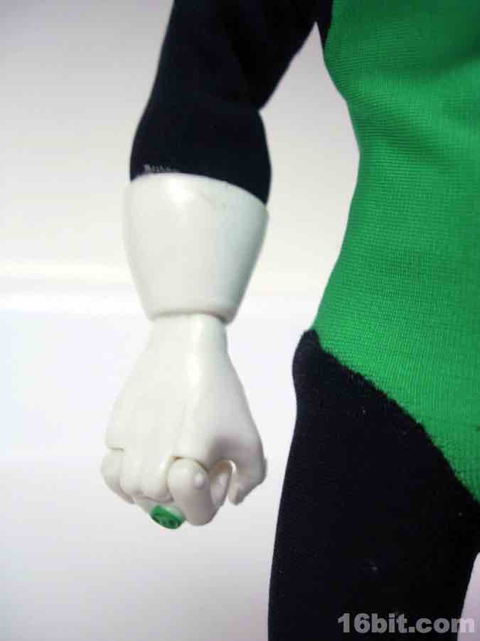 This big guy improved on the original Mego design in a lot of ways, not the least of which is abandoning the 1970s-style construction. The roto-molded head is kept, but the detail is superior and the deco is quite good. The costume isn't made of oven mitts and ill-fitting boots, this time around the boots are actually in multiple pieces and the ankles have ball joints. The wrists are articulated, plus the hands are jointed at the fingers for gripping accessories. (An actual green lantern was not included for the character to recharge his ring.) The stretchy cloth outfit clings to the figure, but not too closely-- he can still move around nicely, and it doesn't look like some guy wearing Hal Jordan's PJs.