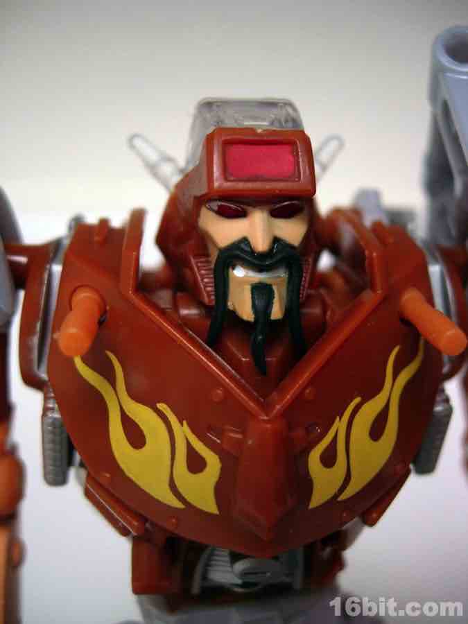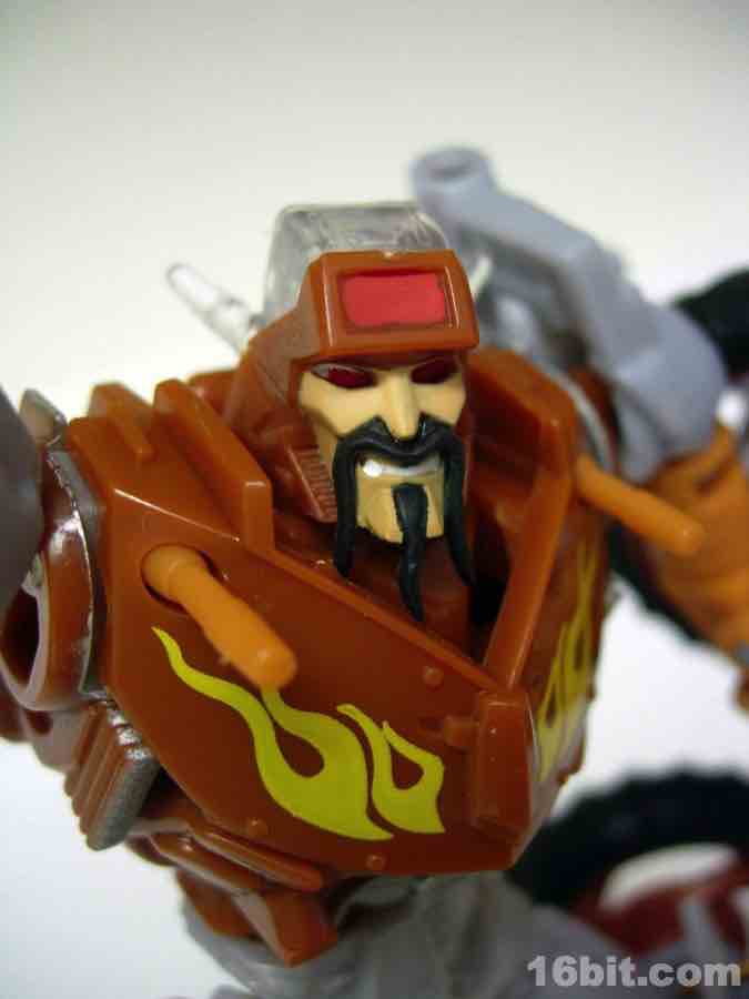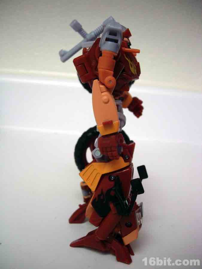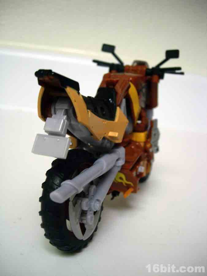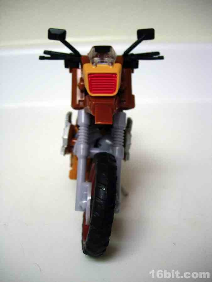 As a bike, it's pretty great. His head is hidden under the vehicle, there's a kickstand that pops down, and the wheels roll. There aren't a heck of a lot of thrilling details on here, but you'll note that the weapon becomes the exhaust pipe, and there's a fun little sculpted license plate holder in the back. Unlike most other Universe 2.0 or Classics releases, this figure does not have a wacky vanity plate. Perhaps Hasbro will do one on an upcoming repaint, which, to date, is not on schedule. (My prediction: Botcon 2012 or 2013.) The Japanese market already got a repaint of this mold called Scrapheap, and it has a new (and currently exclusive) head sculpt.
