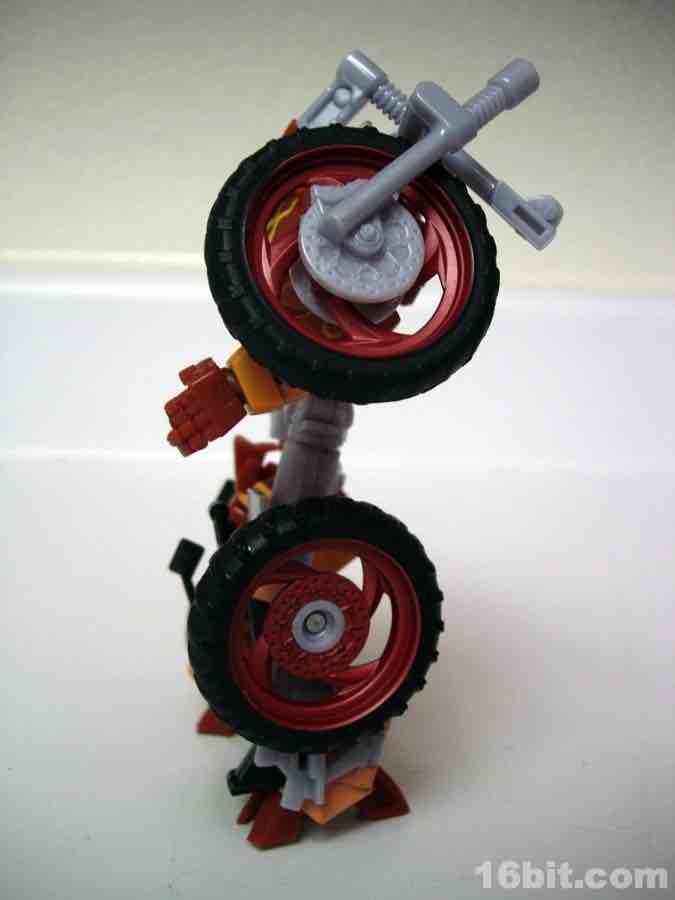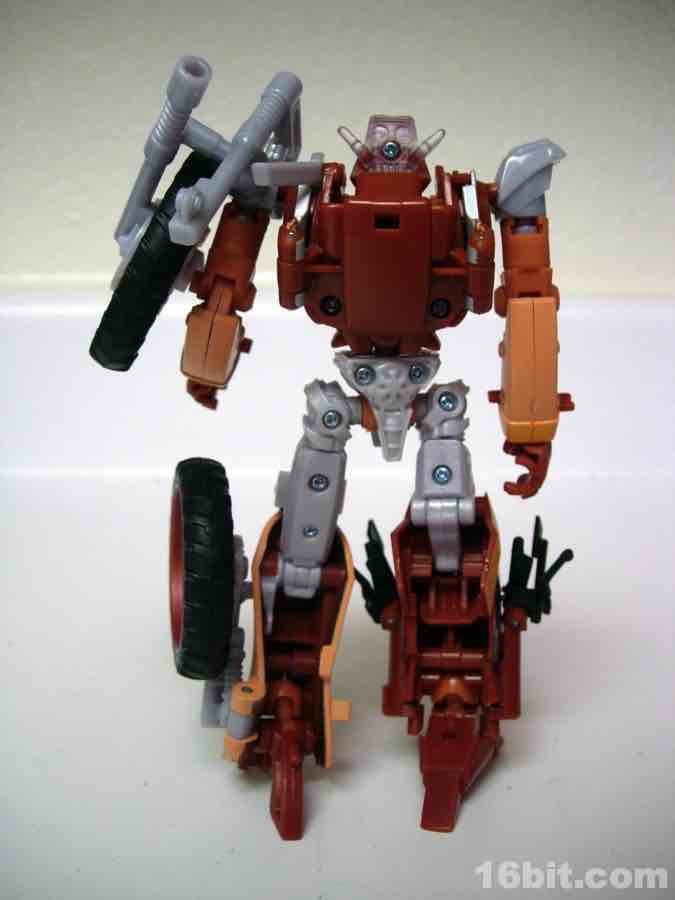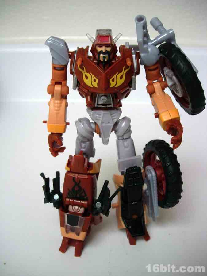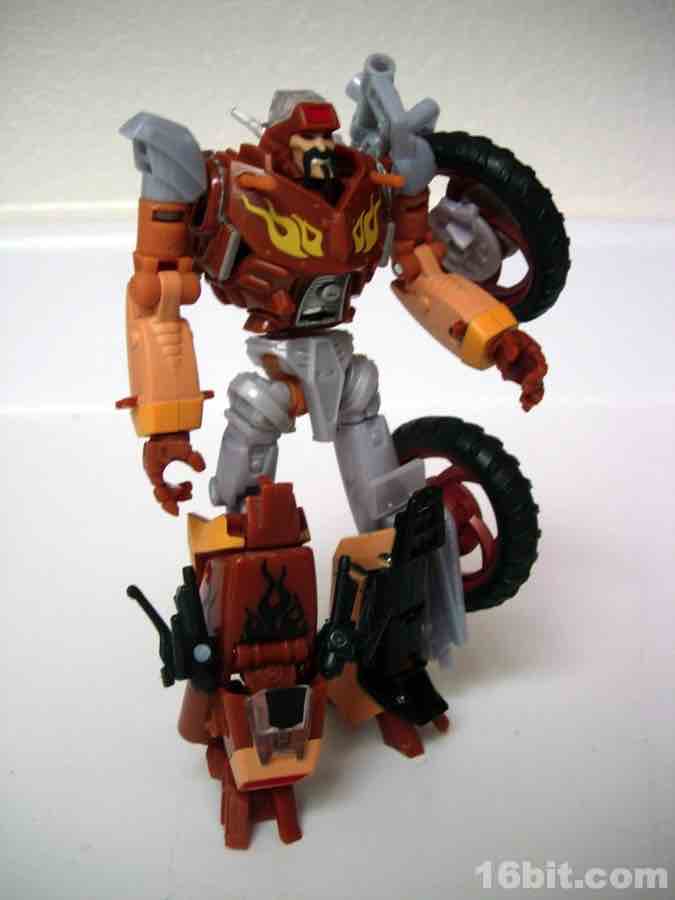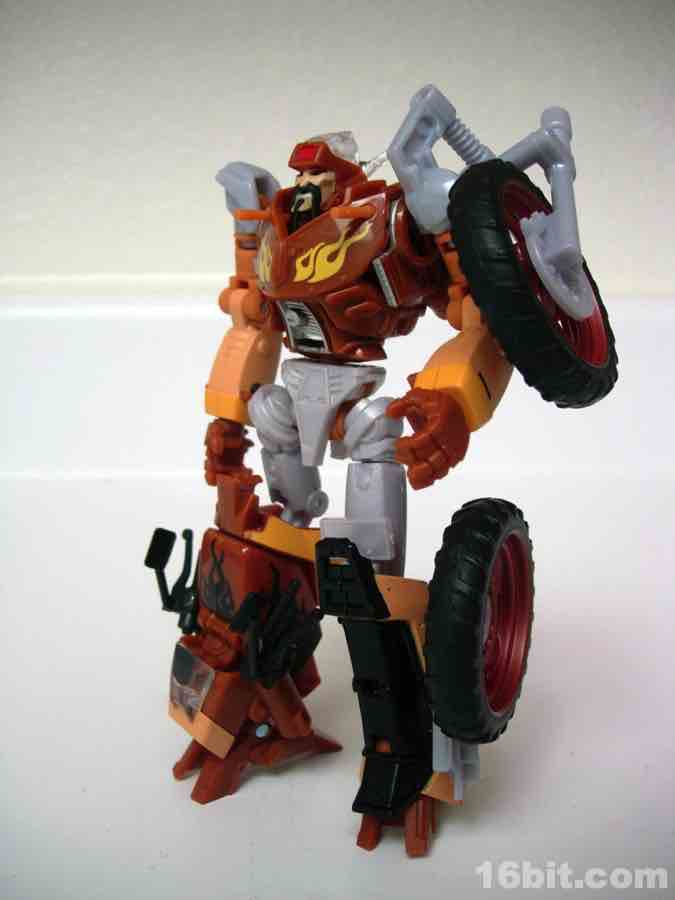 When transforming from the bike to the robot, the windshield, handlebars, and foot have a very specific order in which they must be moved-- the handlebar grips are a soft black plastic, but the things holding them in place have been known to snap off if you don't treat it properly. Be careful when transforming this toy and don't be too big of a man to consult the instructions-- they aren't perfect, but they may prevent you from snapping your new toy. I found the process of transformation to be somewhat unpleasant, so odds are my Wreck-Gar will never see motorcycle mode again. Good thing I took some pictures of it!