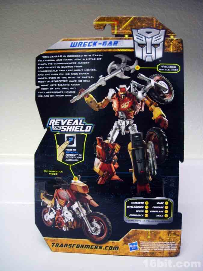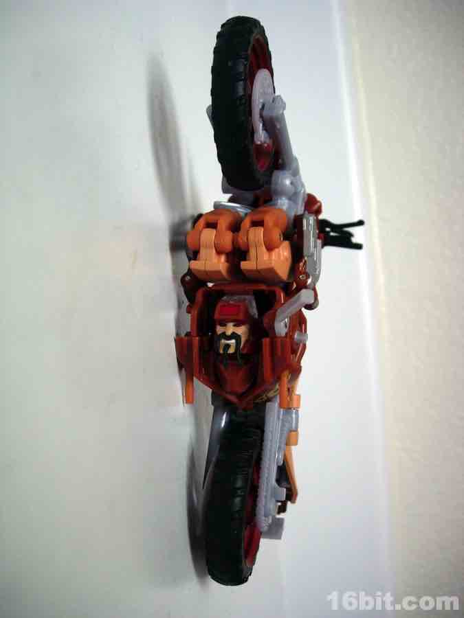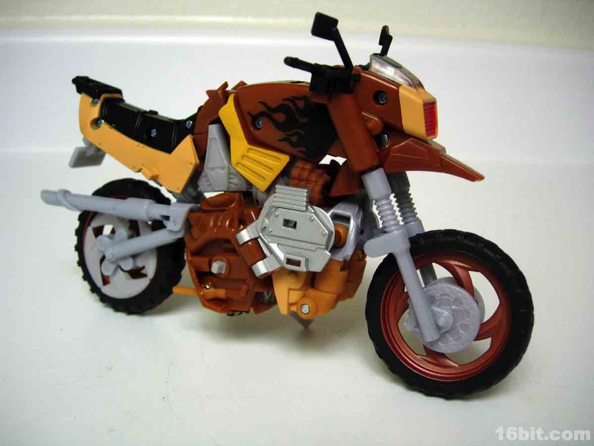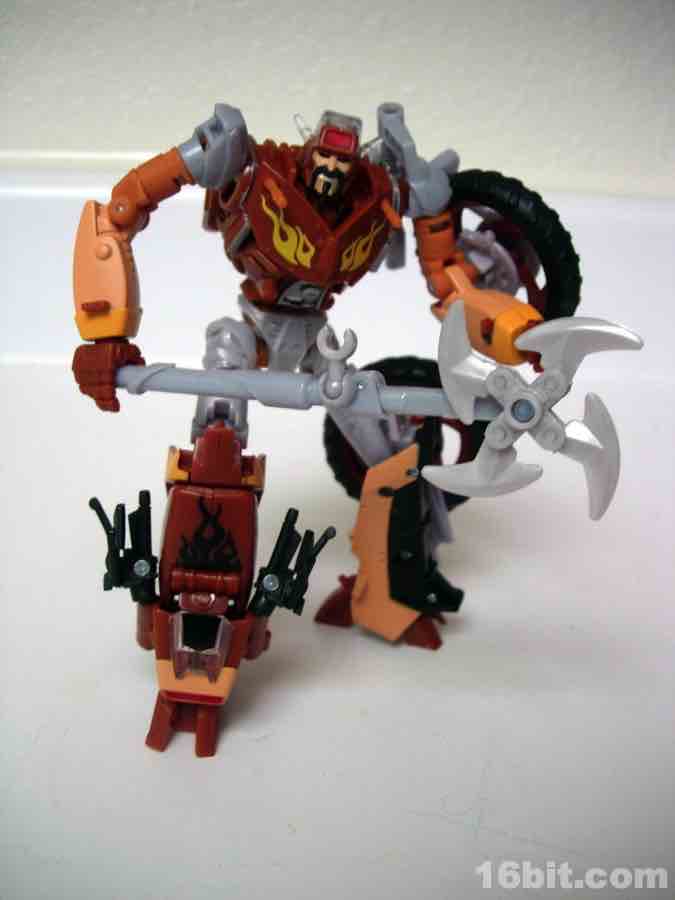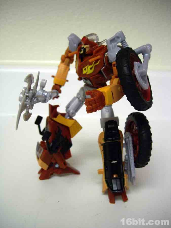 When transforming from the bike to the robot, the windshield, handlebars, and foot have a very specific order in which they must be moved-- the handlebar grips are a soft black plastic, but the things holding them in place have been known to snap off if you don't treat it properly. Be careful when transforming this toy and don't be too big of a man to consult the instructions-- they aren't perfect, but they may prevent you from snapping your new toy. I found the process of transformation to be somewhat unpleasant, so odds are my Wreck-Gar will never see motorcycle mode again. Good thing I took some pictures of it!