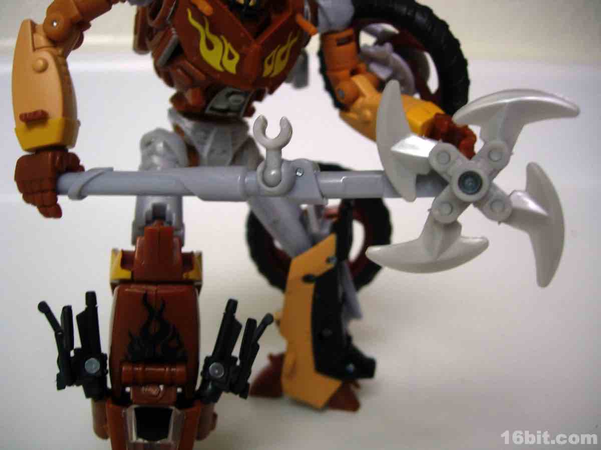 Item No.: Asst. 98447 No. 28571 Manufacturer:Hasbro Includes:Spiked club Action Feature:Transforms into bike Retail:$12.99 Availability: Janaury 2011 Other: Be careful with this one