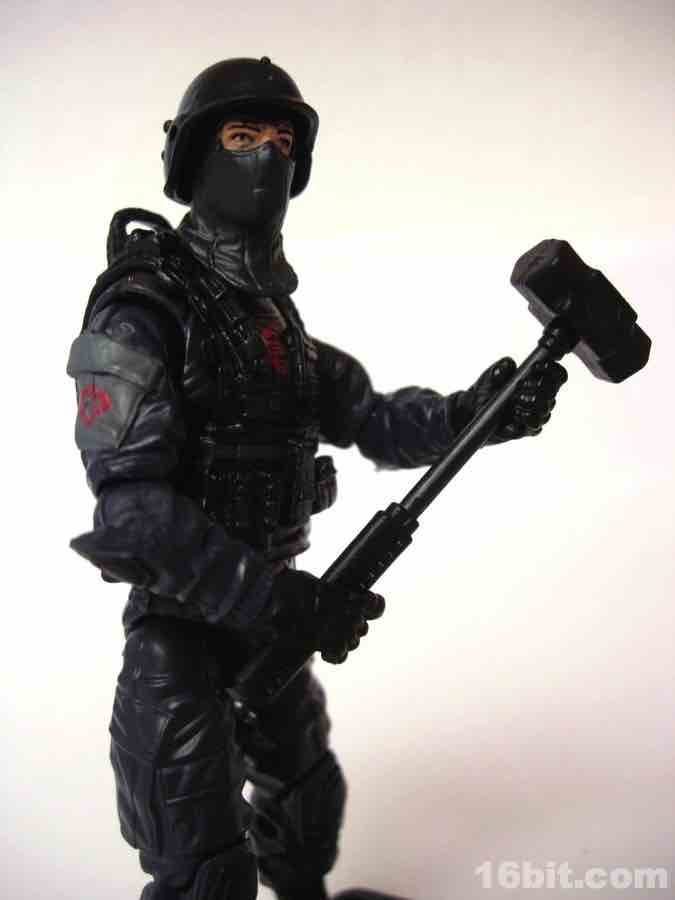 Articulation is largely standard modern Joe fare, with about 16 joints plus bending and swiveling at the wrists. This is more and more common in this line, but it's essential in your getting the most out of his many accessories, like a friggin' sledgehammer and numerous firearms. Each weapon is sculpted nicely, but the real surprise is how much paint has been applied to these guns-- little silver and red markings were added to some, giving the traditionally single-color accessories much more life and also giving Hasbro a reason to charge more for these things. With all the extra stuff, and the extra paint, it's hard to argue that it isn't worth it.