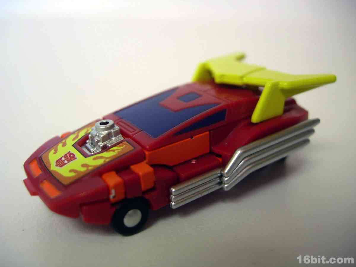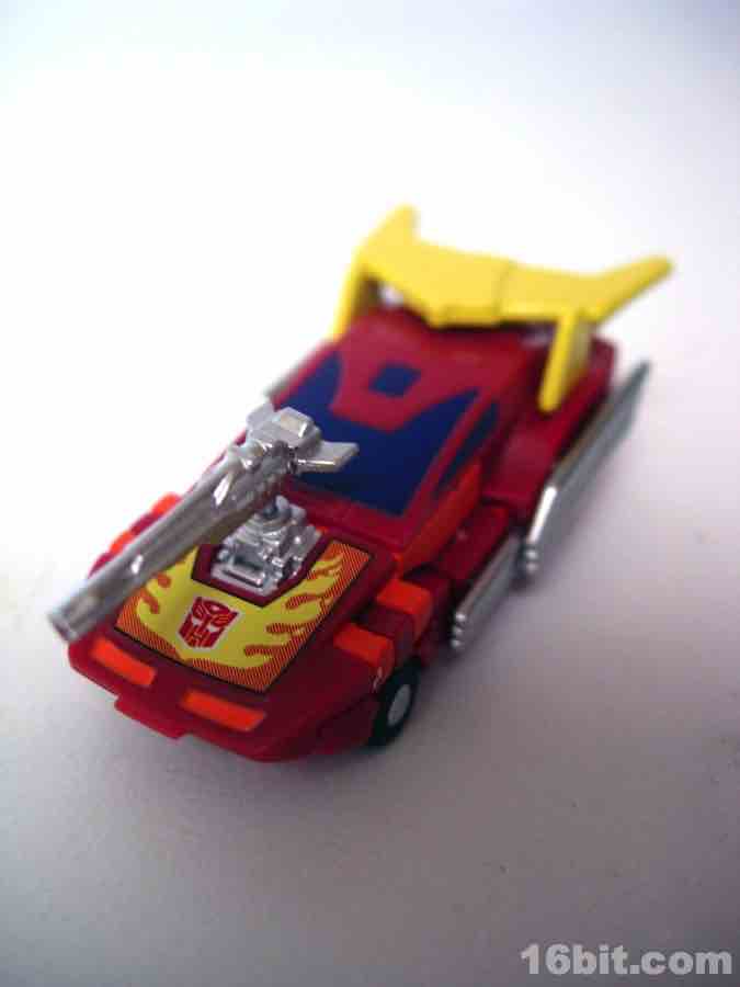 In car mode, well, it looks like Hot Rod. The wheels don't spin, but the "futuristic" vehicle is accurately replicated by the designers. The transformation is also quite faithful to the original, with chest-flipping and lots of moving and twisting parts. If you can transform the original, you know how to transform this one. Most of the other toys in the line are 1984 and 1985 characters, few movie introductions were given the "smallest" treatment-- sadly, there's no Galvatron or licensed, completed Ultra Magnus. (You can get a white repaint of Prime's cab as "Ultra Magnus," though. Knock-offs of that one are widely available.)