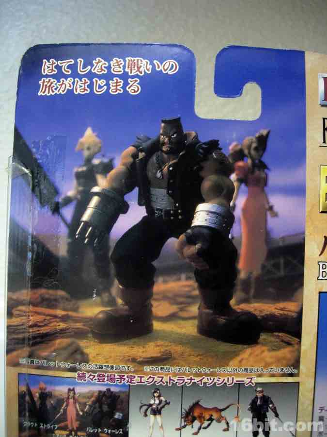 Mr. Wallace has the unfortunate distinction of being one of the few forgotten characters from this landmark game. Cloud, the girls, Vincent, and Sephiroth all got a lot of love in the years to come, but Barett and Cid? Not so much. (A Cid drawing is even shown on the cardbacks-- no such BanDai figure ever saw release.) While other Barett collectibles, like key chains, were released, this may be one of the best you can buy. It's a big, sturdy figure with limited articulation at the shoulders, wrist, gun, neck, and hips.