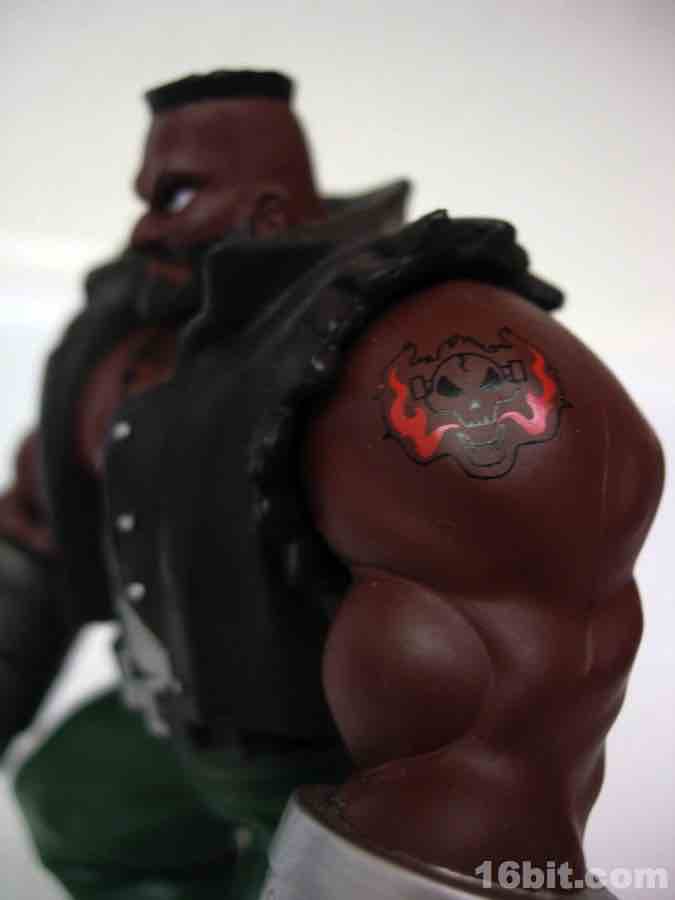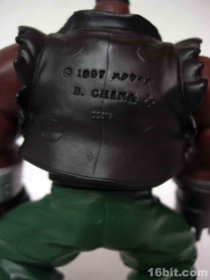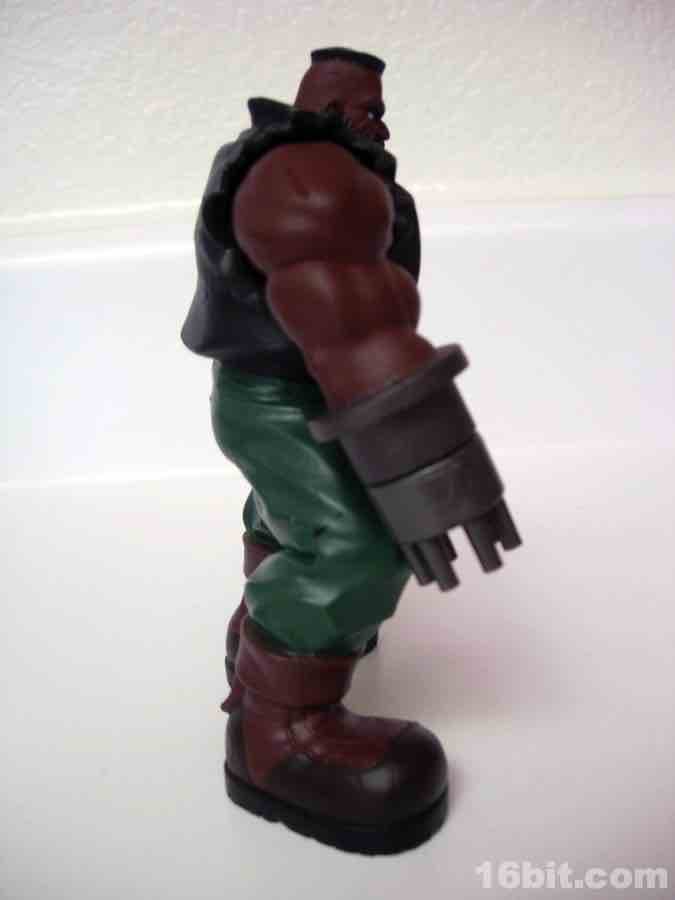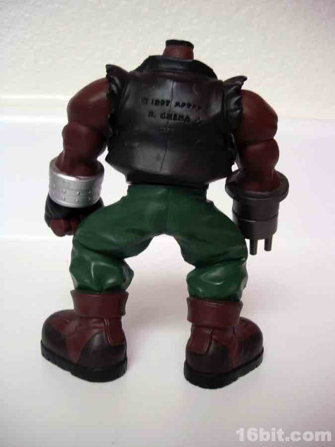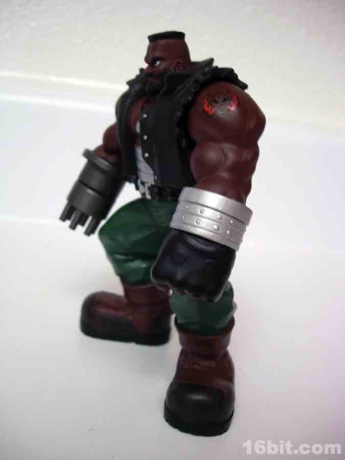 While the sculpt isn't perfect, it's quite good-- he looks like a tough character, complete with tattoo and a rotating gun for an arm. Generally speaking, people with gun arms get the benefit of the doubt when being called "tough." He stands about 4 1/2 inches tall, and stands quite well-- he's got giant booted feet so there are few to no problems getting him to stay standing. Other figures in the line included stands to assist them in not faceplanting on the floor in front of your toy shelves.