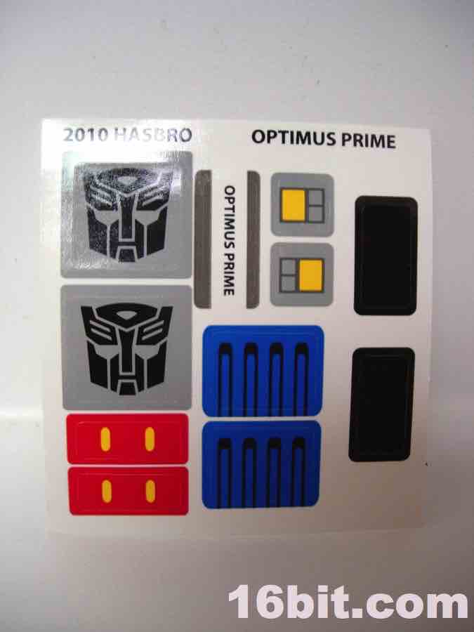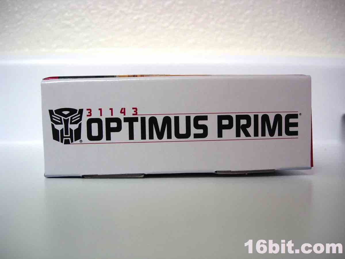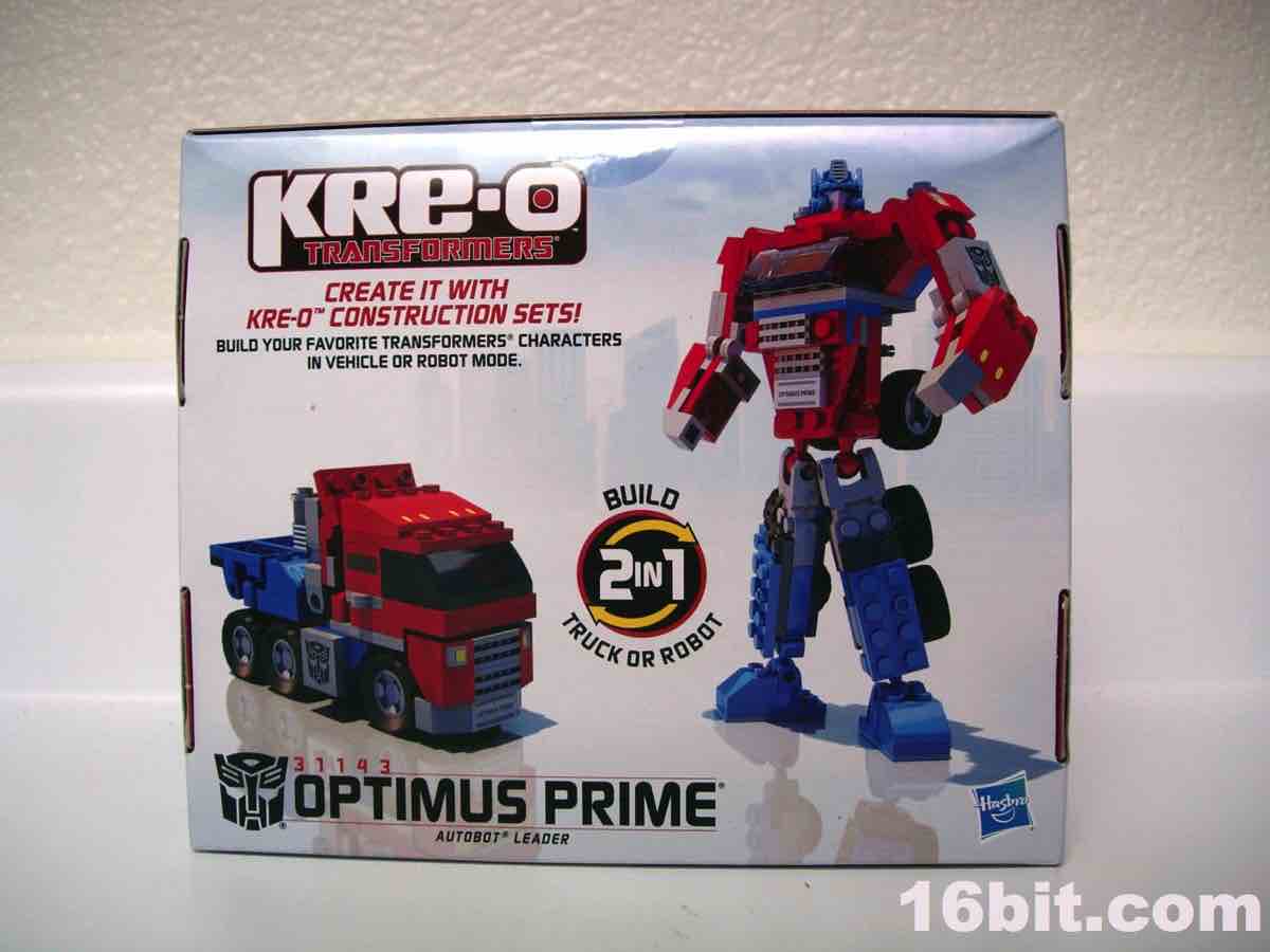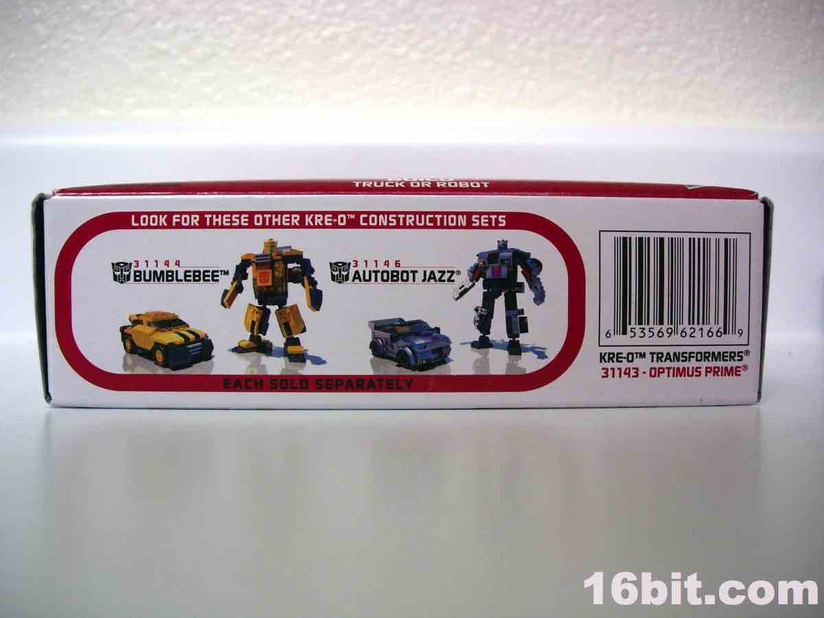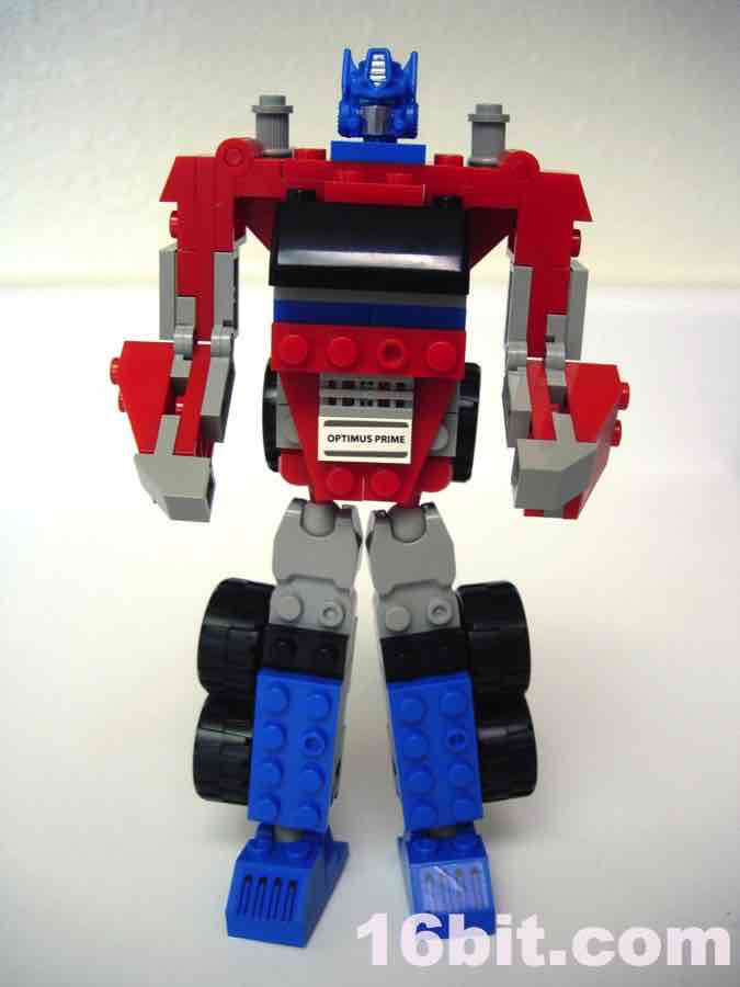 As a toy figure, the 6 3/4-inch Optimus Prime robot looks OK-- it's clearly meant to be a "snack" product to try out the bricks and see if you like them. From the side or the back, it looks great. From the front, it looks like something I might have built on my own with slightly wonky proportions and an iffy windshield. Rather than painted elements, Hasbro opted for stickers-- this was something LEGO has done on and off, depending on the year, but most of the sets I've picked up have very few labels. Prime has several, including an odd one that reminds me of the toys in the 1990s in that there's a nameplate which goes right over his crotch. Which I guess is good if the ladies are trying to figure out which anonymous robot just took them home from a bar. Kids, take a lesson from Op here, tattoo your name over your groin.