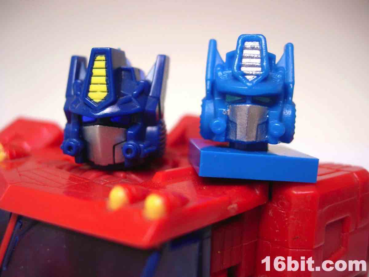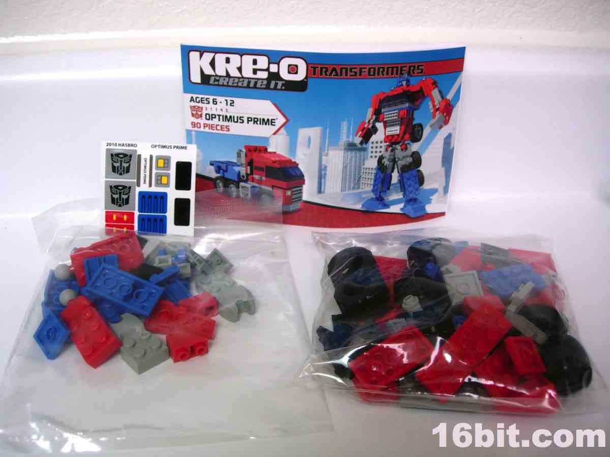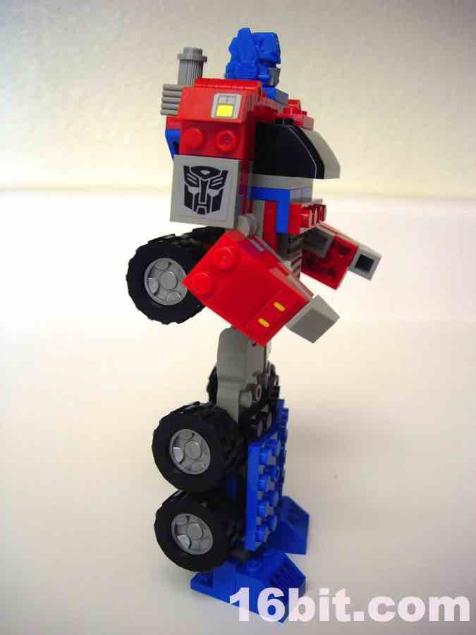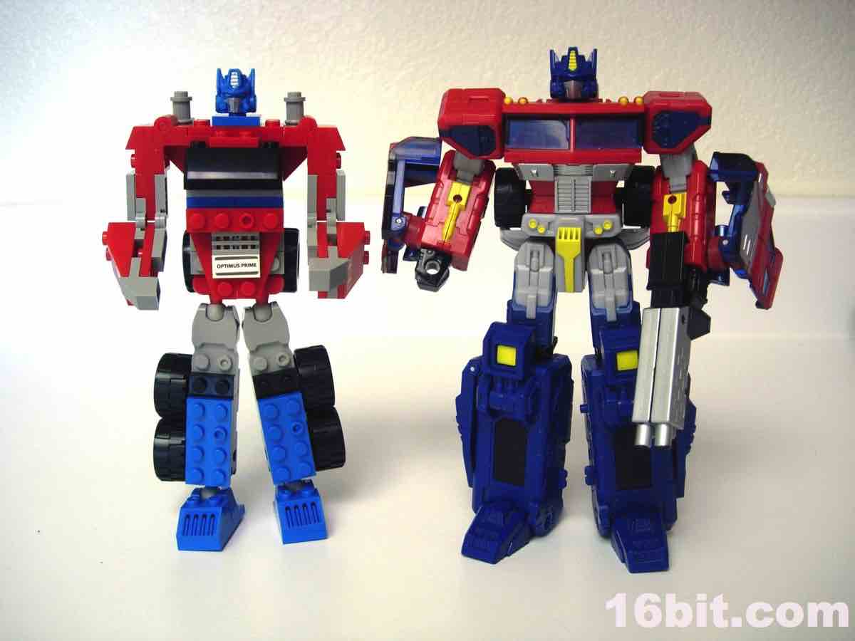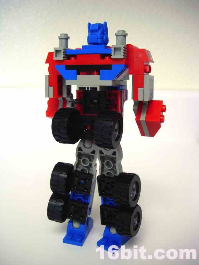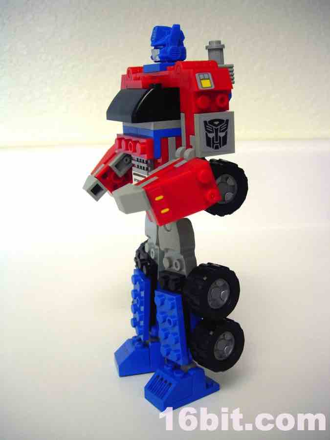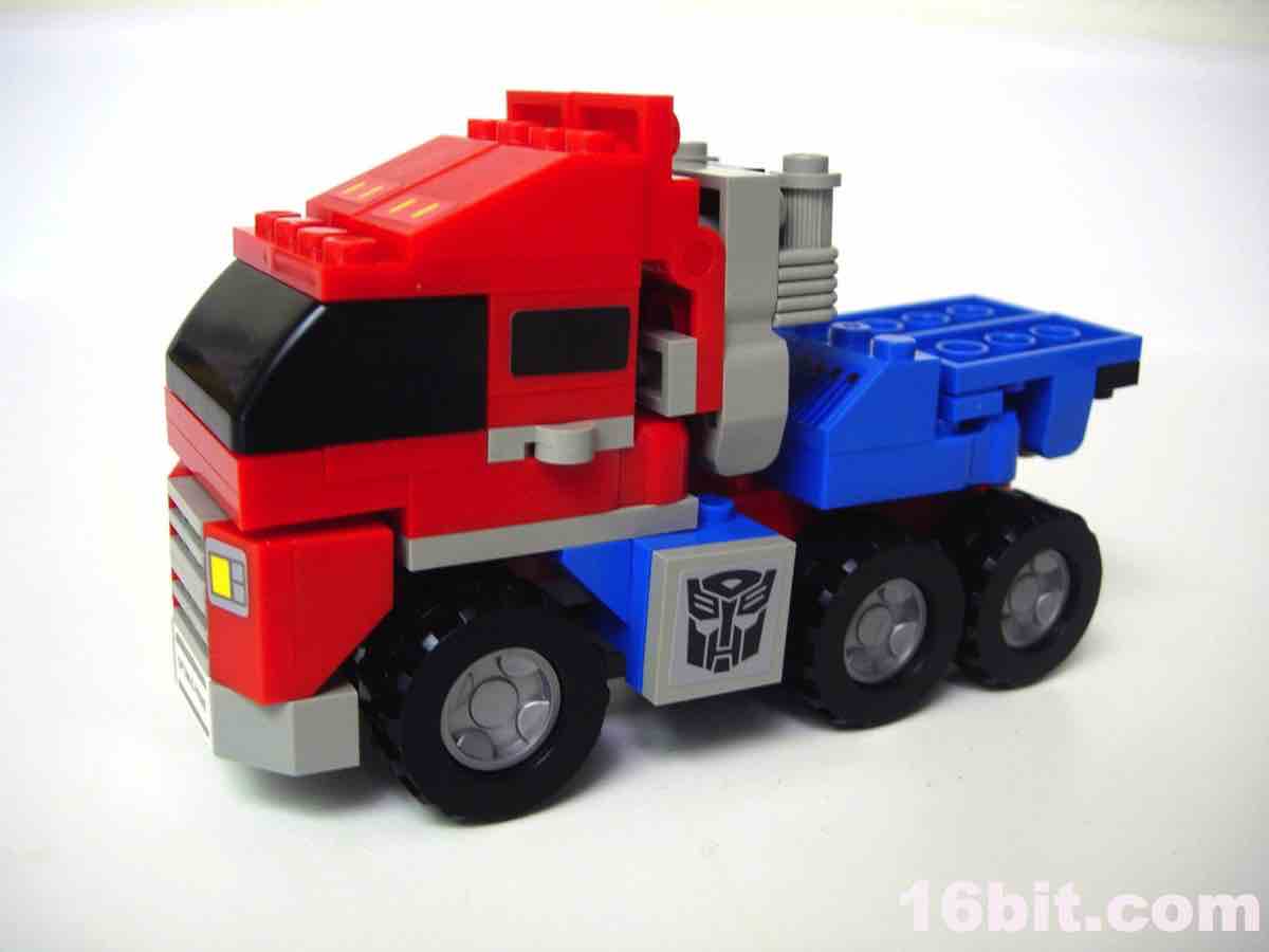 Hasbro spent a lot of time and money trying to develop bricks that are as LEGO-ey as humanly possible, from the look and feel of the instructions to the ABS plastic bricks. Aside from the lack of LEGO branding, the bricks really do feel like LEGO's pieces, and the rumor is that Hasbro paid good money to hire one or more of LEGO's developers to ensure their brand was as close to LEGO-- the real thing-- as humanly possible. They come real close. The pieces feel right, and look right except for the odd hollow stud on certain bricks giving the toys a more uneven-- but probably more easily copyrightable-- look and feel. The tires roll nicely, and the head is slightly rubberier than the rest of the pieces, and-- most interesting of all-- seems to be a scaled-down version of the Classics 2006 Optimus Prime toy. Aside from the head, the pieces look and feel like typical LEGO pieces, more specifically, older ones. This kit does a great job of replicating a sizable Optimus Prime figure with jointed hips, ankles, elbows, and shoulders, but the movement is somewhat limited due to the hinge joints used in places. Ball-and-socket joints on the hips and ankles give the figures a Bionicle-like movement, but it's not as smooth due to the rubbery coating on the ball part of the joints.