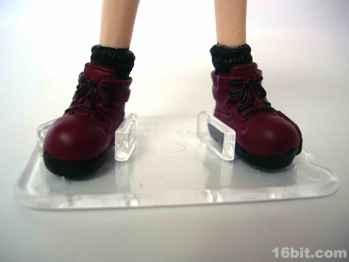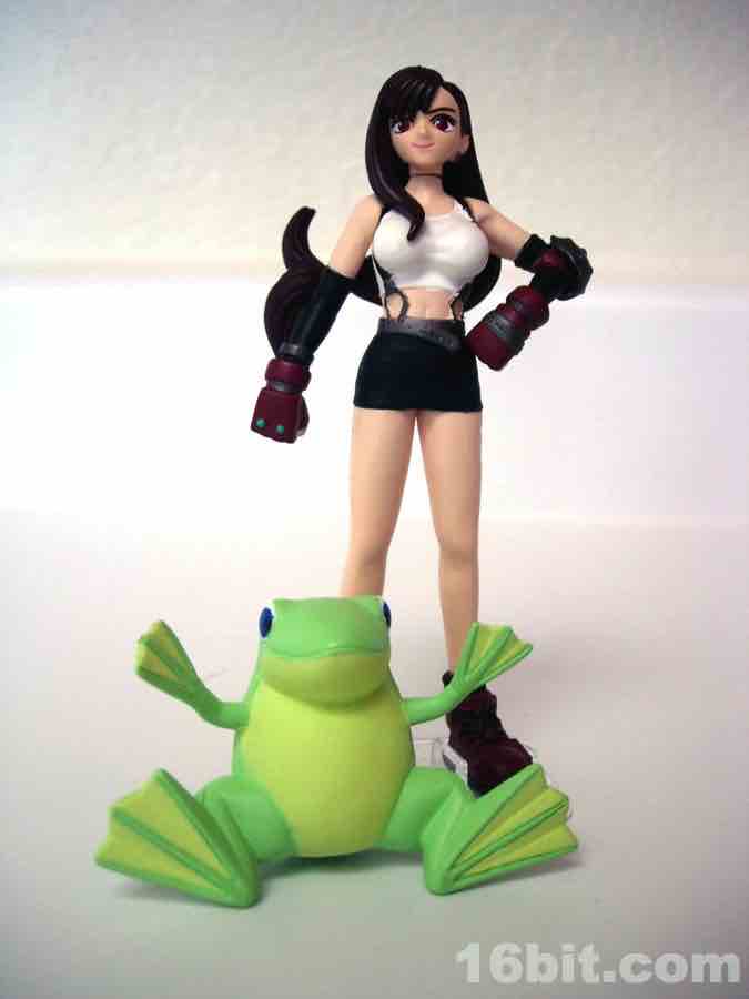 Later releases of the character were far better, and to be honest a better face would have made this an excellent figure. Her accessories help make her a little nicer, specifically as her clear display stand allows her to keep upright and not nosedive off your desk or shelf. The little raised tabs hold her boots in place, and you won't have to worry about a suicidal dip off the TV or anything like that. She also comes with a frog figure, presumably meant to represent a character which was turned into said amphibian. (Square games frequently allowed characters to be transformed into frogs or pigs.) He's a cute little guy and a nice extra-- because the Tifa figure, by herself, really isn't overwhelmingly impressive.