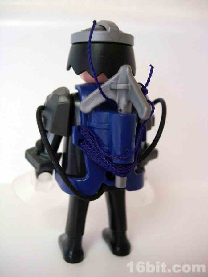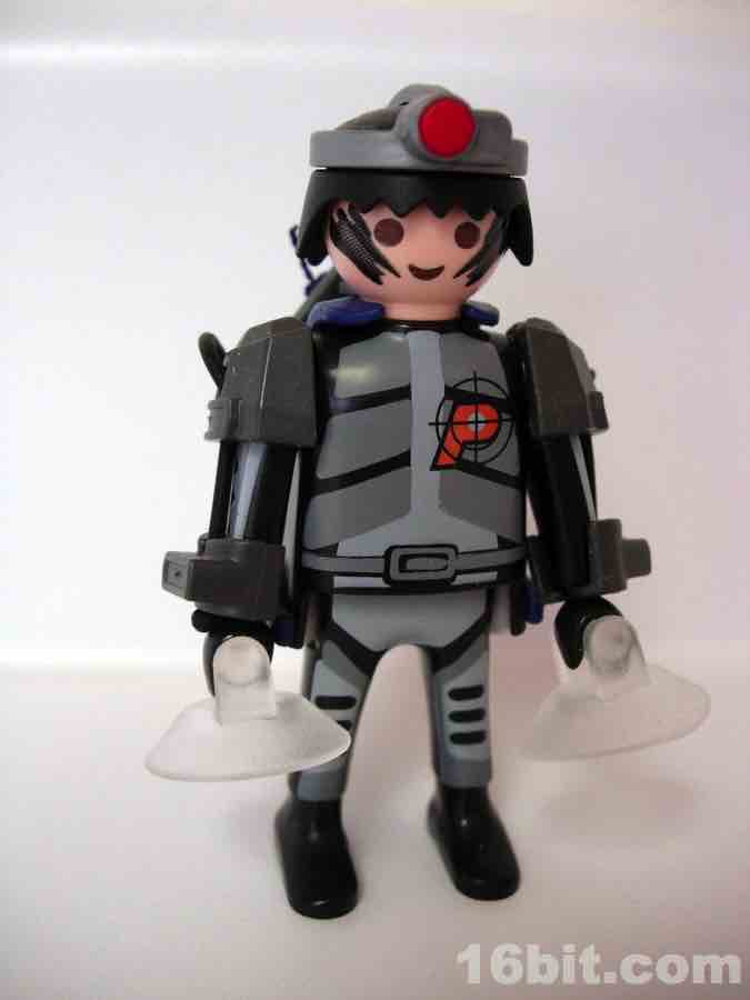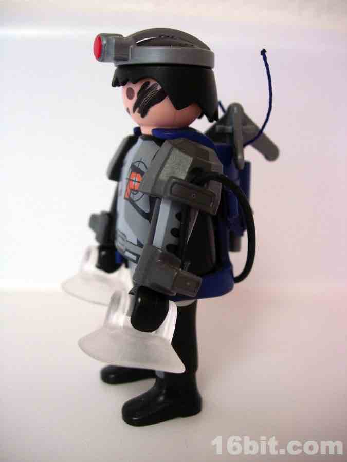 The figure is, as always, a standard Playmobil buck with some new enhancements in deco. Some great face paint was added, and a highly detailed spy outfit (although not at all subtle) makes this more of an action figure than a traditional Playmobil toy. Added elements give the figure a little more weight, and the accessories more or less qualify as some form of action feature. There are no firing rockets, but you can use the grappling hook to hang from things, or the suction cups provide limited ability to hang around on a window. (These things are rarely perfect.)