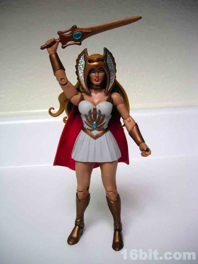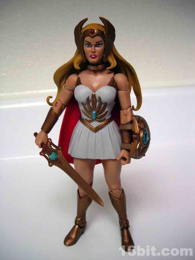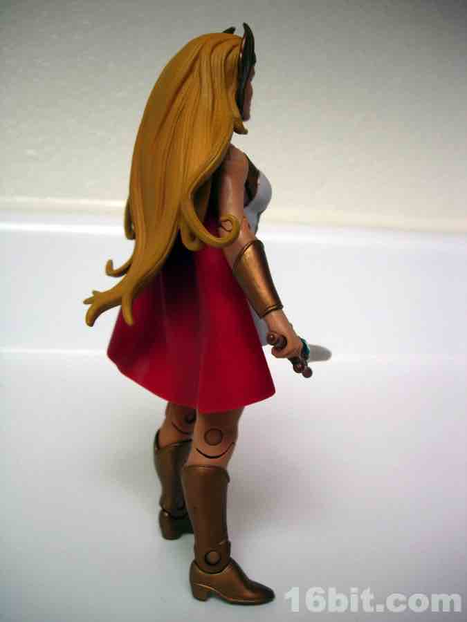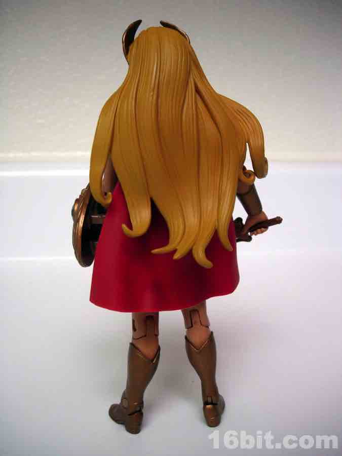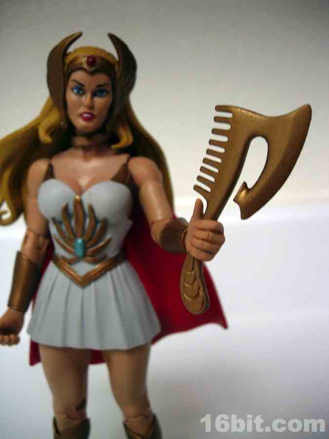 This is Adora, He-Man's twin sister. Fabulous powers were revealed to her, blah blah blah, and now she's She-Ra. "For the Honor of Grayskull!" This action figure was one of the first Masters of the Universe Classics toys to adapt a Princess of Power doll into the action figure format, although some vestigial elements remain. Like her comb axe weapon/hairstyling tool. She-Ra no longer has rooted hair, but should anyone try to attack her while she is doing said hair, she can cut you.