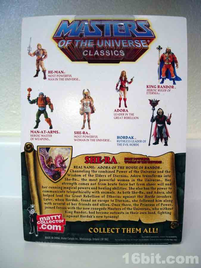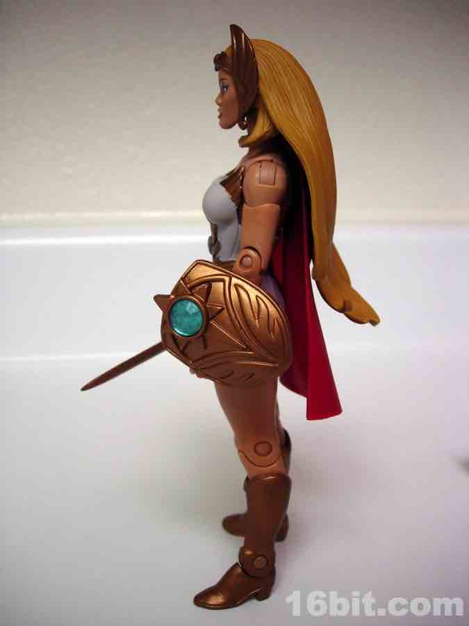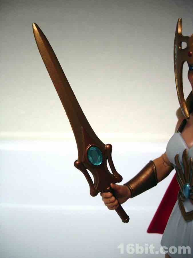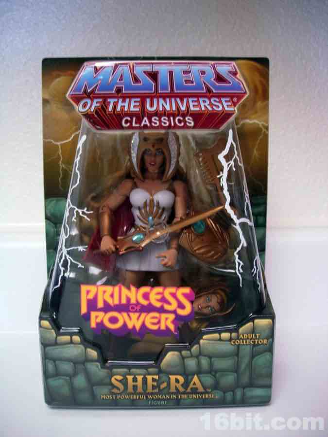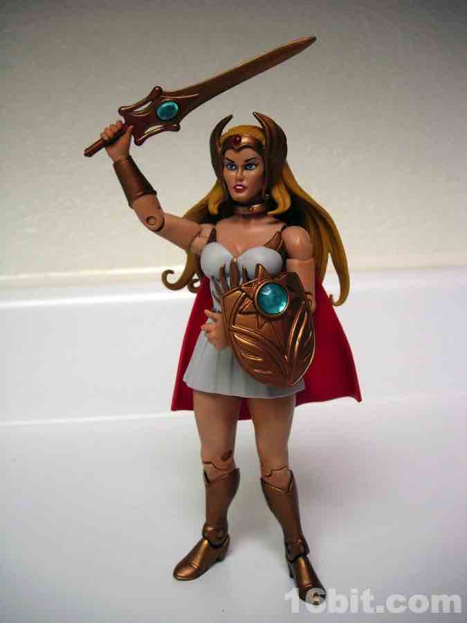 This is Adora, He-Man's twin sister. Fabulous powers were revealed to her, blah blah blah, and now she's She-Ra. "For the Honor of Grayskull!" This action figure was one of the first Masters of the Universe Classics toys to adapt a Princess of Power doll into the action figure format, although some vestigial elements remain. Like her comb axe weapon/hairstyling tool. She-Ra no longer has rooted hair, but should anyone try to attack her while she is doing said hair, she can cut you.
