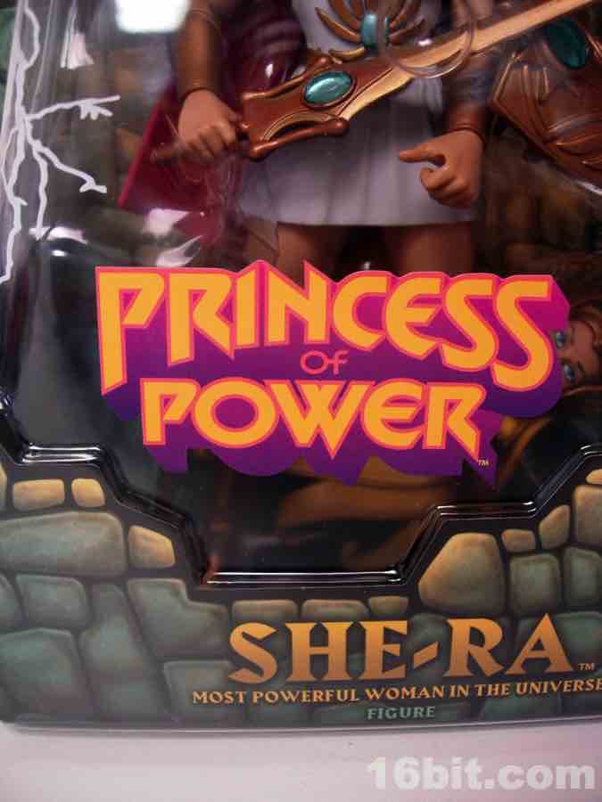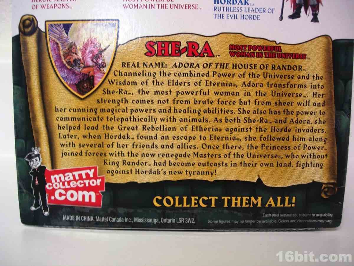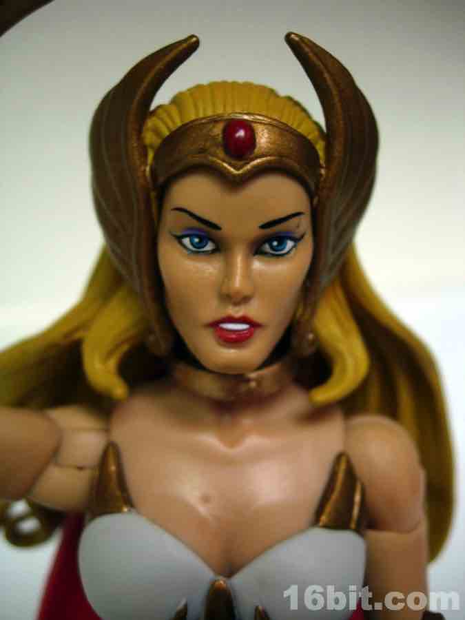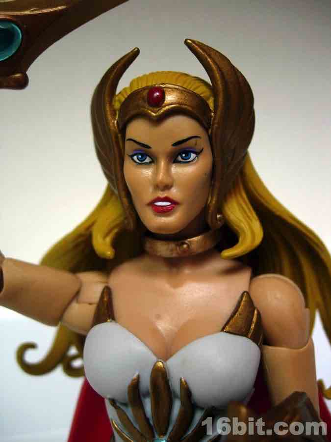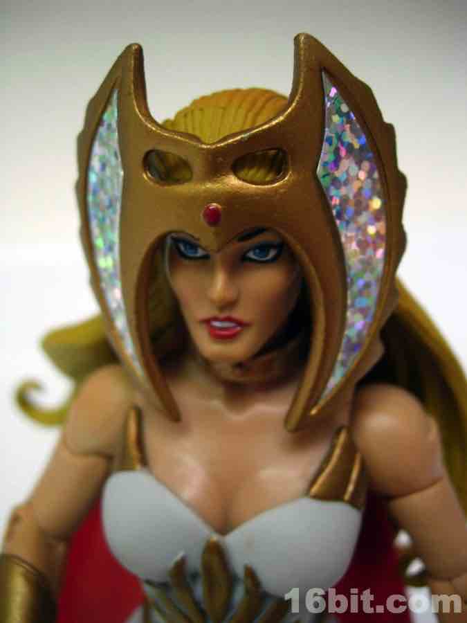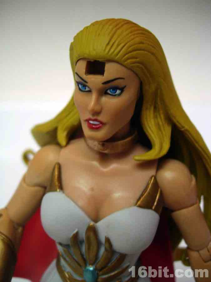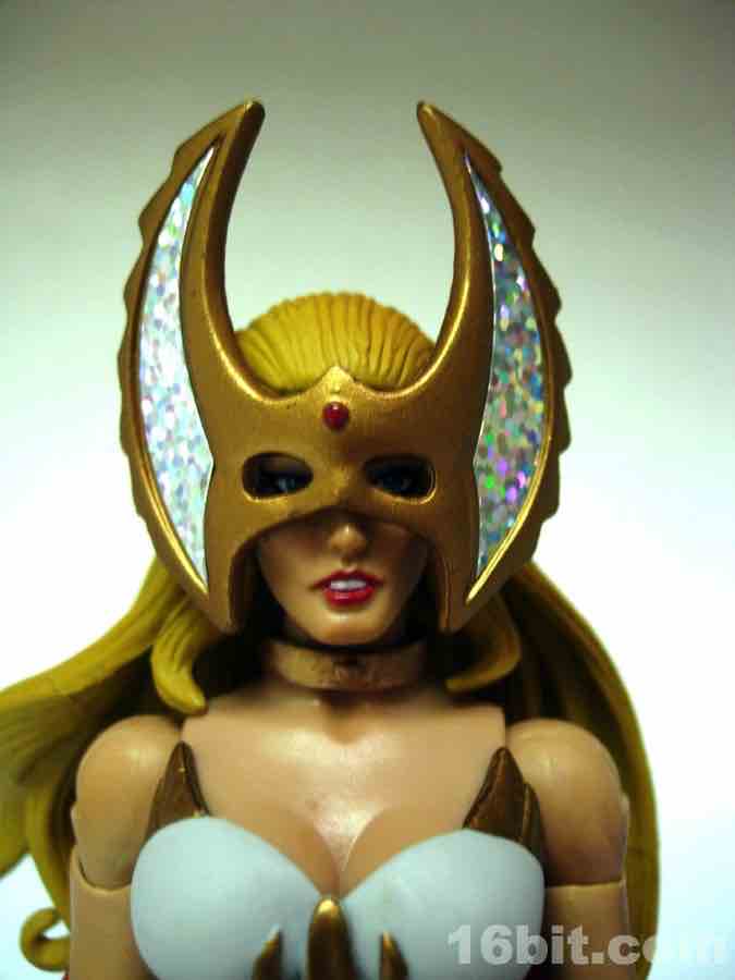 Like most figures with more than one head in this line, the default head is based on the original toy and not the face you may know best from the cartoons. That's why she has a gold collar and holographic sticker nonsense, and this piece is completely removable revealing a giant hole in her forehead. An alternate head with a tiara modeled after the Filmation animated series is also included, and looks way, way better. I admire Mattel going through the work to include both heads, but it's pretty obvious one is better than the other.