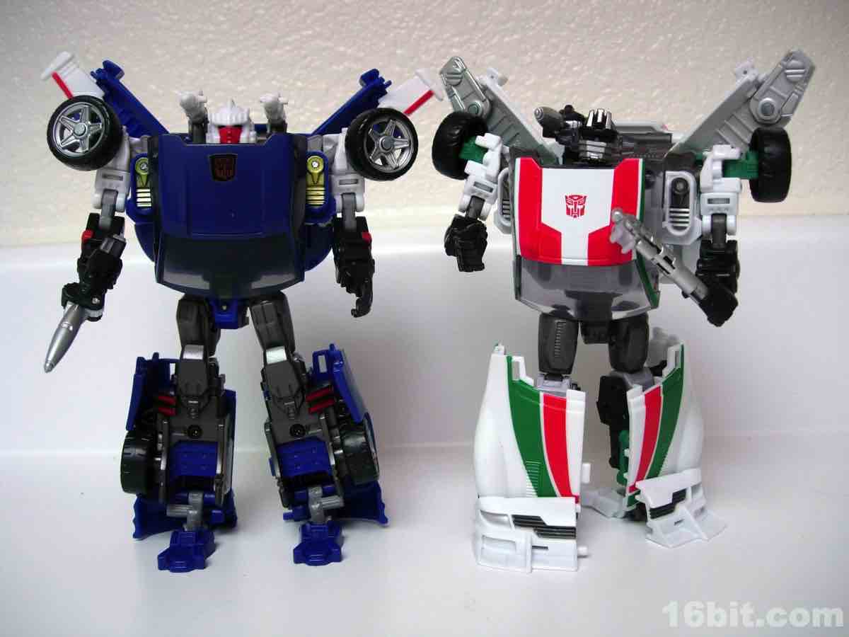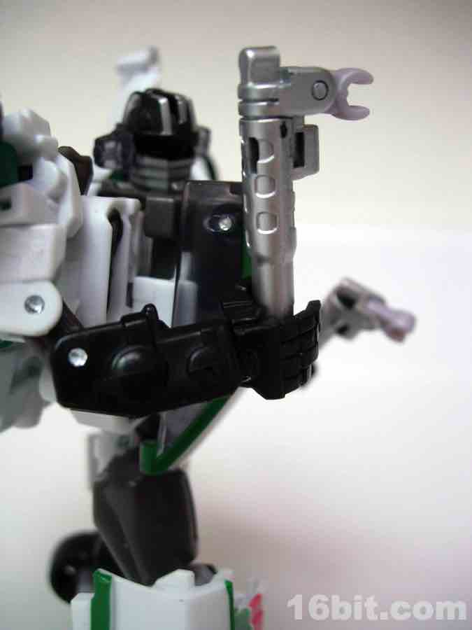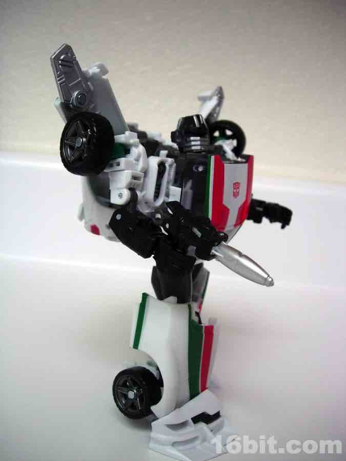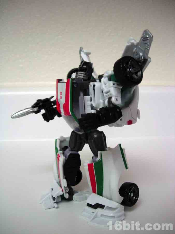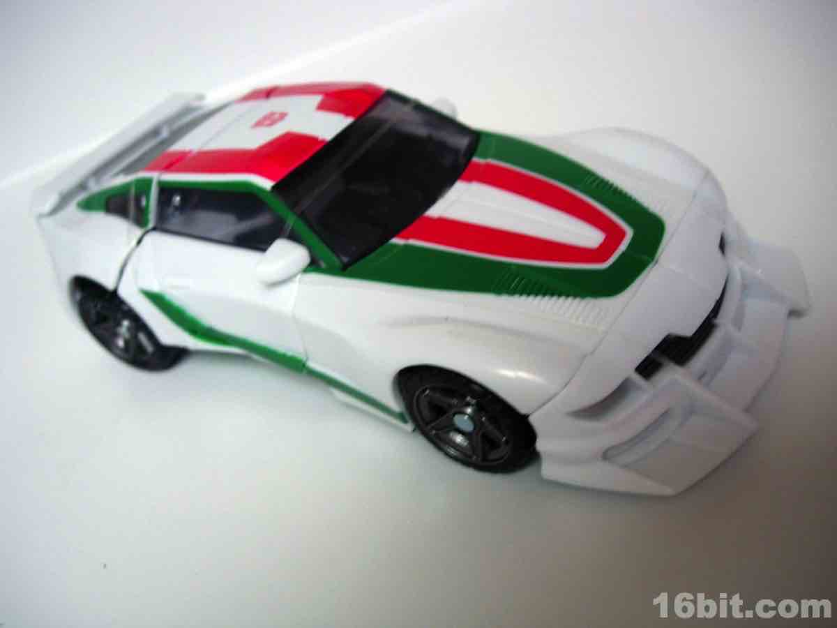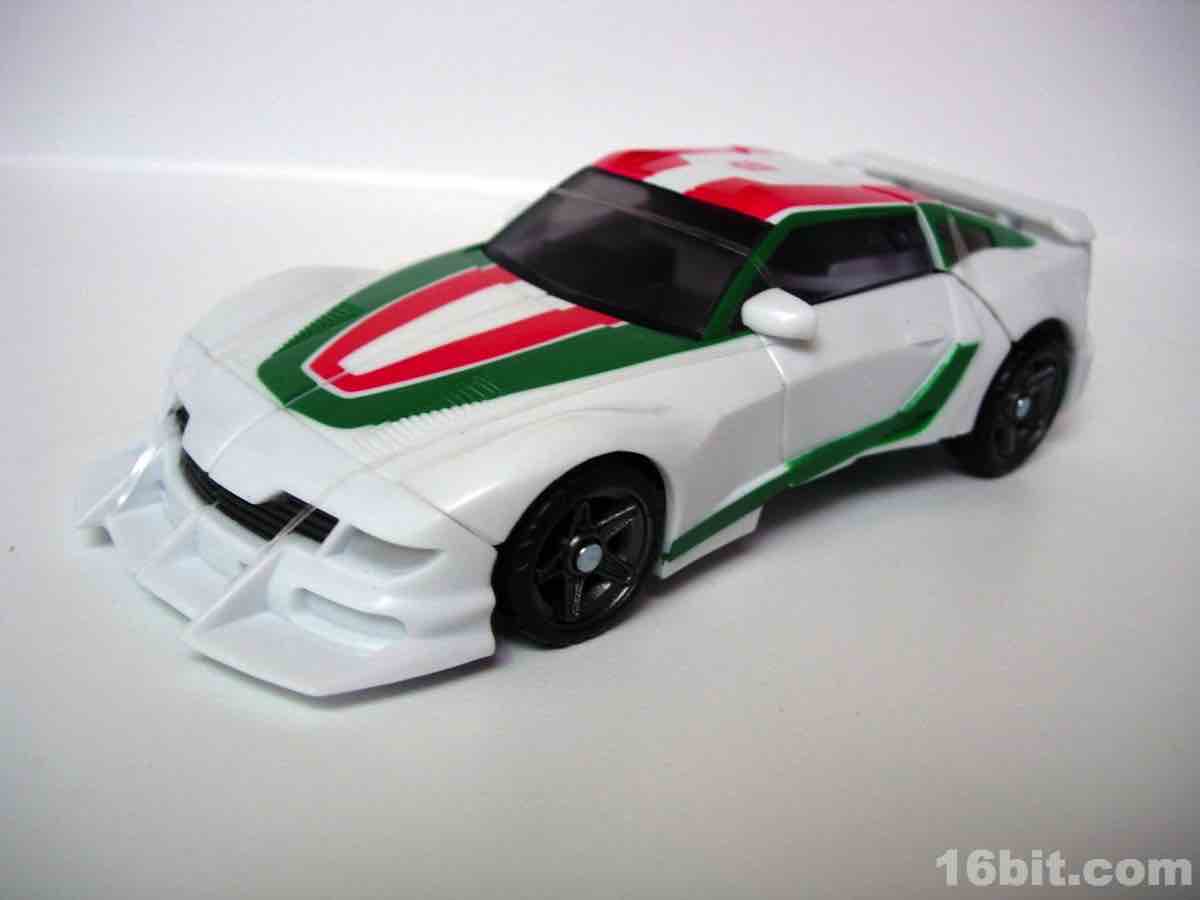 As a toy based on the 2010 Turbo Tracks figure, Hasbro modified the original mold in a few meaningful ways to get two toys from one design. The head, wings, bumper/feet, spoiler, back of the legs, and c-clamp weapons were retooled while pretty much everything else was effectively the same with new deco. Hasbro's quite clever when they want to be. I was particularly surprised to see a place for the tools to clamp onto the legs in robot mode, for storage purposes. That sort of thing is pretty uncommon.