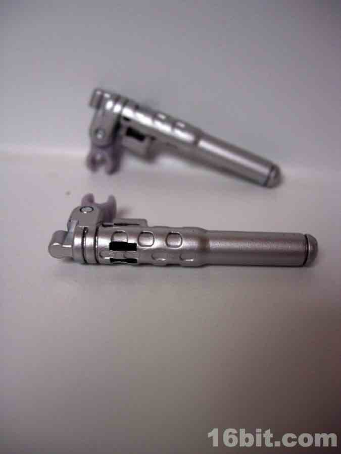The handheld accessories are guns... or exhaust pipes... or tools. What would you like them to be? As Hasbro designed them to be gripped in a specific manner, it seems they were intended to be Wheeljack's tools. (For those not familiar with G1 lore, he was an Auotbot mad scientist, and in the cartoons was responsible for "inventing" the Dinobots.) As such, the accessory is a nice touch-- the original 1984 Wheeljack just had guns, so a non-lethal character-based accessory is a delightful touch. He still has a gun, it's the same shoulder-mounted (or hand-held, take your pick) accessory which you got with Turbo Tracks down to the same paint job.