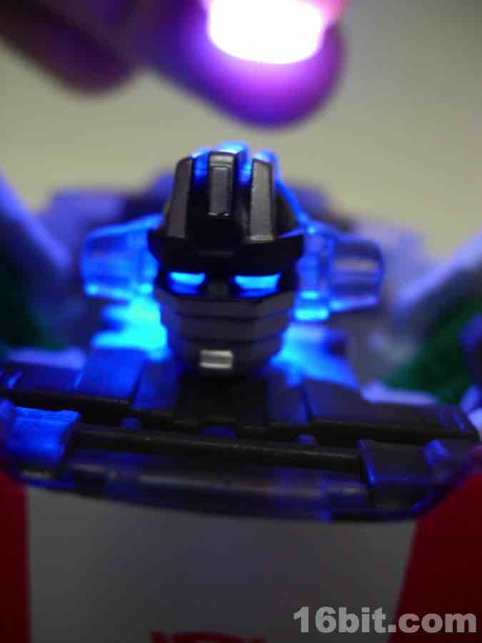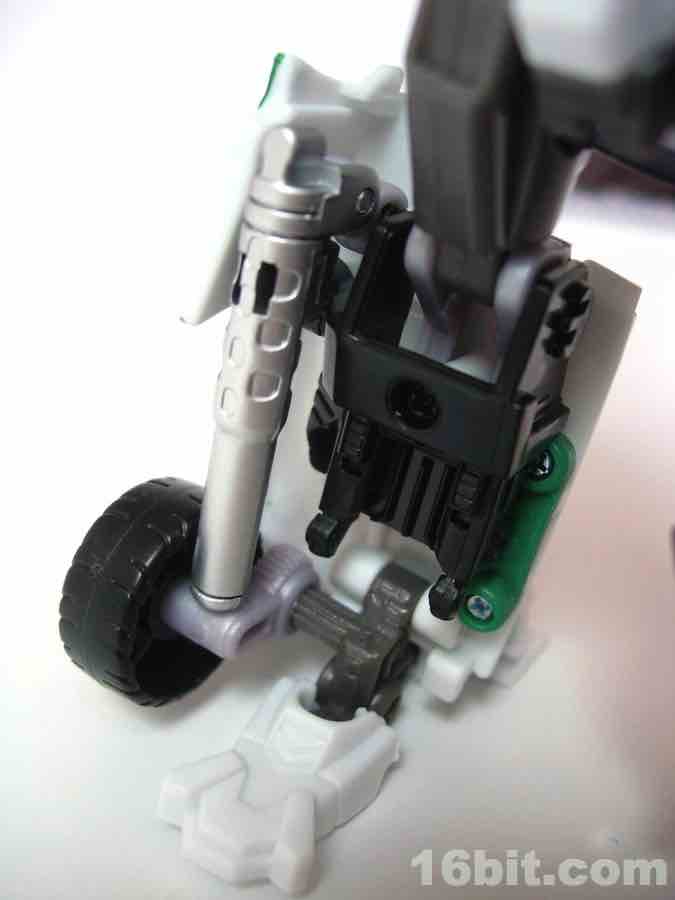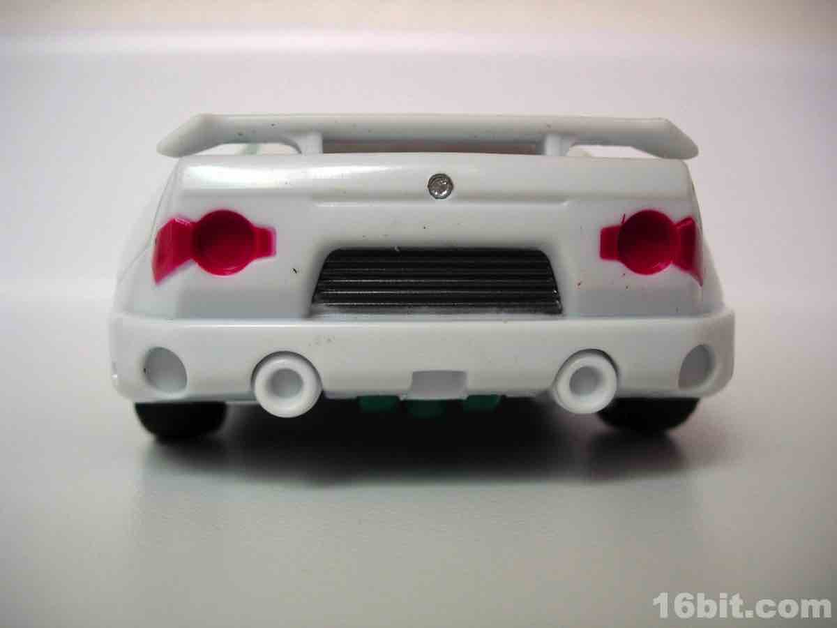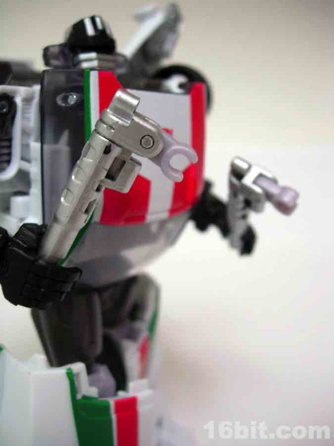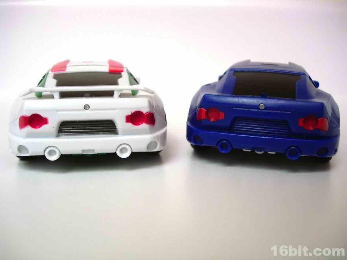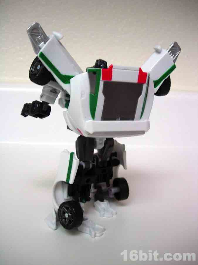 As a car... it's a car. Clearly modified with aftermarket parts, he spent some scratch on a new body kit and seems to be lookin' for action, ladies. It's just a shame there aren't too many lady-bots out there. The gun stores in the trunk area, and the two tools clip under the vehicle for transport. The wheels roll freely, and the design holds together pretty nicely in both modes courtesy of some tabs and slots.