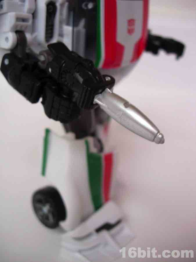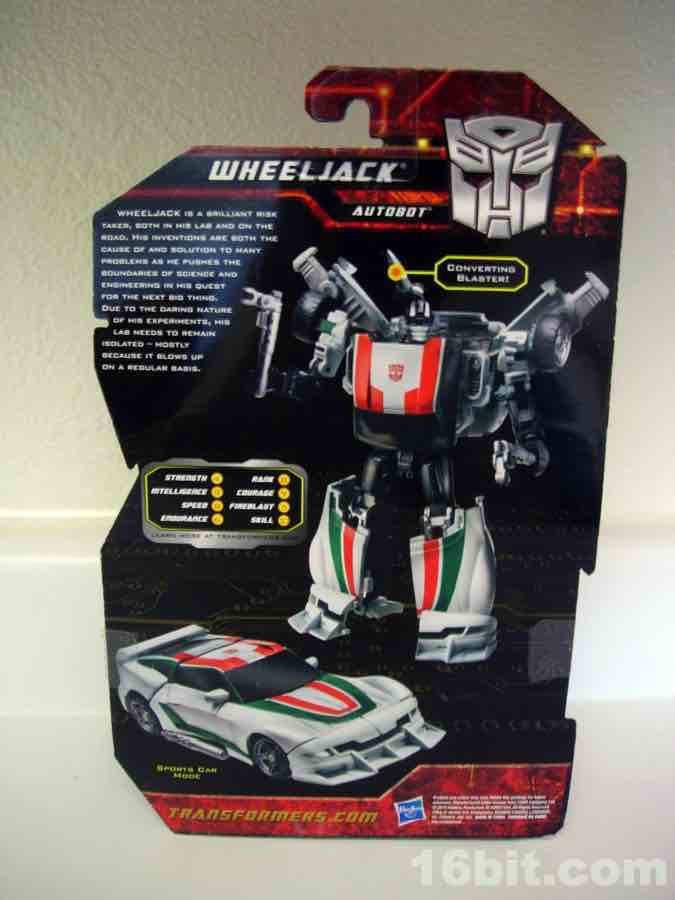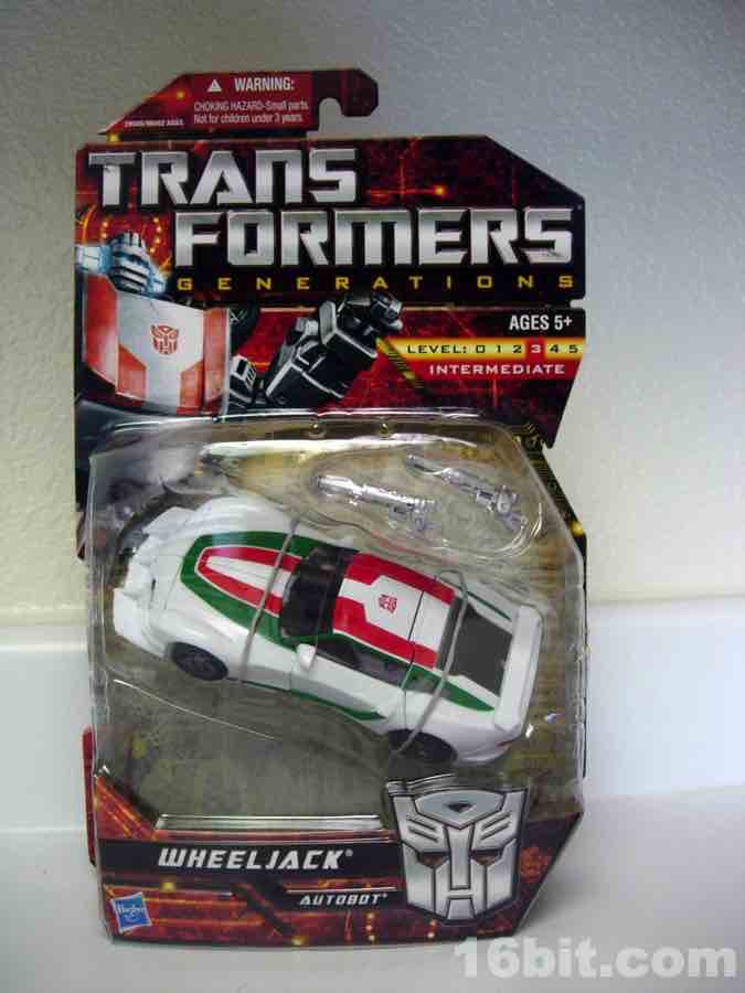 Item No.: Asst. 98452 No. 28595 Manufacturer:Hasbro Includes:Shoulder-mounted cannon, twin tools Action Feature:Turns into racecar Retail:$11.99 Availability: Spring 2011 Other: The first "classic" Wheeljack in the modern line