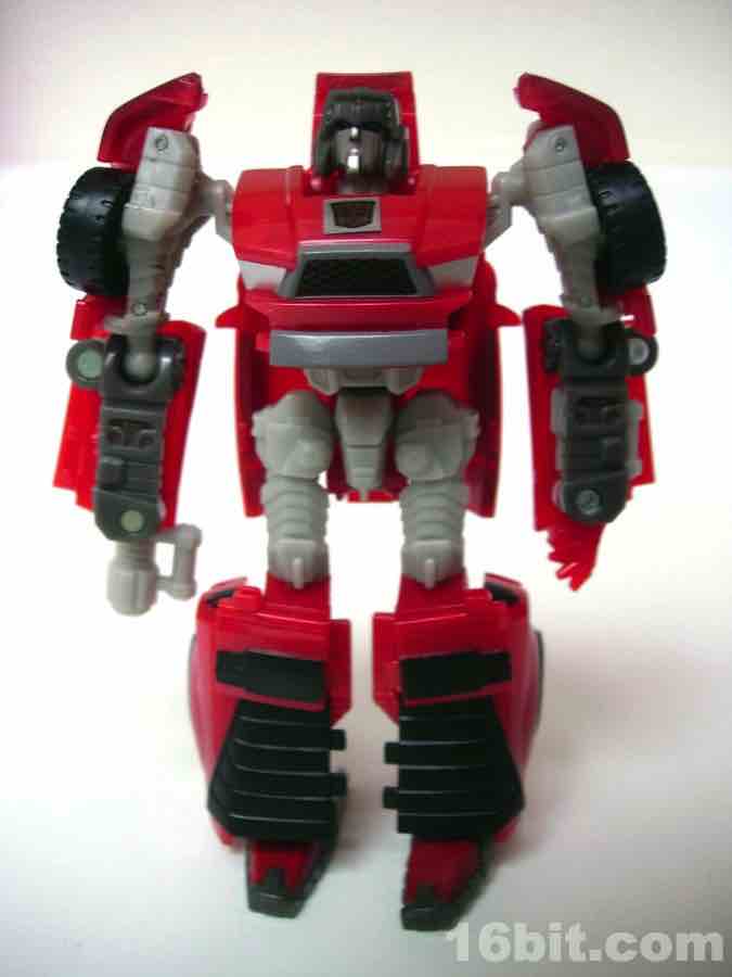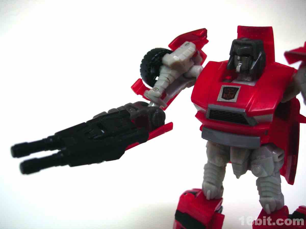 The flip-out fist cannon things are actually a great idea, and should be loads of fun if they repaint the toy in the future. They stand out well (especially better than his red hands), so that's a nice detail. The head is particularly good-- it may remind some slightly of Megatron or Decepticharge, either of which would be swell repaints of this one.