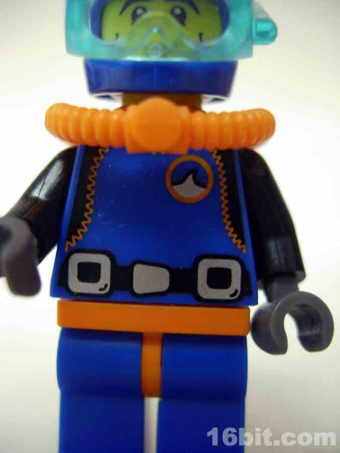 Articulation and quality is exactly what you'd expect from a LEGO figure: it's excellent. If you zoom in on his chest, you can see added detail like orange stitching and a little patch with an ocean wave, plus a belt painted on the figure. His face is a little more wrinkly than others, meaning the guy is either straining with his breath or is old. Take your pick. The figure looks great, with the blue, black, and bright orange bringing him to life nicely.