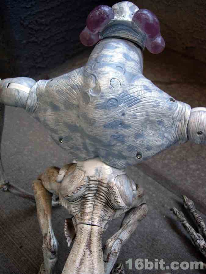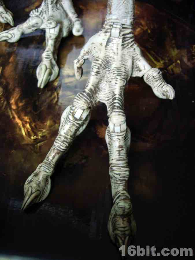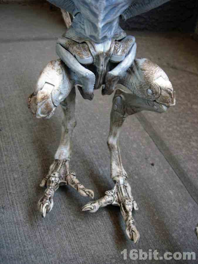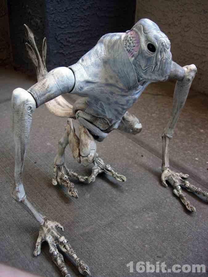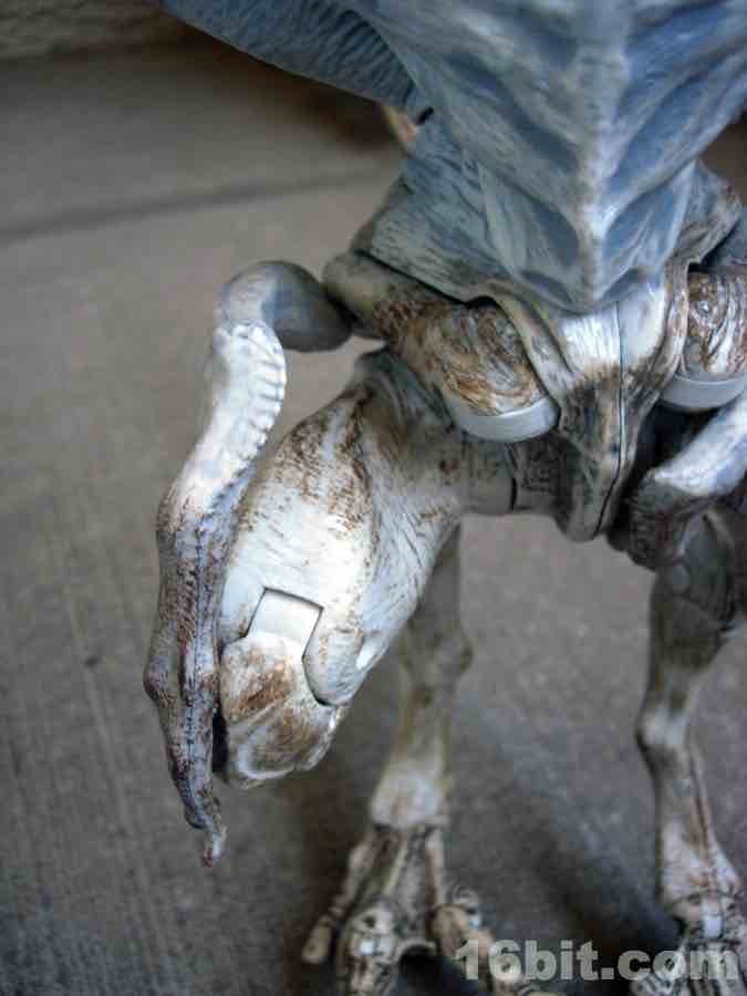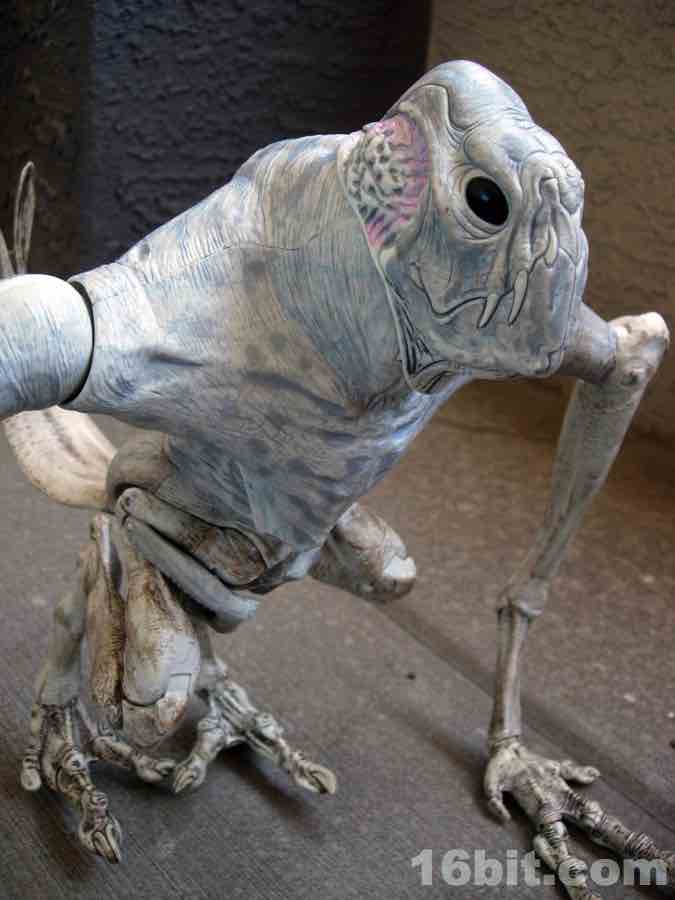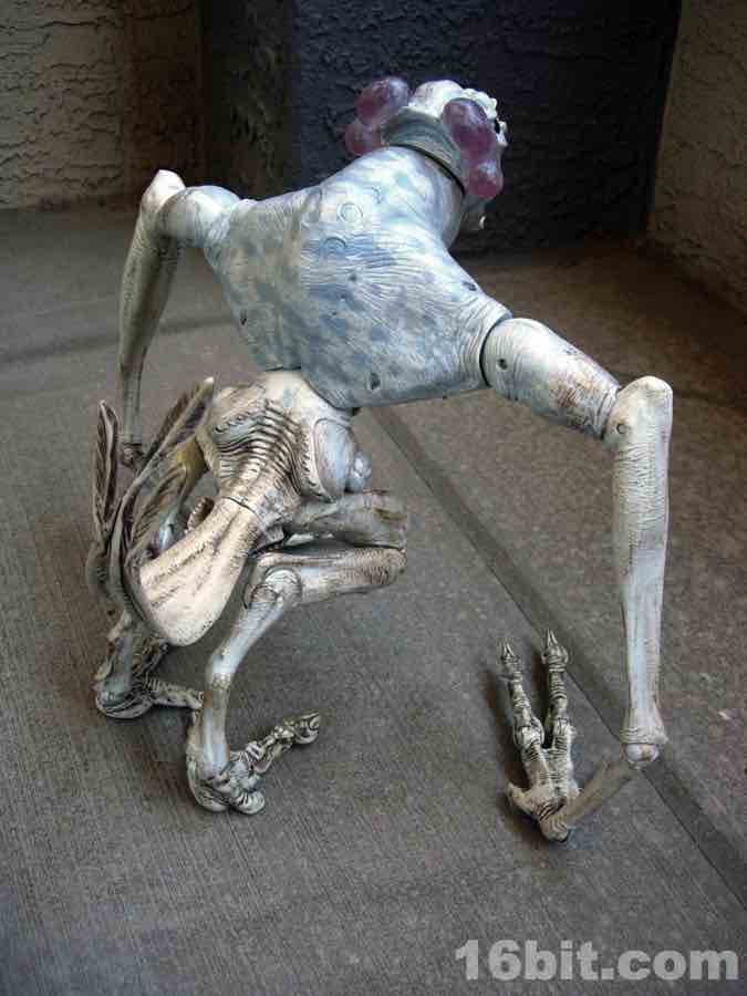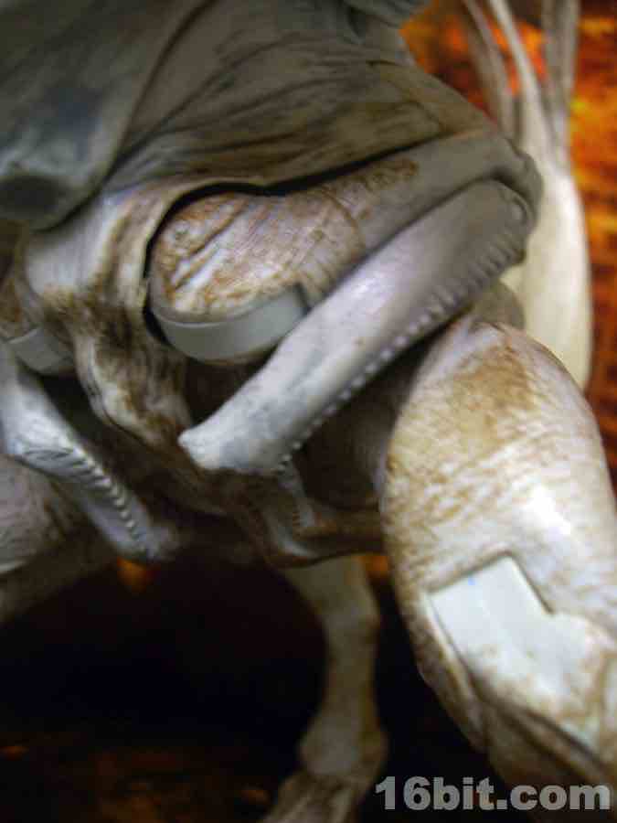 This monster has more articulation than I care to count. On his torso are a couple of smaller arms which are fully jointed and, if I read correctly, designed to be an external part of the digestive system. (They weren't seen in the movie much.) In addition to this, each limb is jointed in several places in addition to the digits. That's right-- not only are the fingers and toes jointed, but they're jointed in multiple places. There's also a tail, plus he has a few extra joints you're going to discover as you futz with him. On the whole this is awesome, but gravity can be a cruel mistress when it comes to displaying the toy. Its weight will, over time, cause him to sag a bit and this may actually cause him to topple over if not leaned or balanced properly.